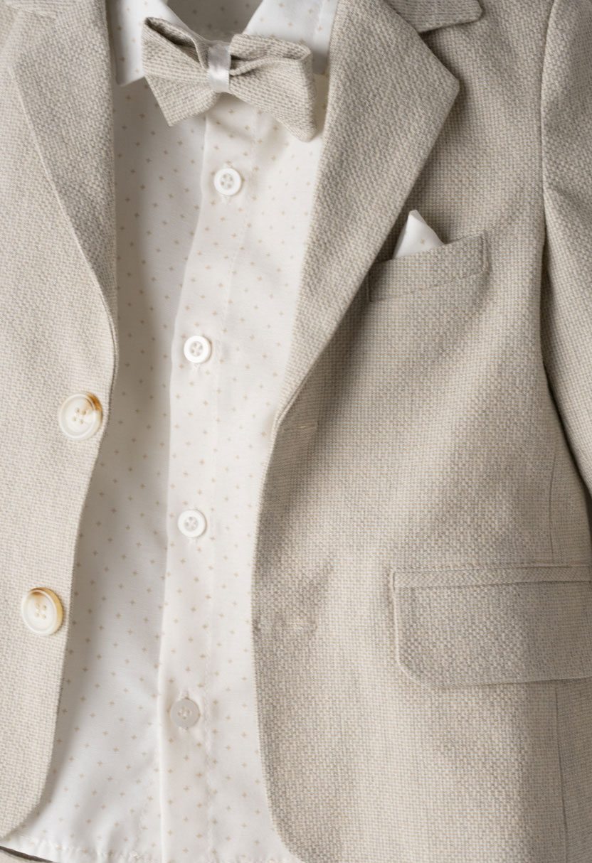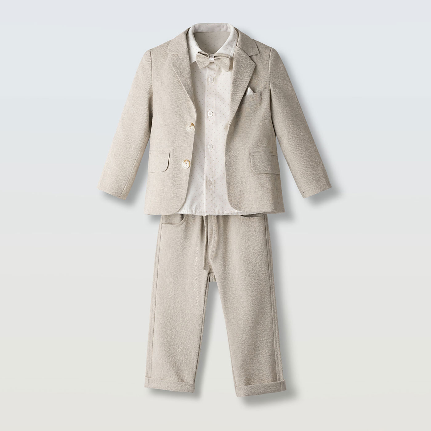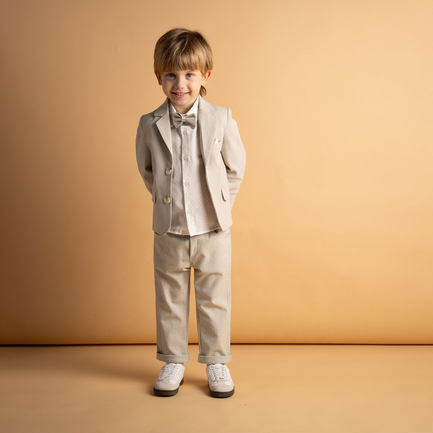 Αναβαθμίστε τις επίσημες εμφανίσεις του μικρού σας με το παιδικό σετ Hashtag 4 τεμαχίων σε εκρού απόχρωση. Ένα ολοκληρωμένο κομψό σύνολο που συνδυάζει σακάκι, πουκάμισο, παντελόνι και παπιγιόν, ιδανικό για γάμους, βαπτίσεις, γιορτές και κάθε ιδιαίτερη περίσταση.Το εκρού σακάκι με κλασικό πέτο και κουμπιά προσφέρει διαχρονική φινέτσα, ενώ το πουκάμισο με διακριτικό σχέδιο προσθέτει κομψή λεπτομέρεια. Το παντελόνι σε άνετη γραμμή με ελαστική μέση εξασφαλίζει σωστή εφαρμογή και ελευθερία κινήσεων. Το παπιγιόν ολοκληρώνει το look χαρίζοντας formal χαρακτήρα.Κατασκευασμένο από ποιοτικά υλικά με προσεγμένη ραφή, το σετ προσφέρει άνεση και στυλ καθ όλη τη διάρκεια της ημέρας.