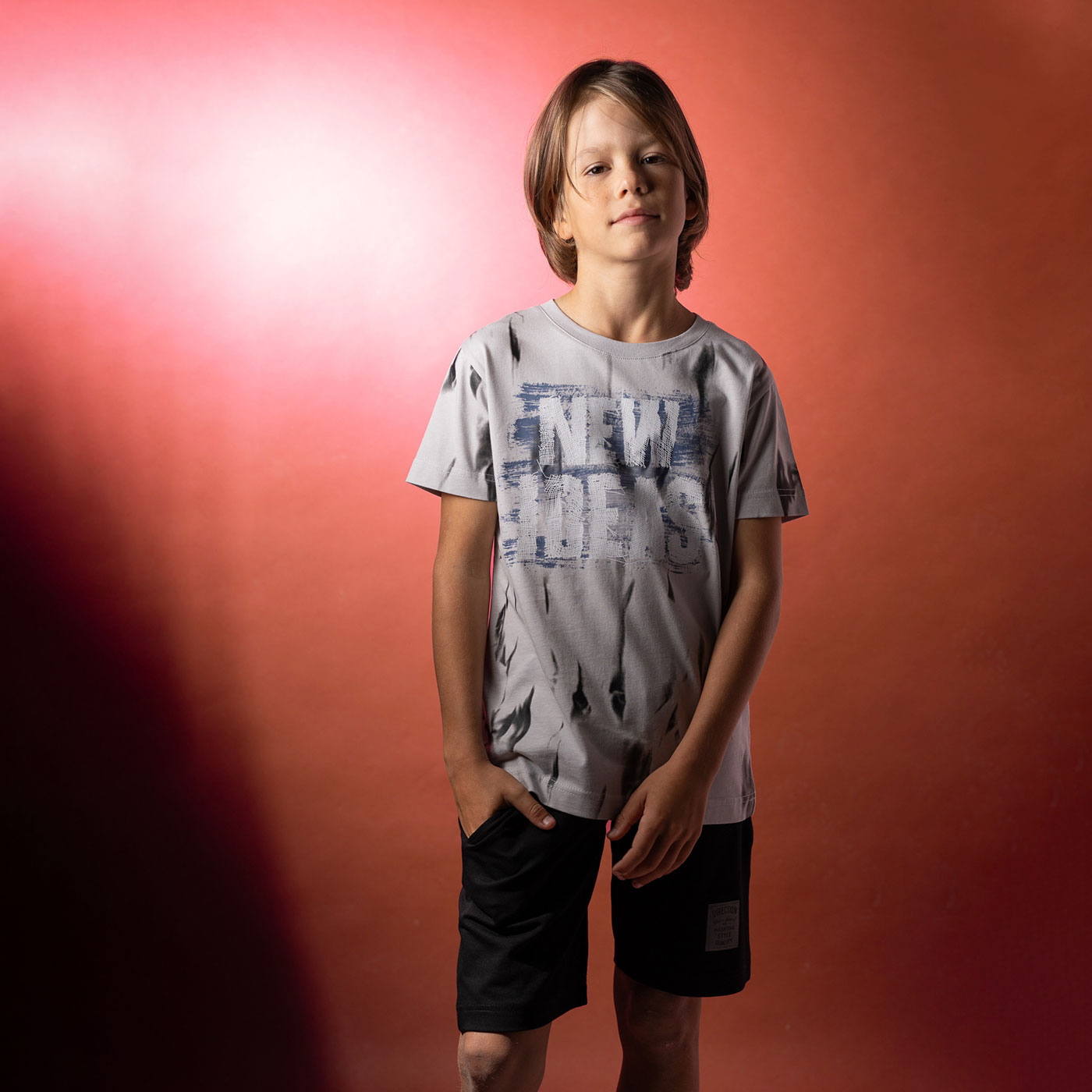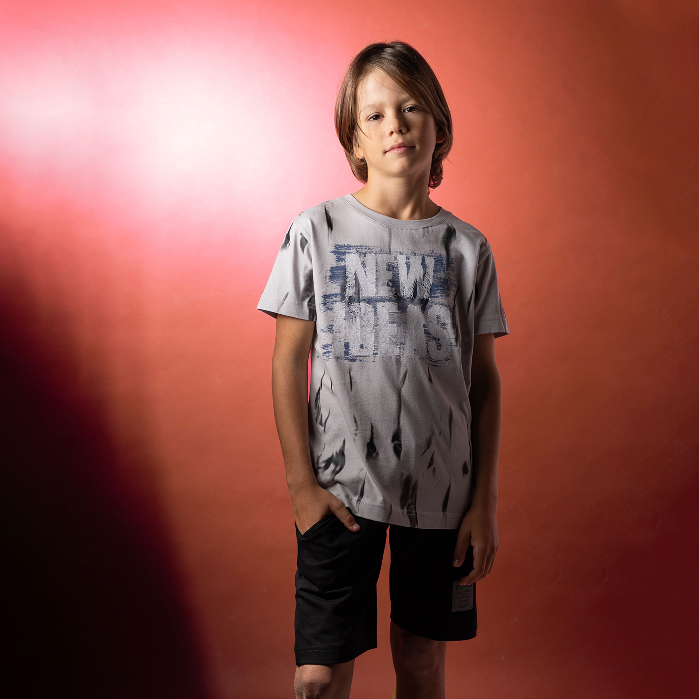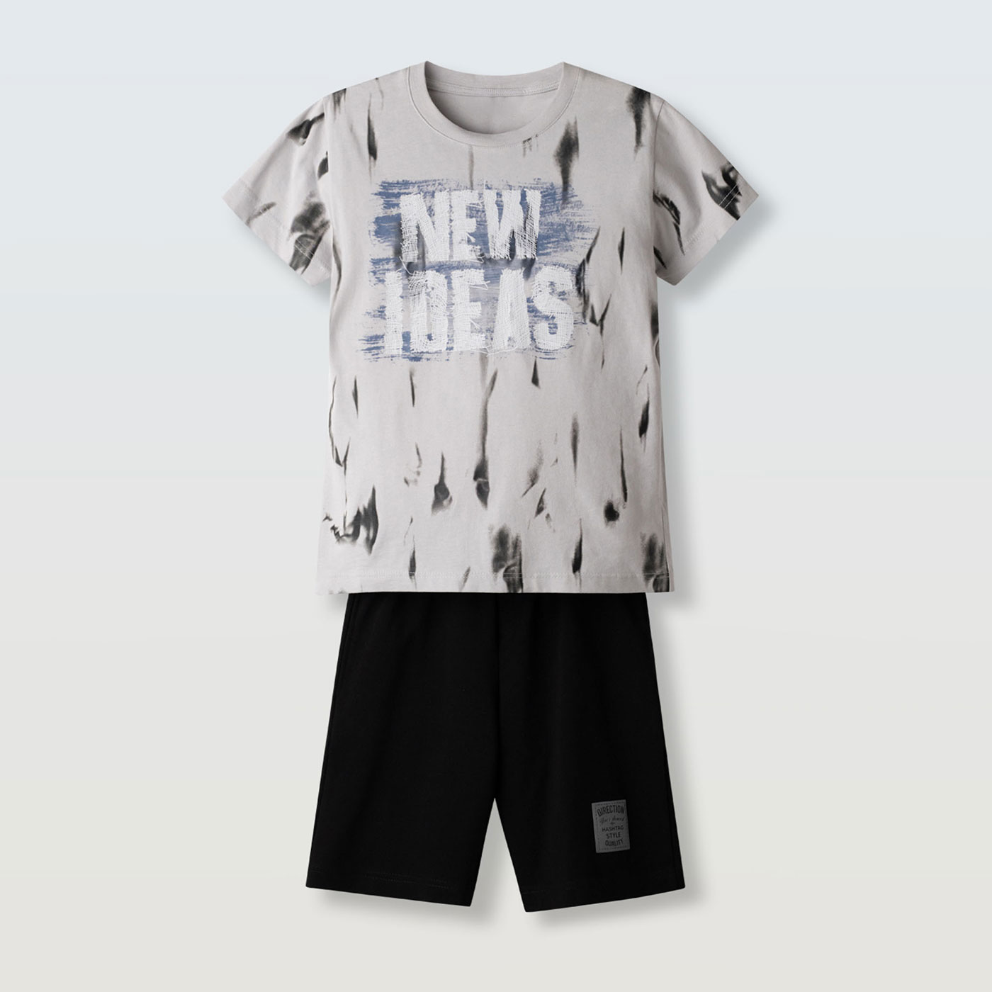 Το παιδικό σετ Hashtag σε γκρι και μαύρο είναι μια δυναμική επιλογή για αγόρια που αγαπούν το μοντέρνο, urban στυλ. Το σύνολο περιλαμβάνει γκρι κοντομάνικη μπλούζα με εντυπωσιακό print NEW IDEAS και διακριτικό tie-dye εφέ, σε συνδυασμό με μαύρη βερμούδα για ισορροπημένο, σύγχρονο look.Η μπλούζα προσφέρει άνετη εφαρμογή και απαλή αίσθηση, ιδανική για καθημερινή χρήση, ενώ η βερμούδα διαθέτει ελαστική μέση για σταθερό και ξεκούραστο κράτημα. Ο συνδυασμός ουδέτερων αποχρώσεων διευκολύνει το styling και ταιριάζει εύκολα με sneakers και καλοκαιρινά αξεσουάρ.Ιδανικό για σχολείο, βόλτες και καλοκαιρινές δραστηριότητες, το σετ αυτό συνδυάζει άνεση, πρακτικότητα και νεανικό χαρακτήρα.