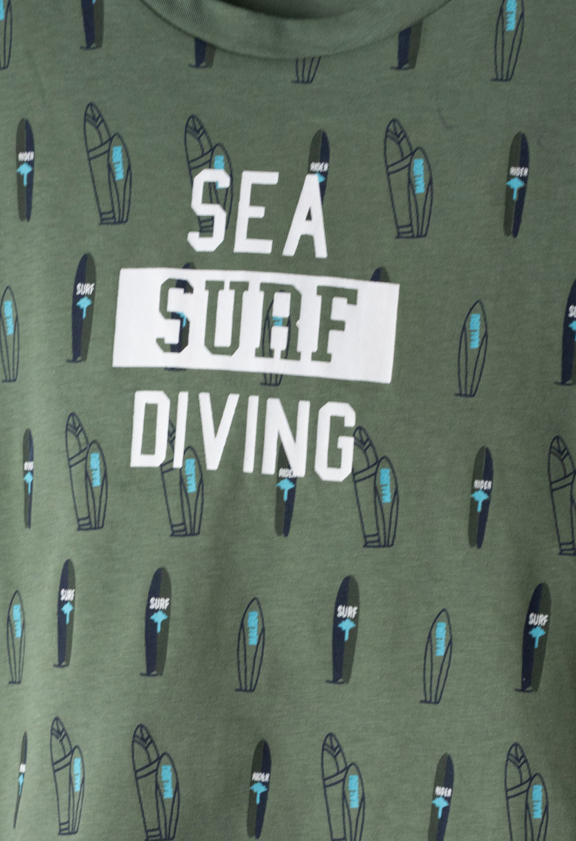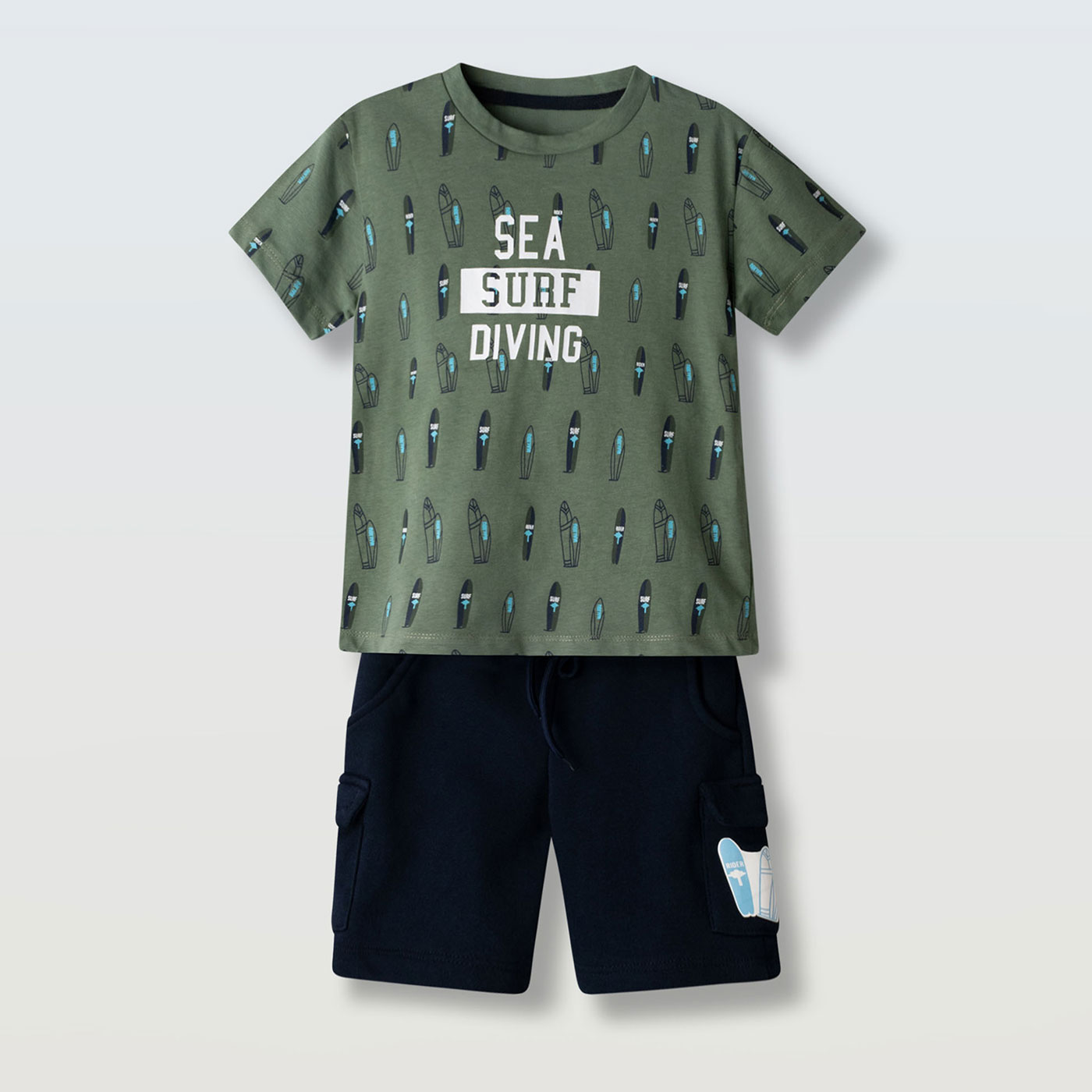 Καλοκαιρινό, άνετο και γεμάτο surf διάθεση, το παιδικό σετ Hashtag με βερμούδα σε χακί μαρέν αποχρώσεις είναι ιδανικό για δραστήρια αγόρια που αγαπούν το σπορ και casual στυλ.Η κοντομάνικη μπλούζα σε χακί χρώμα διαθέτει all-over τύπωμα με σανίδες surf και μοντέρνο λεκτικό print SEA SURF DIVING, χαρίζοντας καλοκαιρινό χαρακτήρα στο σύνολο. Η μαρέν βερμούδα cargo συμπληρώνει ιδανικά το outfit, με πρακτικές πλαϊνές τσέπες και ελαστική μέση με κορδόνι για άνετη και σταθερή εφαρμογή.Ένα ολοκληρωμένο σετ που φοριέται από το σχολείο μέχρι τις καλοκαιρινές βόλτες και τις διακοπές.