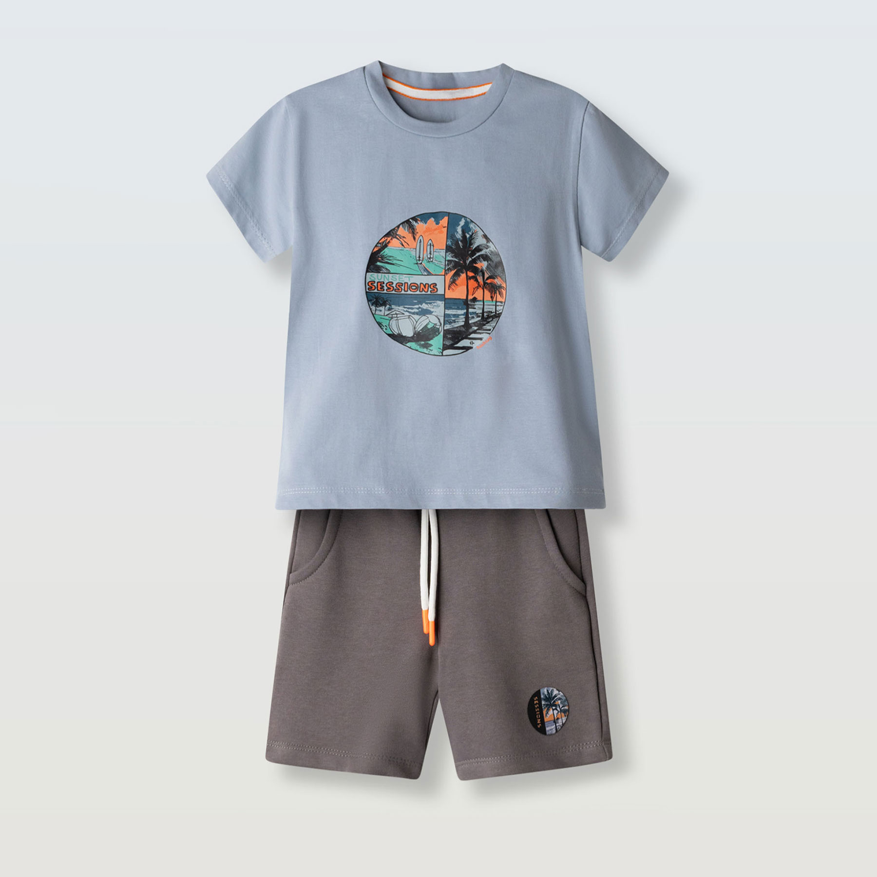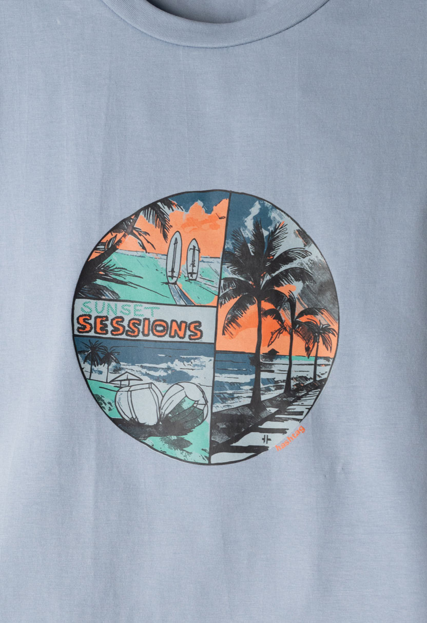Ενα μοντέρνο και άνετο παιδικό σετ για αγόρια από την εταιρεία Hashtag, ιδανικό για καλοκαιρινές εμφανίσεις με στυλ και άνεση. Το σετ αποτελείται από κοντομάνικη μπλούζα σε σιέλ απόχρωση με εντυπωσιακό τύπωμα στο μπροστινό μέρος που απεικονίζει καλοκαιρινό τοπίο και τη φράση Sunset Sessions, δημιουργώντας ένα χαλαρό και καλοκαιρινό look.
