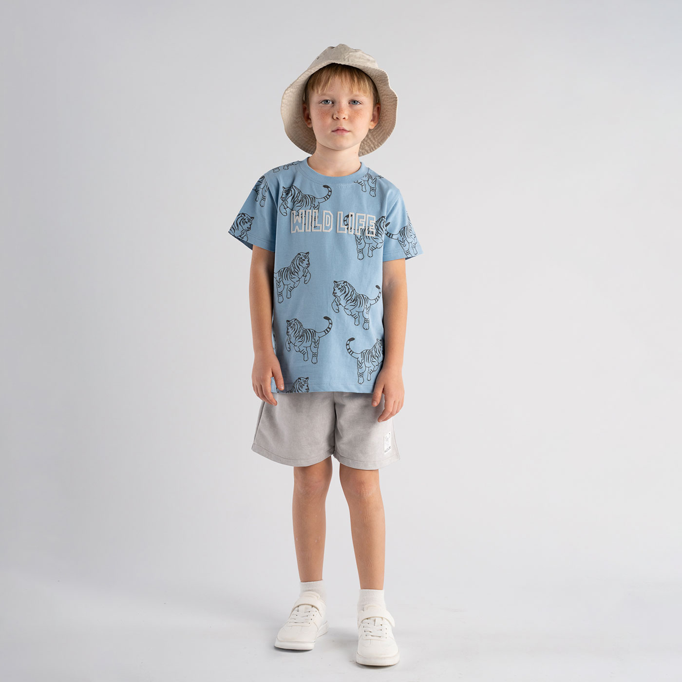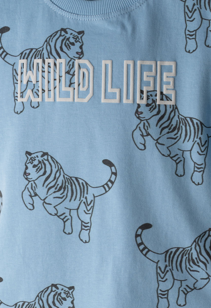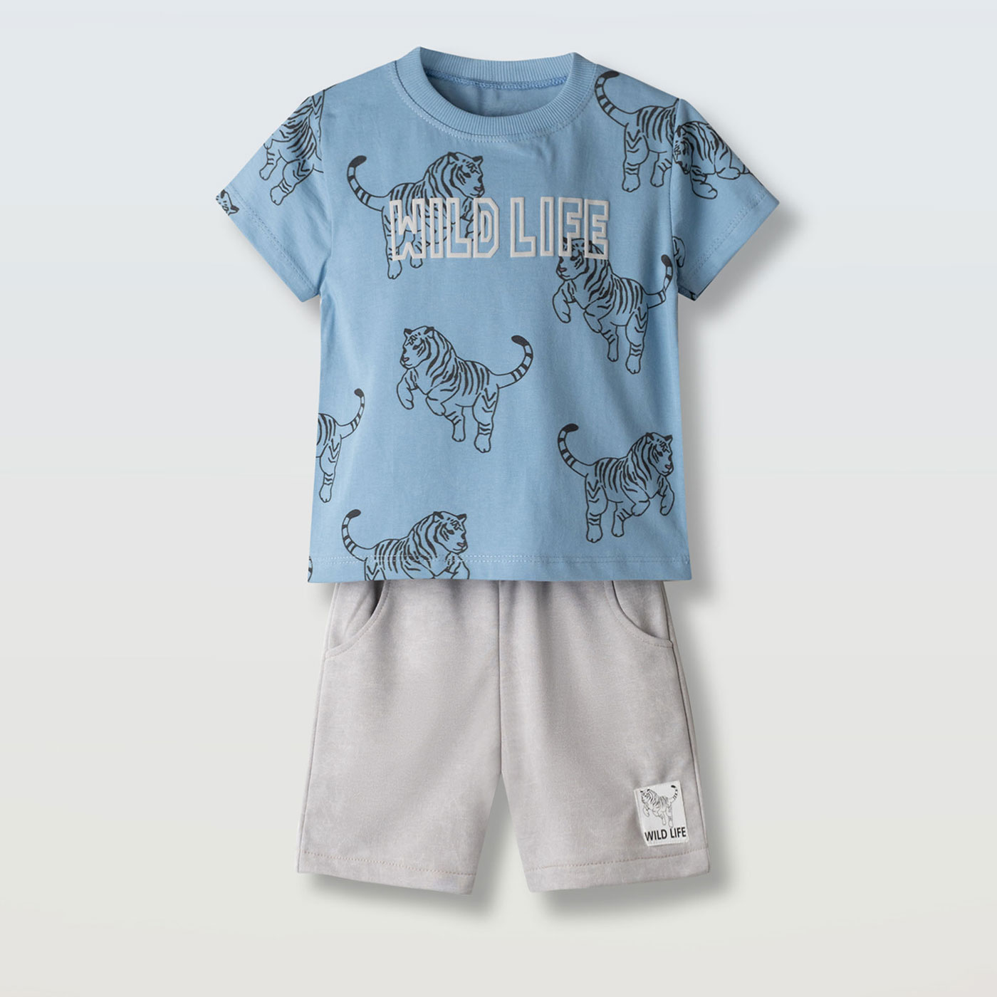 Δροσερό και μοντέρνο παιδικό σετ για αγόρια από τη Hashtag, ιδανικό για τις καλοκαιρινές εμφανίσεις του μικρού σας. Συνδυάζει άνεση, ποιότητα και παιχνιδιάρικο design για καθημερινή χρήση.Το κοντομάνικο t-shirt σε σιέλ απόχρωση ξεχωρίζει με το εντυπωσιακό τύπωμα Wild Life και τα σχέδια με τίγρεις που δίνουν χαρακτήρα και fun διάθεση στο outfit.Η γκρι βερμούδα προσφέρει άνετη εφαρμογή και ελευθερία κινήσεων, κάνοντάς τη ιδανική για παιχνίδι, βόλτες και δραστηριότητες.Κατασκευασμένο από απαλό ύφασμα φιλικό προς το παιδικό δέρμα, αποτελεί πρακτική επιλογή για όλη τη μέρα.