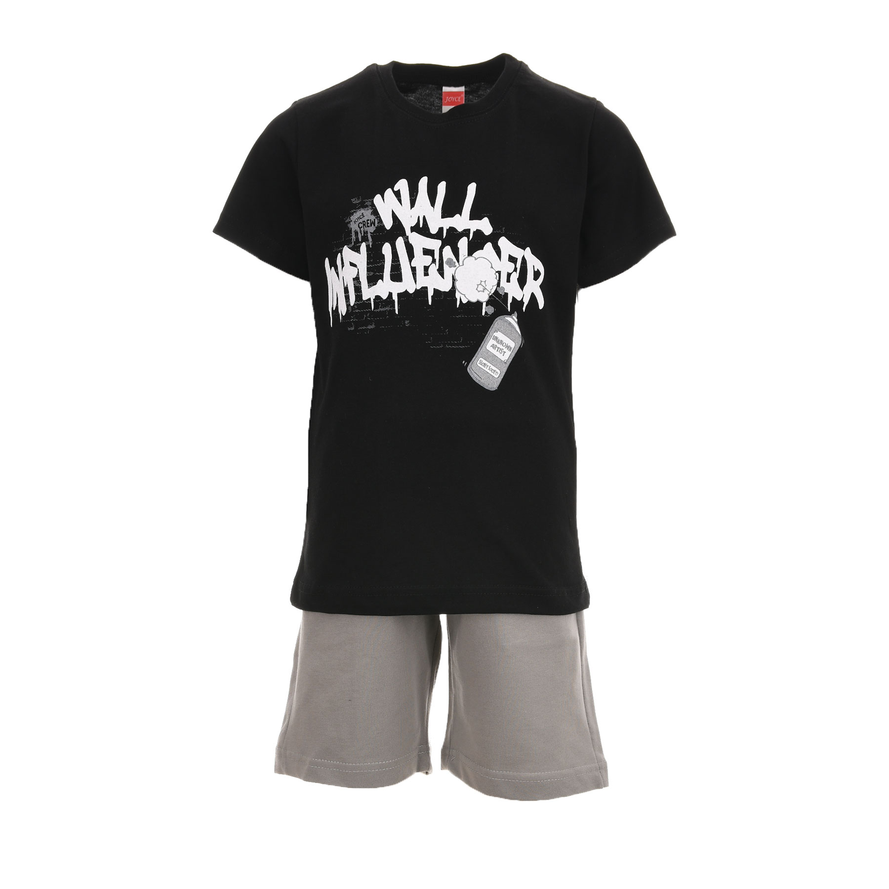 Το παιδικό σετ Joyce σε μαύροέλεφαντ (γκρι) είναι η ιδανική επιλογή για αγόρια που αγαπούν το μοντέρνο streetwear look. Η μαύρη κοντομάνικη μπλούζα με graffiti-style τύπωμα WALL δίνει urban χαρακτήρα, ενώ η βερμούδα σε απόχρωση έλεφαντ προσφέρει άνεση και ευκολία στην κίνηση.Ένα ευκολοφόρετο σετ που συνδυάζει στυλ και πρακτικότητα για κάθε καλοκαιρινή δραστηριότητα.
