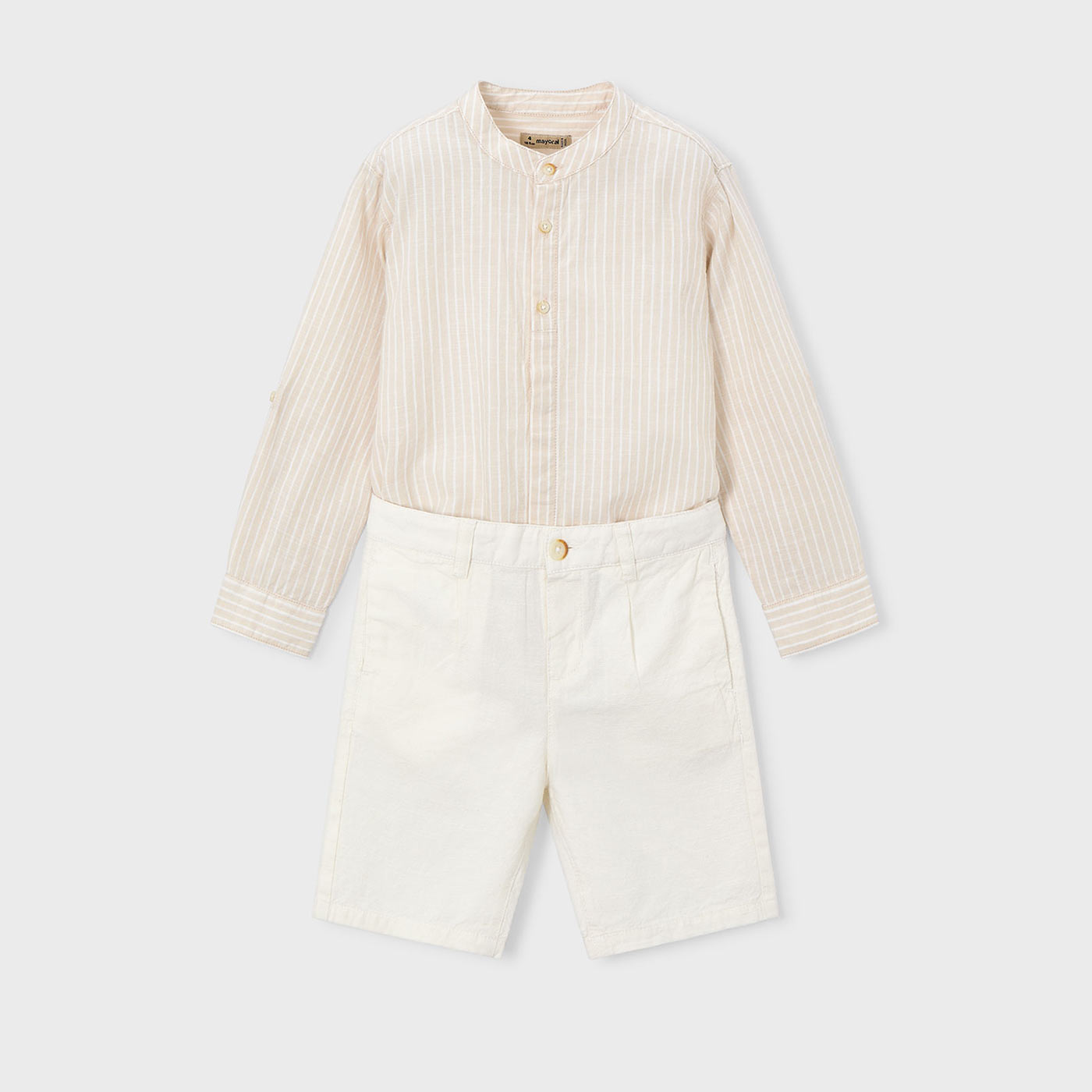 Αναβαθμίστε το καλοκαιρινό στυλ του μικρού σας με αυτό το κομψό παιδικό σετ Mayoral που συνδυάζει άνεση και διαχρονική κομψότητα. Το σετ περιλαμβάνει πουκάμισο μάο ριγέ σε φυσική μπεζ απόχρωση και βερμούδα σε ανοιχτό εκρού, ιδανικό για ξεχωριστές εμφανίσεις από το πρωί έως το βράδυ.