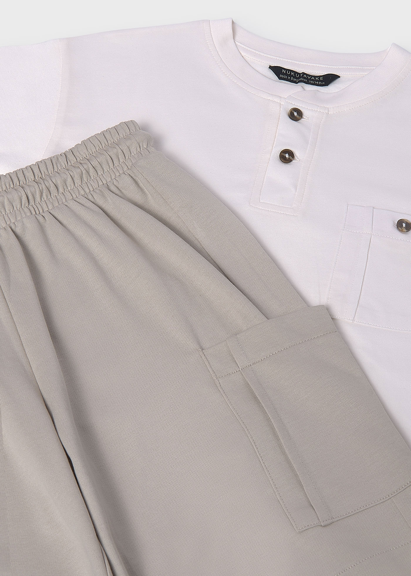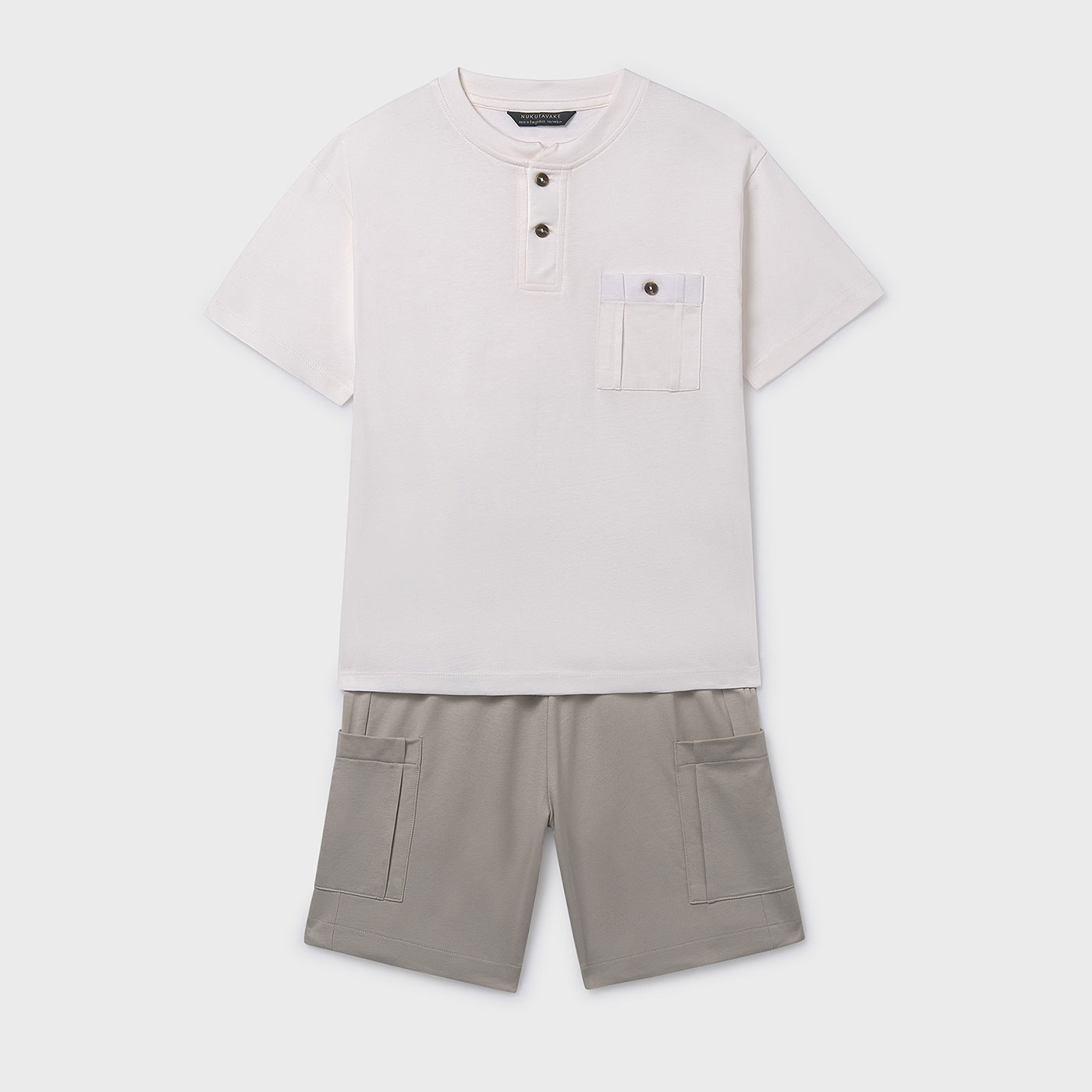Κομψό και άνετο παιδικό σετ Mayoral για αγόρια, ιδανικό για καλοκαιρινές εμφανίσεις με στιλ. Το σετ αποτελείται από μακό κοντομάνικη μπλούζα σε εκρού απόχρωση και βερούδα μπεζ με πρακτικές cargo τσέπες, δημιουργώντας ένα σύνολο που συνδυάζει minimal αισθητική και λειτουργικότητα.Η μπλούζα διαθέτει διακριτικά κουμπιά στο λαιμό και τσεπάκι στο στήθος για μοντέρνα πινελιά, ενώ η βερμούδα έχει άνετη γραμμή και ελαστική μέση για σταθερή εφαρμογή όλη μέρα.Ιδανική επιλογή για βόλτες, εκδηλώσεις ή καθημερινό ντύσιμο με προσεγμένο ύφος.