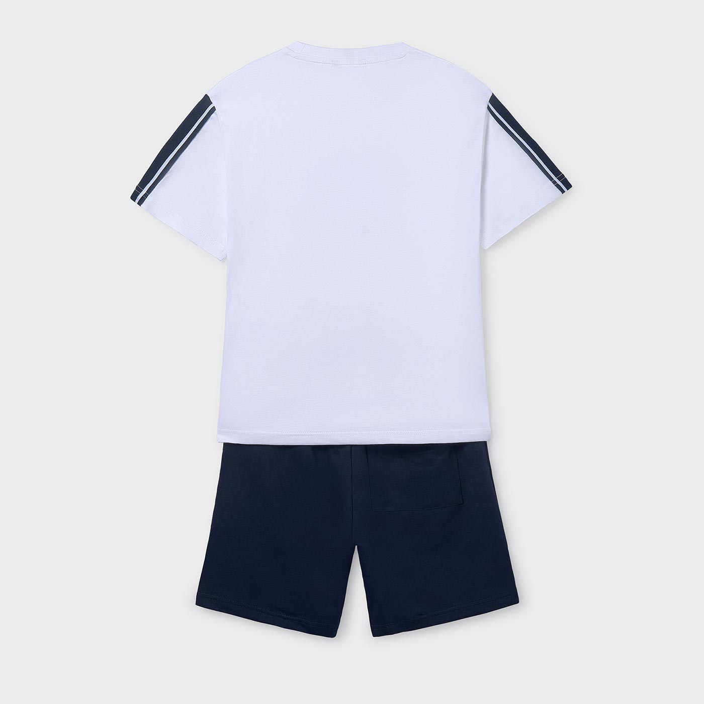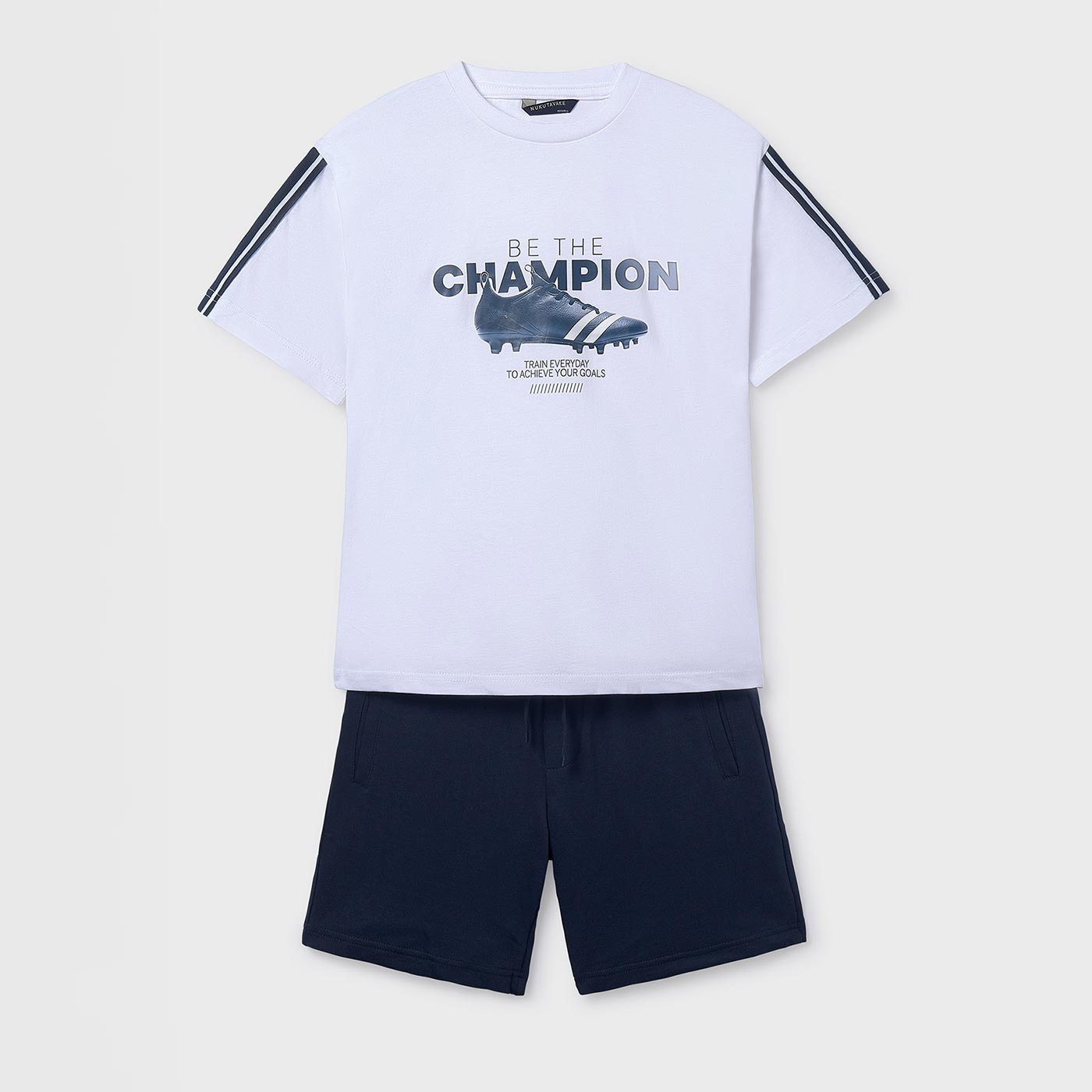 Το παιδικό σετ Mayoral για αγόρια σε κομψό συνδυασμό λευκού και μαρέν είναι ιδανικό για άνετες και στιλάτες καθημερινές εμφανίσεις. Αποτελείται από κοντομάνικη μακό μπλούζα και σορτς, προσφέροντας πρακτικότητα και ελευθερία κινήσεων για κάθε δραστηριότητα.Η μπλούζα σε λευκό χρώμα διαθέτει εντυπωσιακό τύπωμα με μήνυμα Be the Champion και σχέδιο αθλητικού παπουτσιού, που χαρίζει sporty χαρακτήρα και δυναμικό στυλ. Οι διακριτικές ρίγες στα μανίκια προσθέτουν μοντέρνα πινελιά. Το σορτς σε μαρέν απόχρωση έχει ελαστική μέση με κορδόνι ρύθμισης, εξασφαλίζοντας άνετη και σωστή εφαρμογή.Κατασκευασμένο από μαλακό βαμβακερό μακό ύφασμα, είναι φιλικό προς το παιδικό δέρμα και ιδανικό για καλοκαιρινές μέρες, βόλτες, παιχνίδι ή διακοπές.