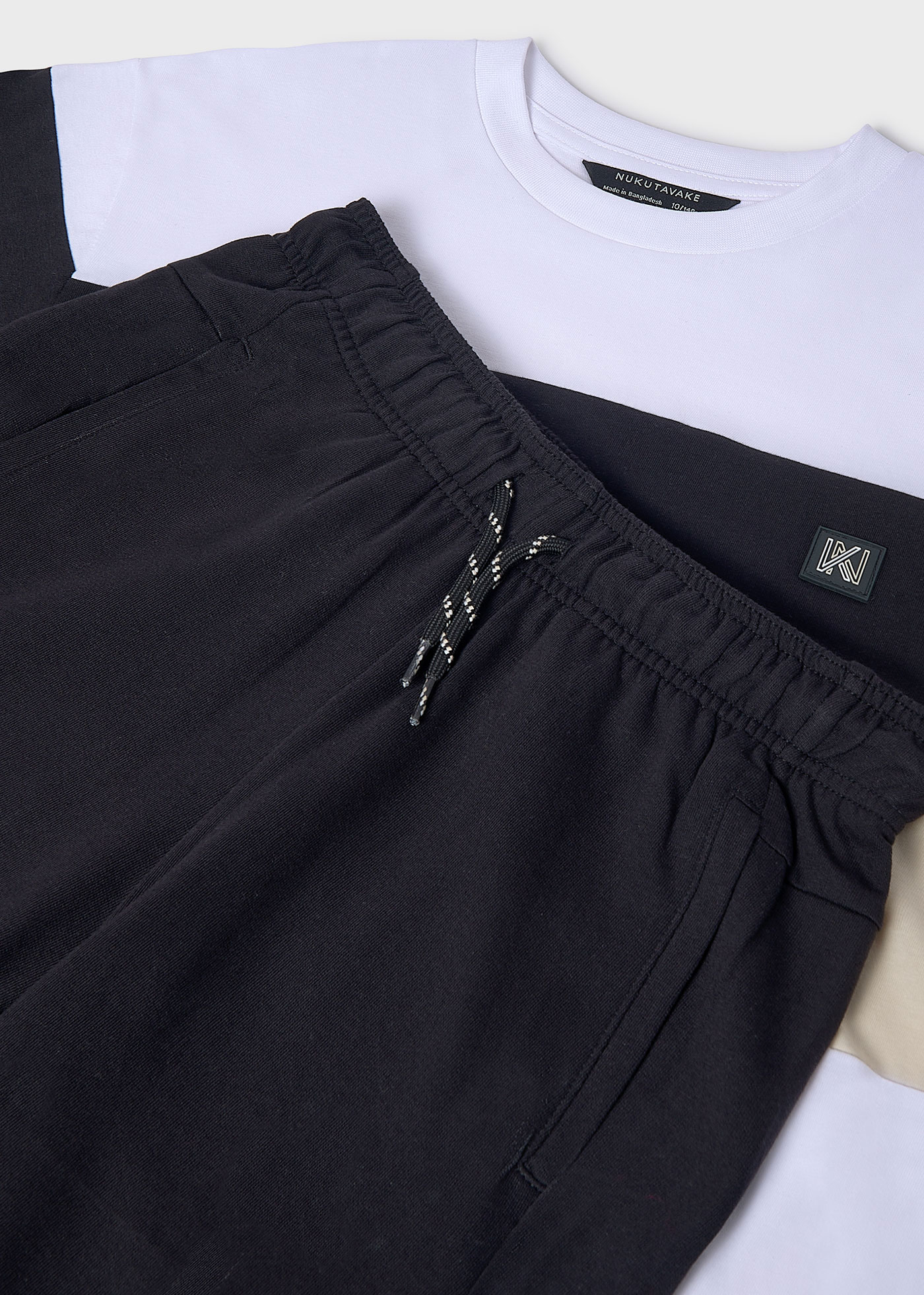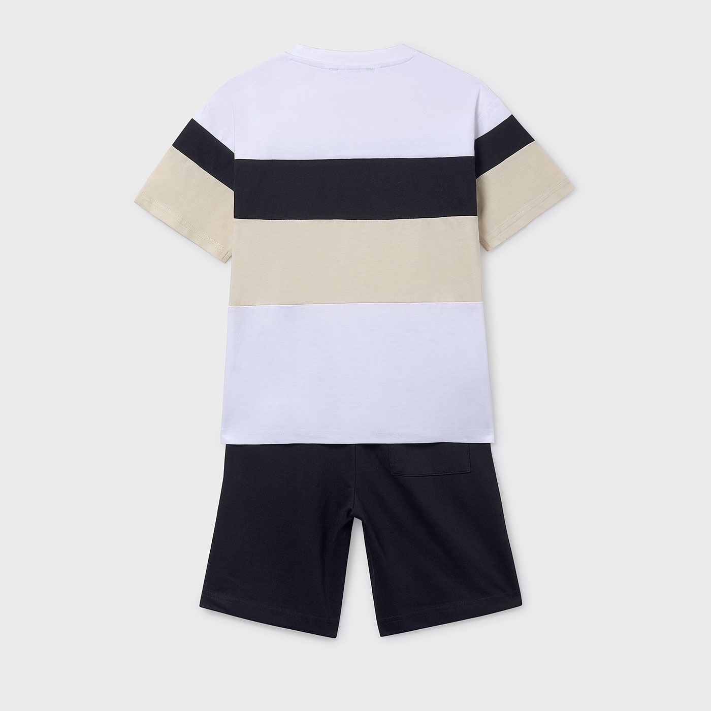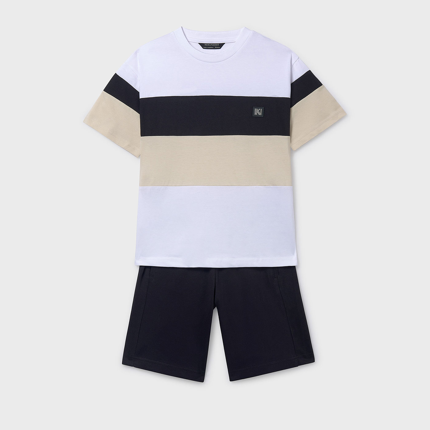 ʼνεση και μοντέρνο στυλ συνδυάζονται στο παιδικό μακό σετ Mayoral για αγόρια, ιδανικό για τις καθημερινές δραστηριότητες του παιδιού. Το σετ περιλαμβάνει κοντομάνικη μπλούζα με color block σχέδιο σε λευκό, μαύρο και μπεζ τόνους και μονόχρωμη βερμούδα σε σκούρο χρώμα, δημιουργώντας ένα ολοκληρωμένο casual σύνολο.