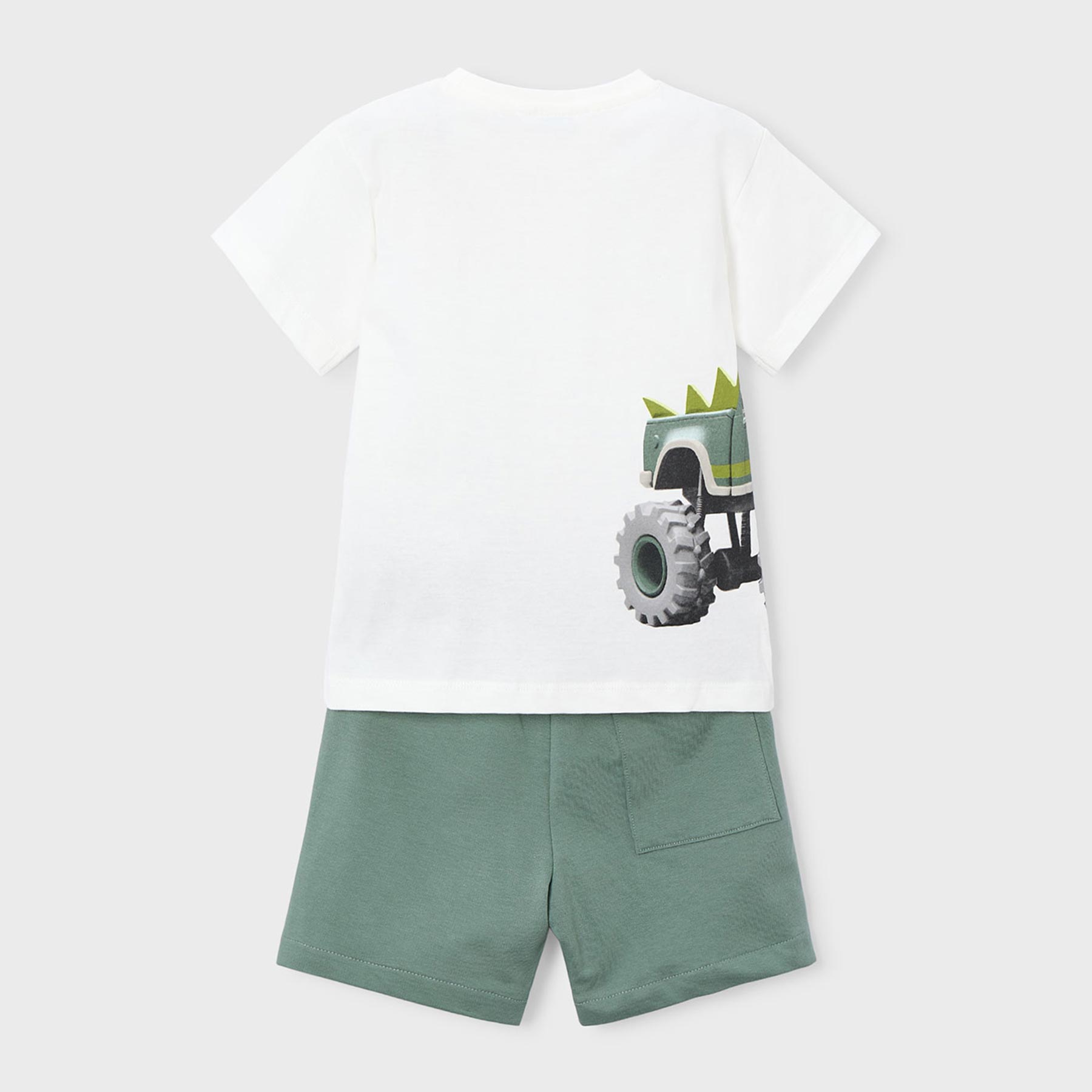 Το παιδικό σετ για αγόρια Mayoral σε αποχρώσεις λευκό και μέντα αποτελεί μια άνετη και στιλάτη επιλογή για τις καθημερινές εμφανίσεις των μικρών αγοριών. Περιλαμβάνει κοντομάνικη μπλούζα με εντυπωσιακό τύπωμα monster truck και μακό σορτσάκι σε μοντέρνο χρώμα μέντας, δημιουργώντας ένα ολοκληρωμένο καλοκαιρινό outfit.Η μπλούζα είναι κατασκευασμένη από απαλό βαμβακερό μακό ύφασμα, φιλικό προς το παιδικό δέρμα, με παιχνιδιάρικο σχέδιο που ξεχωρίζει και τραβά το ενδιαφέρον. Το σορτσάκι διαθέτει ελαστική μέση με κορδόνι, προσφέροντας άψογη εφαρμογή και ελευθερία κινήσεων για παιχνίδι και δραστηριότητες όλη μέρα.Ιδανικό για βόλτες, διακοπές, παιδικό σταθμό ή καθημερινή χρήση, το σετ συνδυάζει άνεση, ποιότητα και μοντέρνο design, όπως μόνο η Mayoral γνωρίζει.