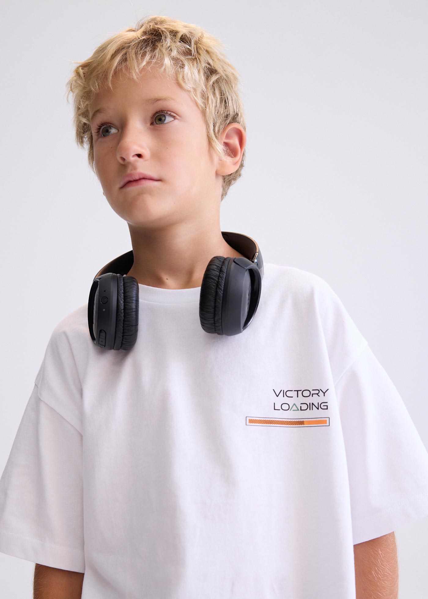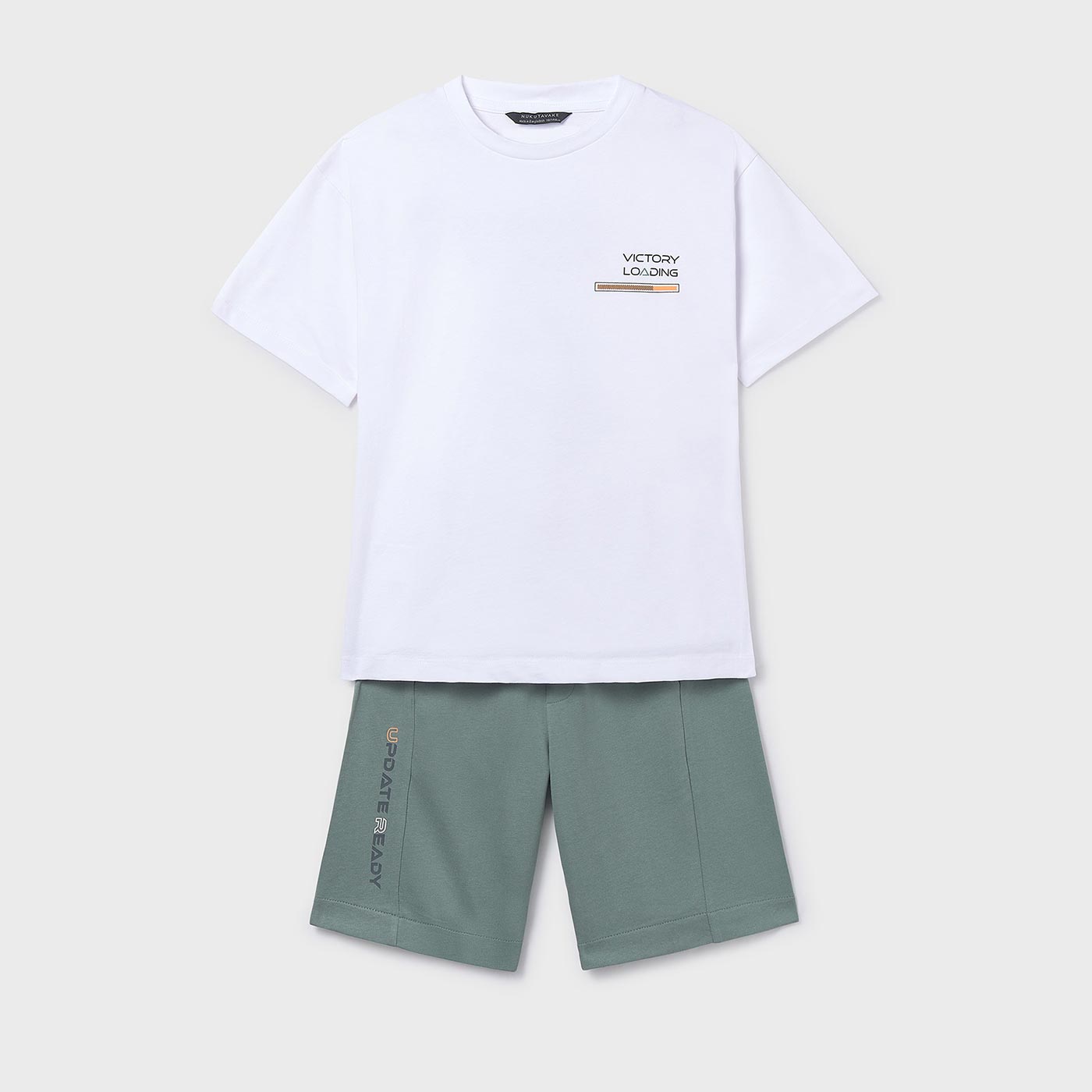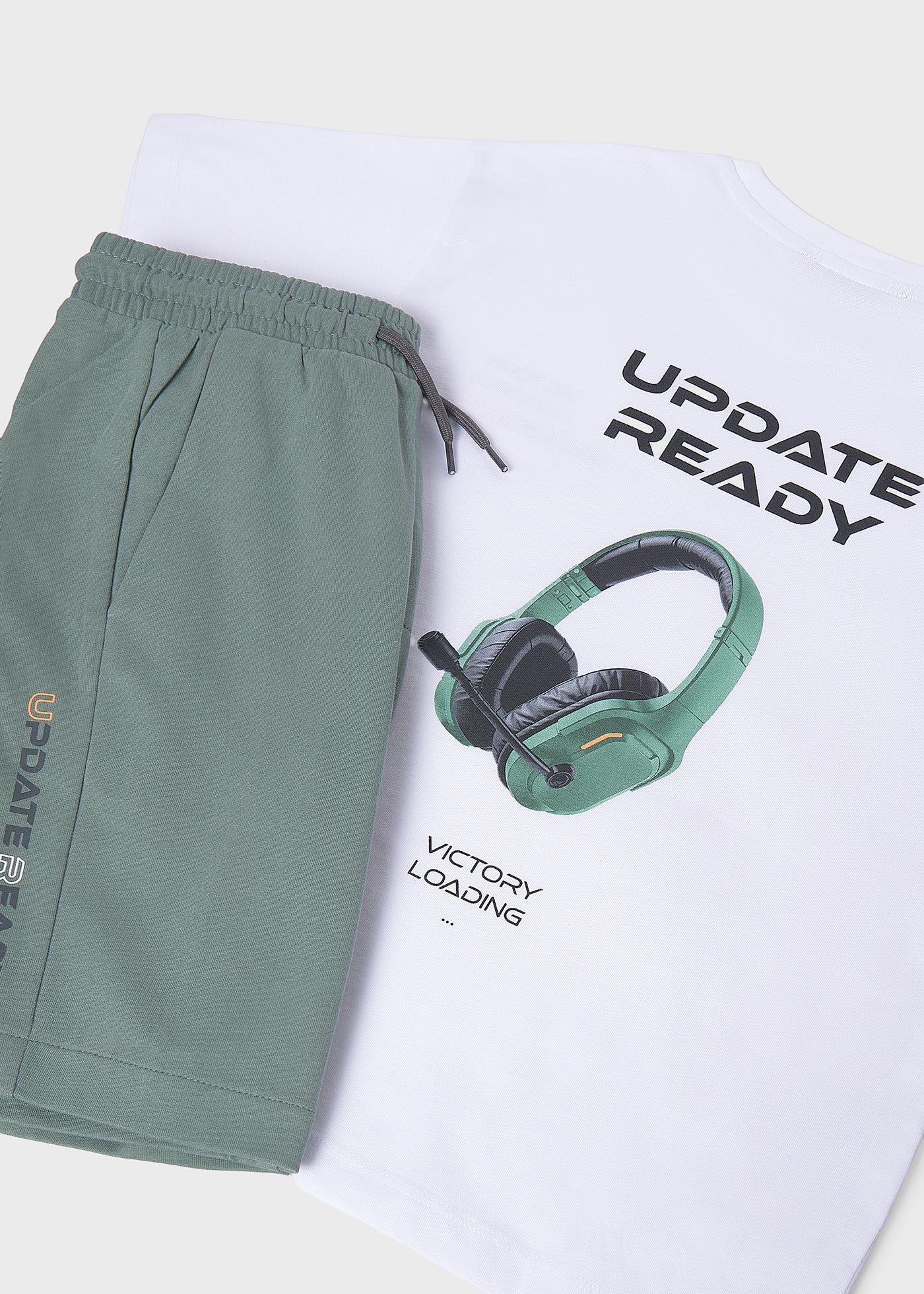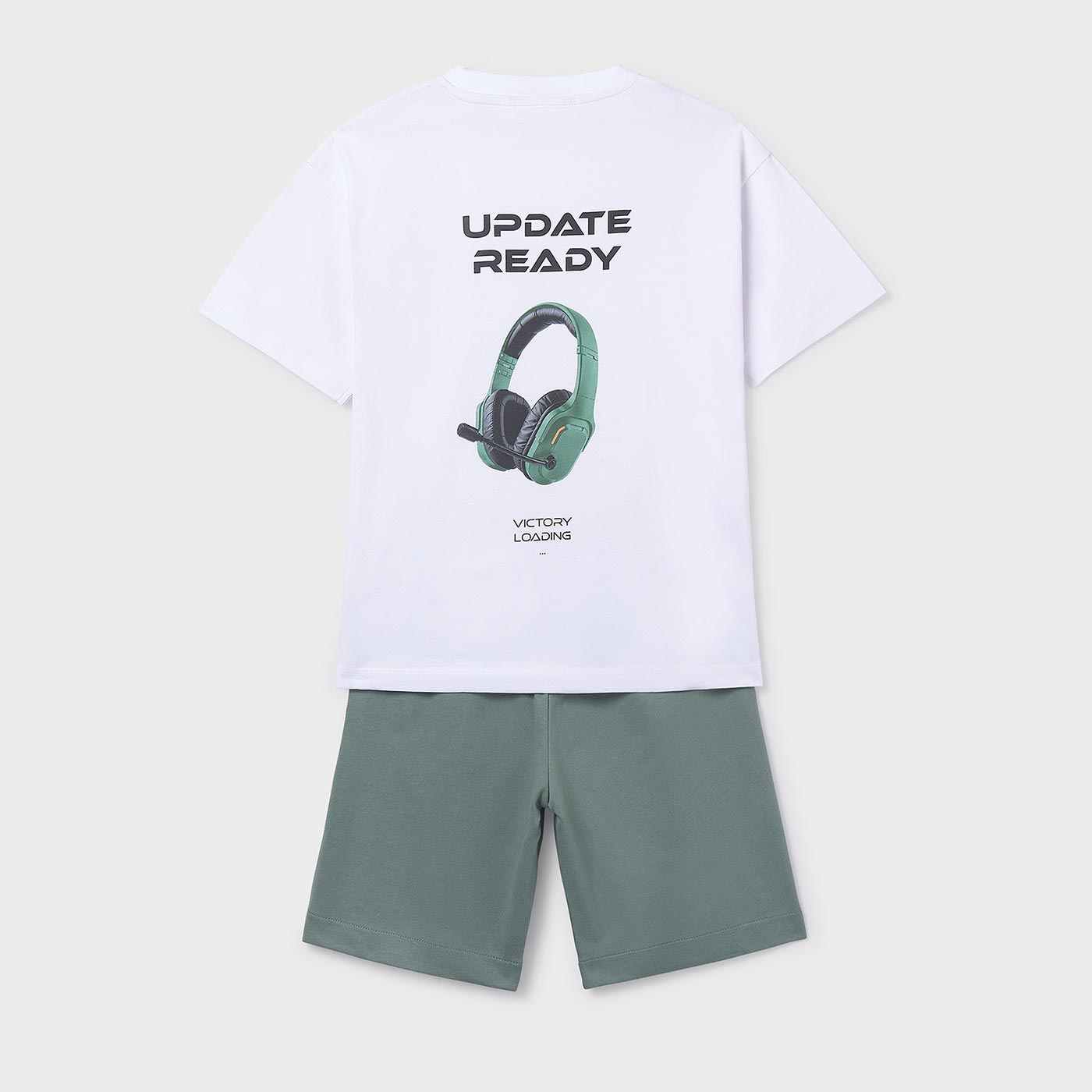 Το παιδικό σετ Mayoral για αγόρια σε φρέσκο συνδυασμό λευκού και χακί είναι ιδανικό για καλοκαιρινές, άνετες και μοντέρνες εμφανίσεις. Αποτελείται από κοντομάνικη μακό μπλούζα και σορτς, προσφέροντας στυλ και λειτουργικότητα στην καθημερινότητα του παιδιού.Η λευκή μπλούζα διαθέτει εντυπωσιακό τύπωμα στην πλάτη με μήνυμα UPDATE READY και σχέδιο ακουστικών, καθώς και διακριτική στάμπα Victory Loading στο μπροστινό μέρος, χαρίζοντας σύγχρονο, tech-inspired χαρακτήρα. Το χακί σορτς συμπληρώνει ιδανικά το σύνολο, με ελαστική μέση και κορδόνι ρύθμισης για άνετη εφαρμογή και πρακτικές τσέπες, ιδανικές για παιχνίδι και βόλτες.Κατασκευασμένο από μαλακό βαμβακερό μακό ύφασμα, το σετ είναι φιλικό προς το παιδικό δέρμα και κατάλληλο για όλη τη διάρκεια της ημέρας, από το σχολείο έως τις διακοπές.
