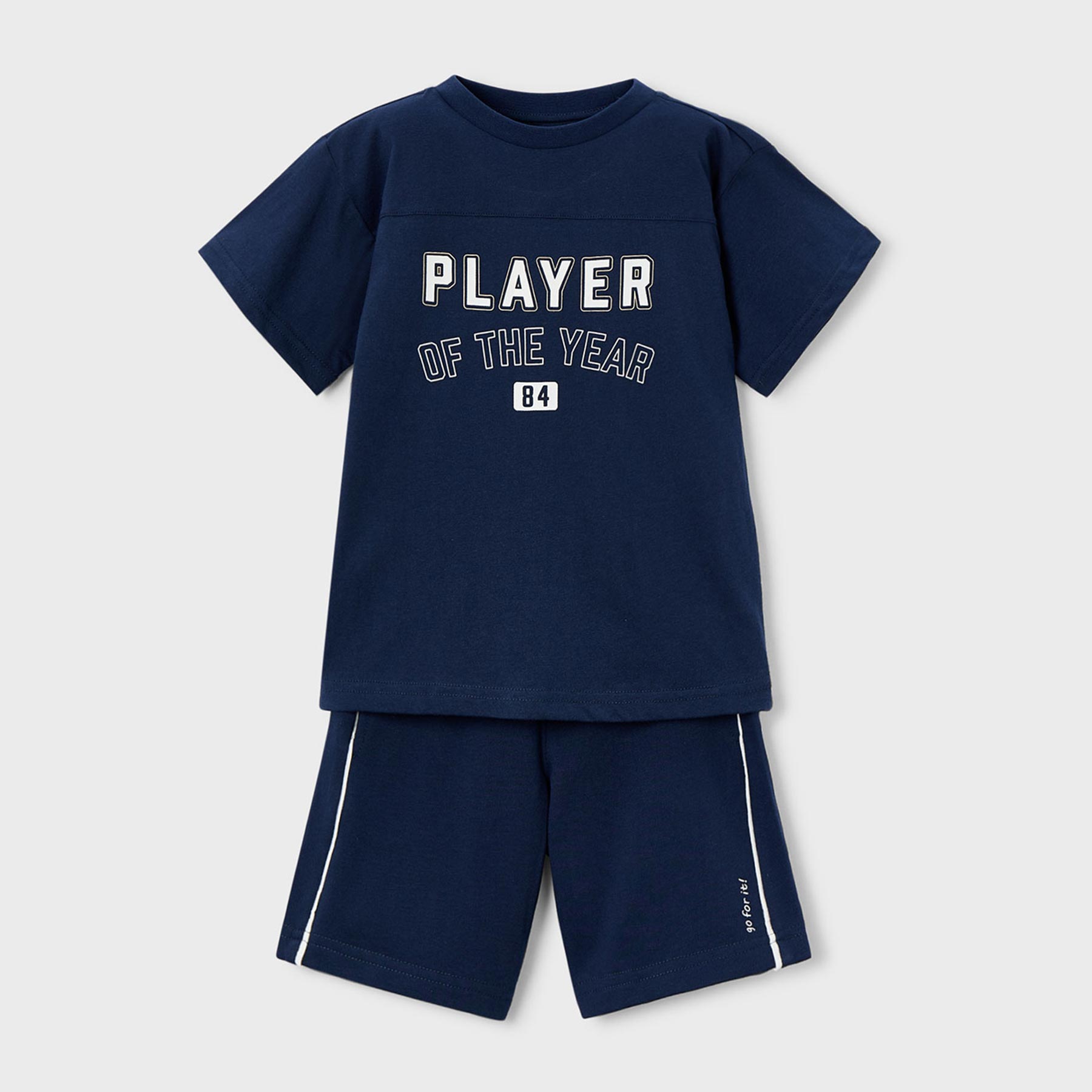 Το παιδικό σετ Mayoral για αγόρια σε κομψό μαρέν χρώμα αποτελεί την ιδανική επιλογή για άνετες και στιλάτες καθημερινές εμφανίσεις. Με αθλητικό χαρακτήρα και μοντέρνο design, είναι σχεδιασμένο για παιδιά που αγαπούν την κίνηση, το παιχνίδι και το sporty look.Το σετ περιλαμβάνει κοντομάνικη μπλούζα με εντυπωσιακό τύπωμα PLAYER OF THE YEAR, που χαρίζει δυναμικό και νεανικό ύφος, καθώς και σορτς σε ίδιους τόνους με διακριτικές λευκές λεπτομέρειες στο πλάι. Η μαλακή μακό ύφανση εξασφαλίζει δροσερή αίσθηση και άνεση όλη μέρα.