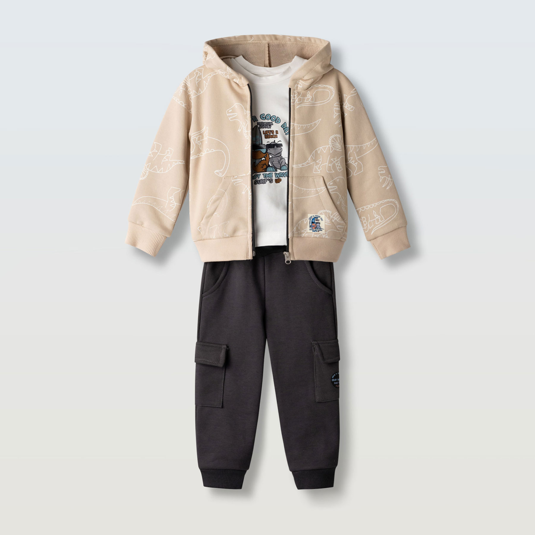 Η ζακέτα σε μπεζ απόχρωση με μοντέρνα σχέδια δεινοσαύρων προσθέτει παιχνιδιάρικο χαρακτήρα στο σύνολο και διαθέτει φερμουάρ και κουκούλα για επιπλέον άνεση. Η μπλούζα με εντυπωσιακό τύπωμα στο μπροστινό μέρος συμπληρώνει το look, ενώ το παντελόνι φόρμας σε ανθρακί απόχρωση με πρακτικές τσέπες προσφέρει ελευθερία κινήσεων και άνετη εφαρμογή.