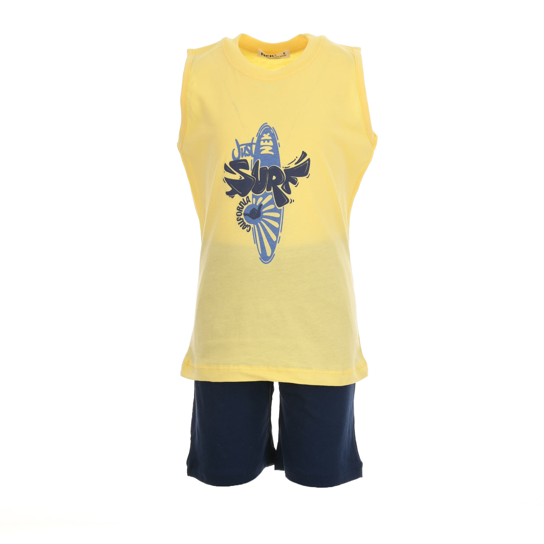 Το παιδικό σετ για αγόρια Nekidswear σε κίτρινο και μαρέν αποπνέει καλοκαιρινή ενέργεια και surf διάθεση. Η αμάνικη μπλούζα με δυναμικό surf print χαρίζει sporty χαρακτήρα, ενώ το μαρέν σορτσάκι ισορροπεί το look με άνεση και πρακτικότητα.