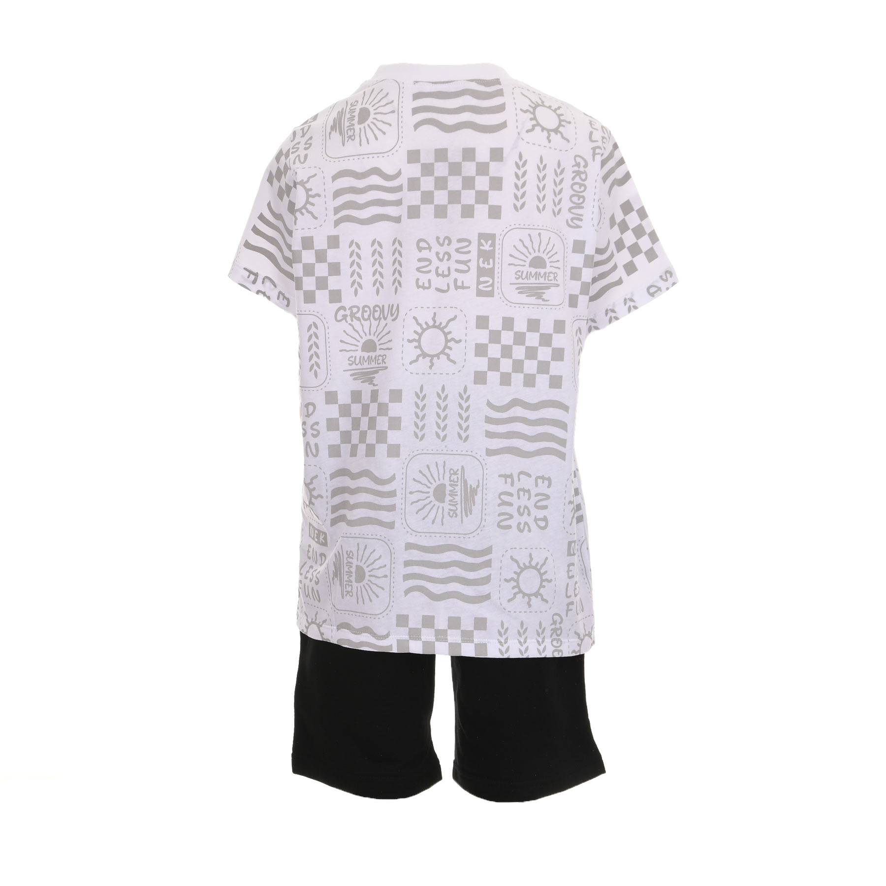 Το παιδικό σετ για αγόρια Nekidswear σε λευκό και μαύρο συνδυάζει minimal αισθητική με μοντέρνα prints για ένα ξεχωριστό καθημερινό look. Η λευκή μπλούζα με all-over σχέδια και summer vibes προσθέτει στυλ, ενώ το μαύρο σορτσάκι ολοκληρώνει το outfit με άνεση και ευκολία.
