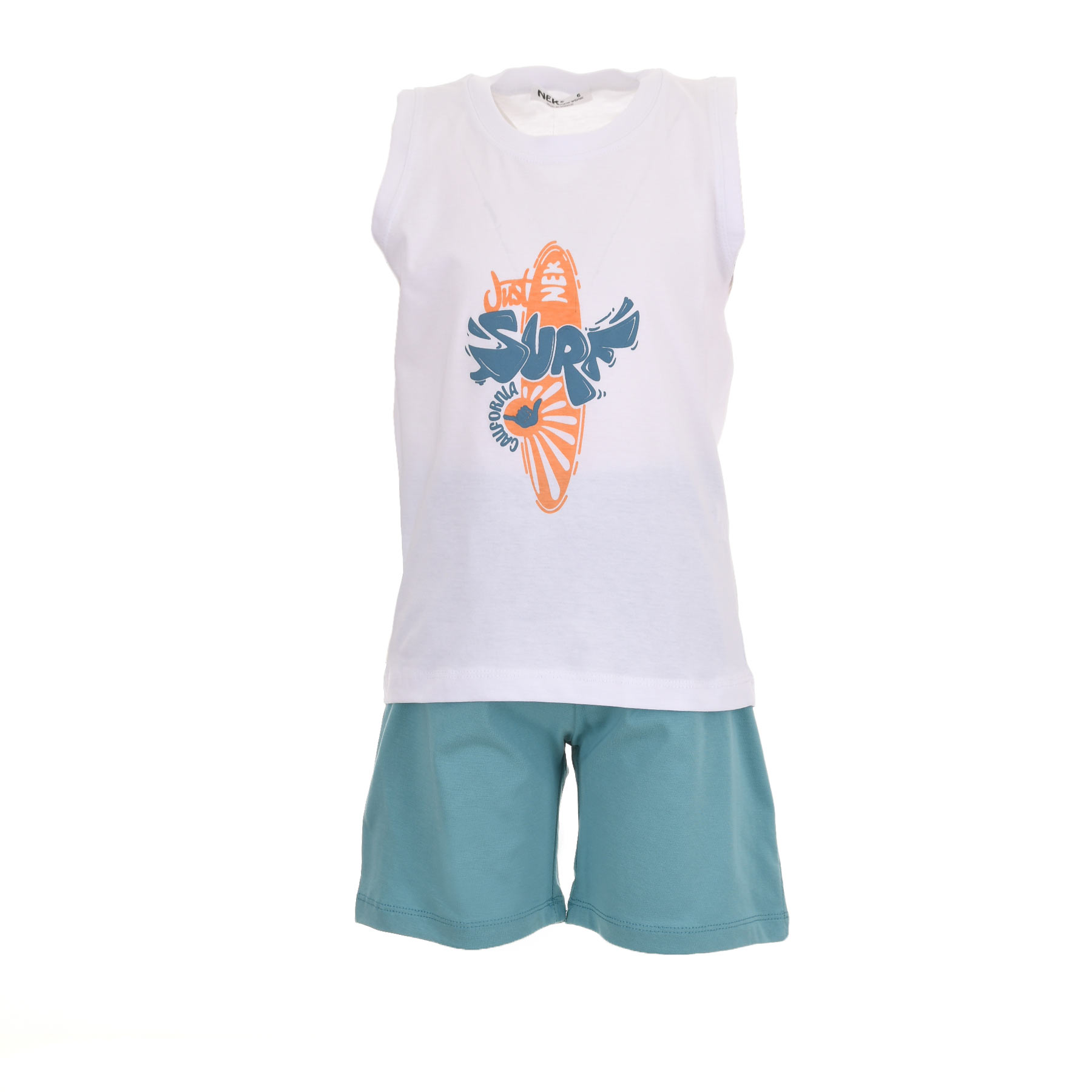 Το παιδικό σετ για αγόρια Nekidswear σε λευκό και πετρόλ με surf-inspired design είναι η απόλυτη επιλογή για καλοκαιρινές εμφανίσεις με χαρακτήρα. Η αμάνικη μπλούζα με εντυπωσιακό print surf προσφέρει cool διάθεση, ενώ το πετρόλ σορτσάκι εξασφαλίζει άνεση και ελευθερία κινήσεων.