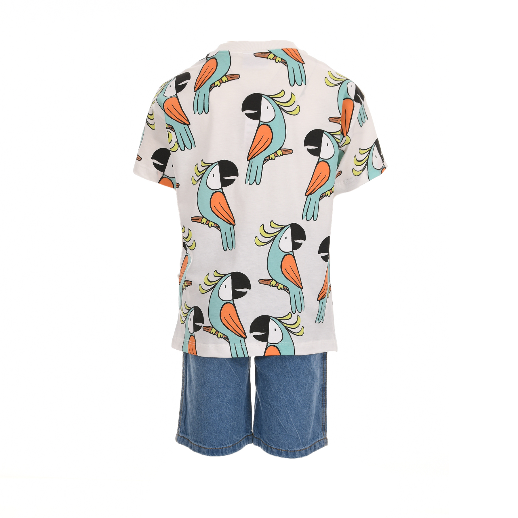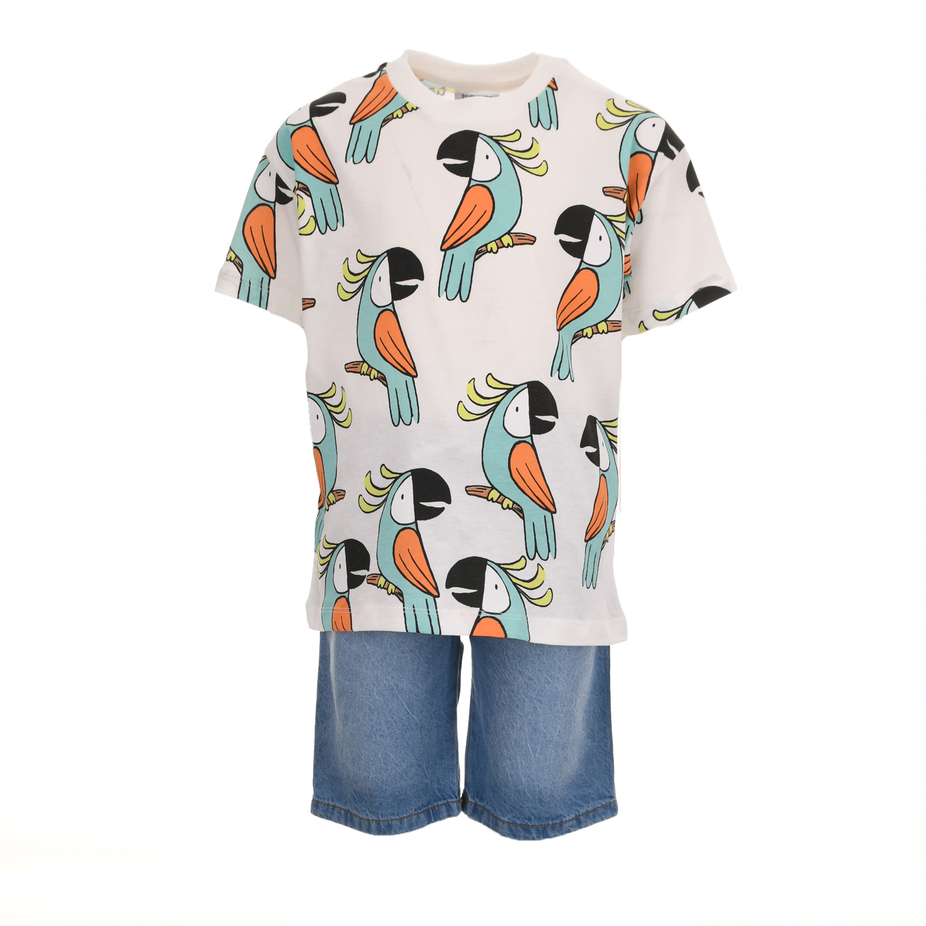 Το παιδικό σετ για αγόρια Trax εκρού-τζιν ξεχωρίζει με το χαρούμενο tropical print από παπαγάλους, δίνοντας μια παιχνιδιάρικη και καλοκαιρινή διάθεση σε κάθε εμφάνιση.