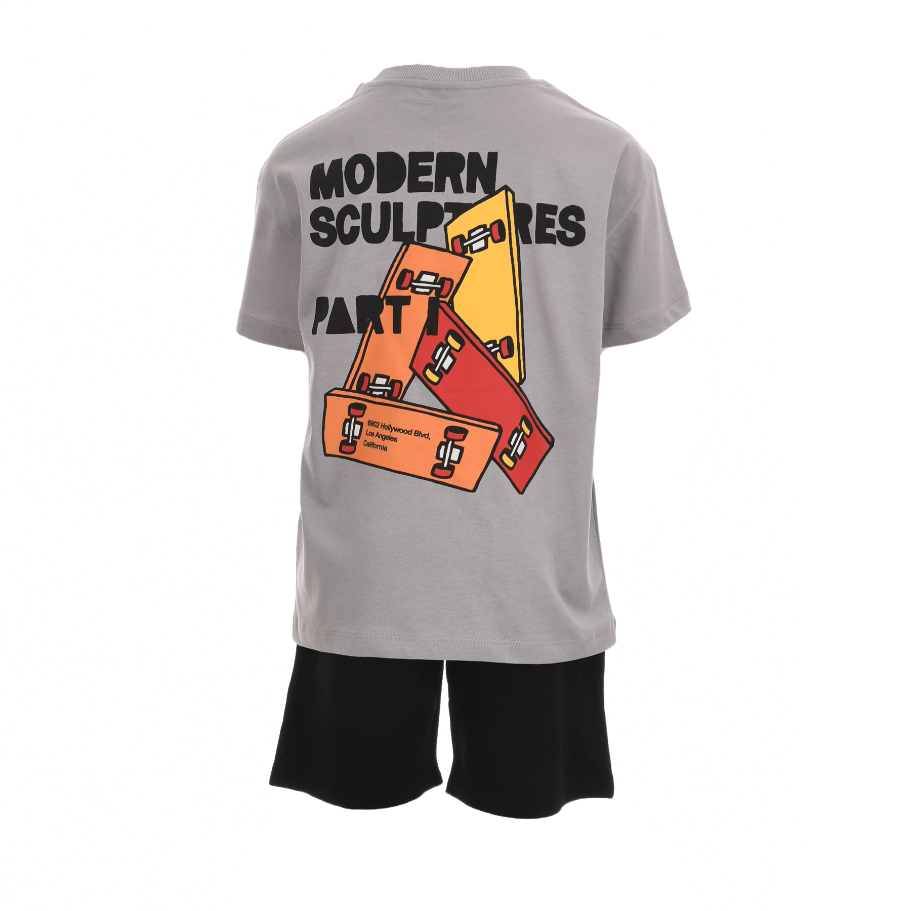 Η γκρι μπλούζα με διακριτικό σχέδιο προσθέτει urban χαρακτήρα, ενώ το μαύρο σορτσάκι ολοκληρώνει το σύνολο με πρακτικότητα και ευελιξία.