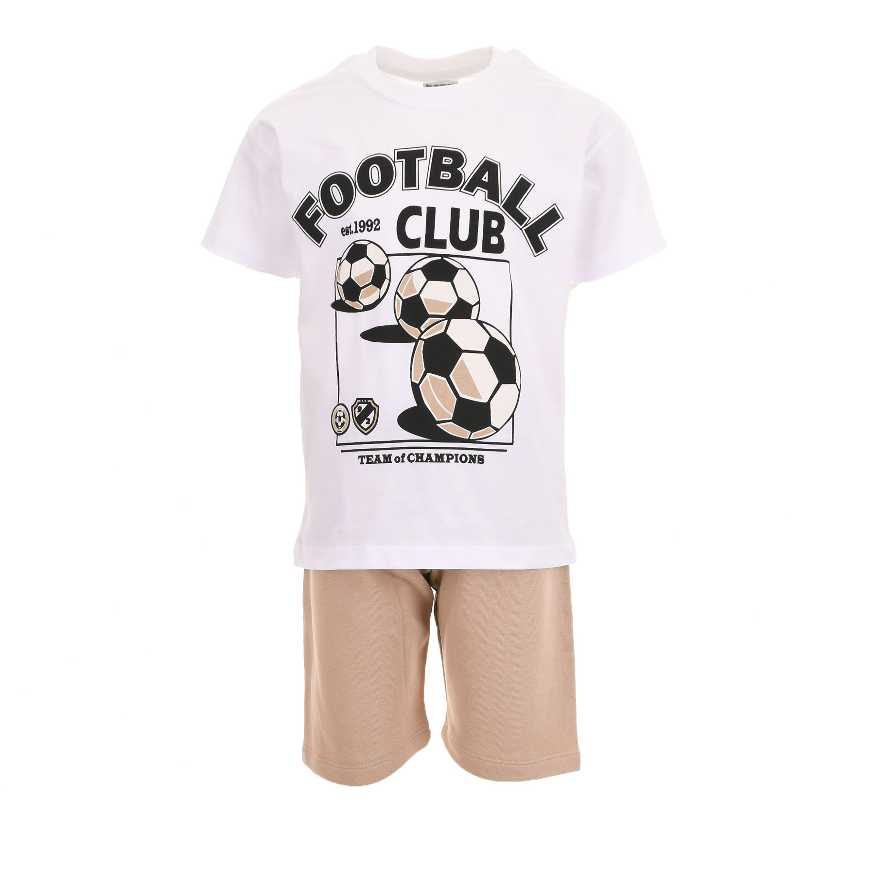Παιδικό σετ για αγόρια Trax σε κομψό συνδυασμό λευκό-μπεζ, ιδανικό για άνετες και stylish καθημερινές εμφανίσεις. Το σετ αποτελείται από λευκή κοντομάνικη μπλούζα με εντυπωσιακό τύπωμα Football Club και σχέδιο με μπάλες ποδοσφαίρου, που δίνει sporty χαρακτήρα και δυναμικό ύφος, καθώς και από μπεζ βερμούδα με ελαστική μέση για σταθερή εφαρμογή και ελευθερία κινήσεων. Κατασκευασμένο από απαλό βαμβακερό ύφασμα, προσφέρει άνεση, διαπνοή και ανθεκτικότητα στην καθημερινή χρήση. Ιδανικό για σχολείο, βόλτες, παιχνίδι και αθλητικές δραστηριότητες, αποτελεί εξαιρετική επιλογή για μικρούς λάτρεις του ποδοσφαίρου. Ένα πρακτικό και μοντέρνο παιδικό σετ Trax που συνδυάζει ποιότητα, άνεση και αθλητικό στυλ σε κάθε εμφάνιση.