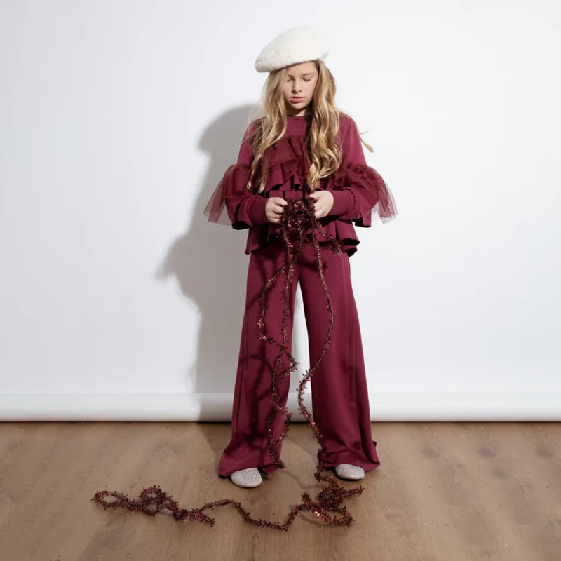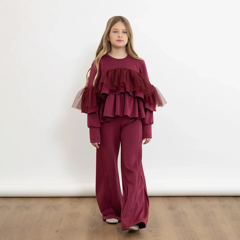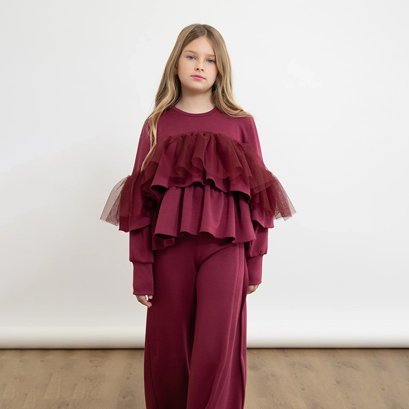 Αναδείξτε το στυλ της μικρής σας με το μοναδικό σετ Alice σε βαθύ μπορντώ, ένα outfit που συνδυάζει άνεση και high-fashion αισθητική. Το υπέροχο επάνω μέρος με τις πλούσιες φούστες από τούλι και τα εντυπωσιακά βολάν προσφέρει μια ξεχωριστή, εκλεπτυσμένη εμφάνιση που εντυπωσιάζει σε κάθε περίσταση.