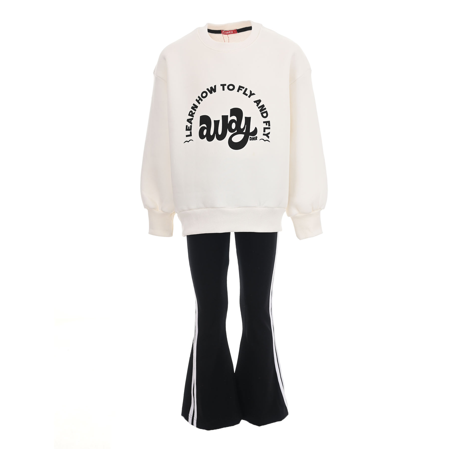 Δώστε στυλ και άνεση στις εμφανίσεις της μικρής σας με αυτό το μοντέρνο παιδικό σετ για κορίτσι Domer σε κομψό συνδυασμό εκρού και μαύρου. Το σετ αποτελείται από μπλούζα φούτερ και παντελόνι καμπάνα, προσφέροντας ένα trendy athleisure look που ξεχωρίζει!