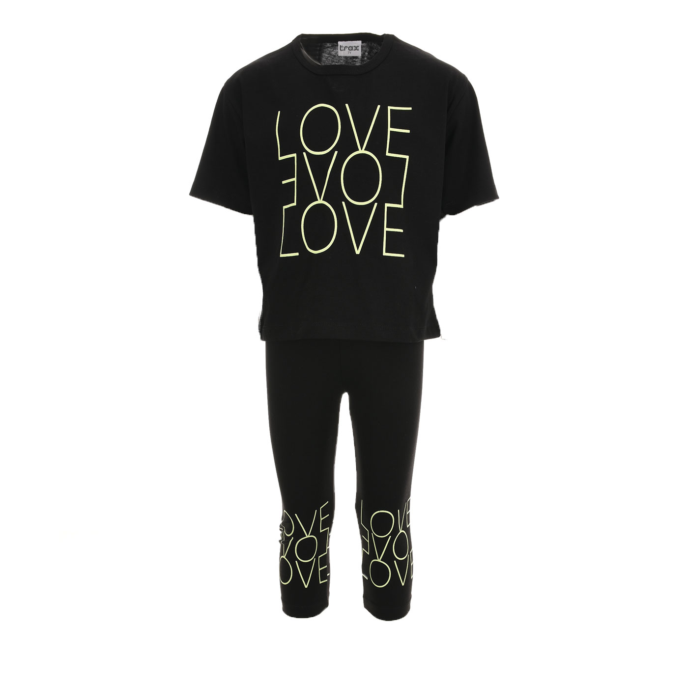 Δώστε μοντέρνο και δυναμικό στυλ στις εμφανίσεις των μικρών κοριτσιών με το παιδικό σετ Trax σε μαύρο χρώμα. Ένα fashion-forward σύνολο 2 τεμαχίων που συνδυάζει άνεση, ευκολία και trendy αισθητική, ιδανικό για καθημερινή χρήση, σχολείο και βόλτες.Το σετ αποτελείται από κοντομάνικη μπλούζα και κολάν 3/4 σε απόλυτα ταιριαστό design. Το minimal μαύρο χρώμα συνδυάζεται με εντυπωσιακά γραμμικά τυπώματα LOVE, δημιουργώντας ένα stylish look που ξεχωρίζει χωρίς υπερβολές.