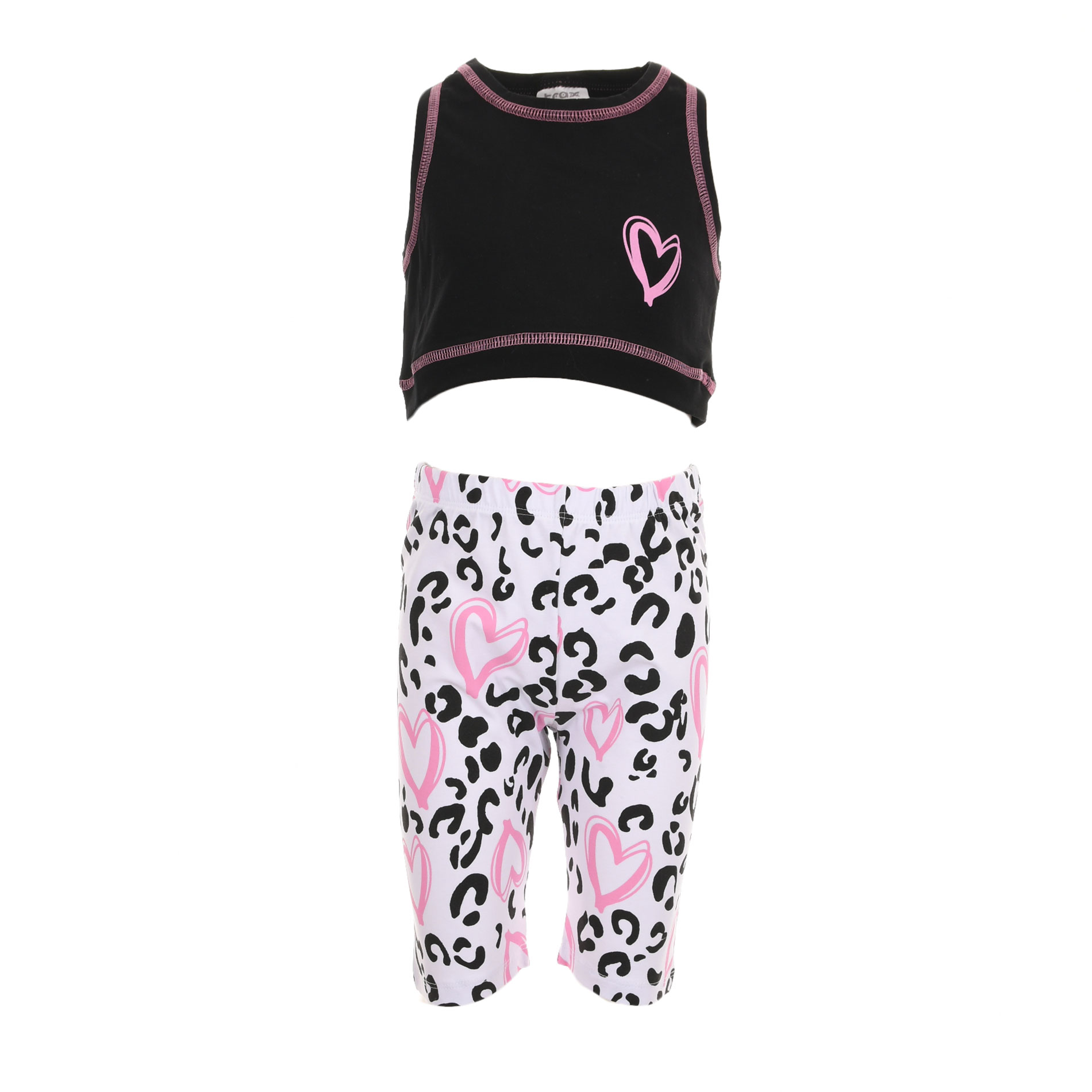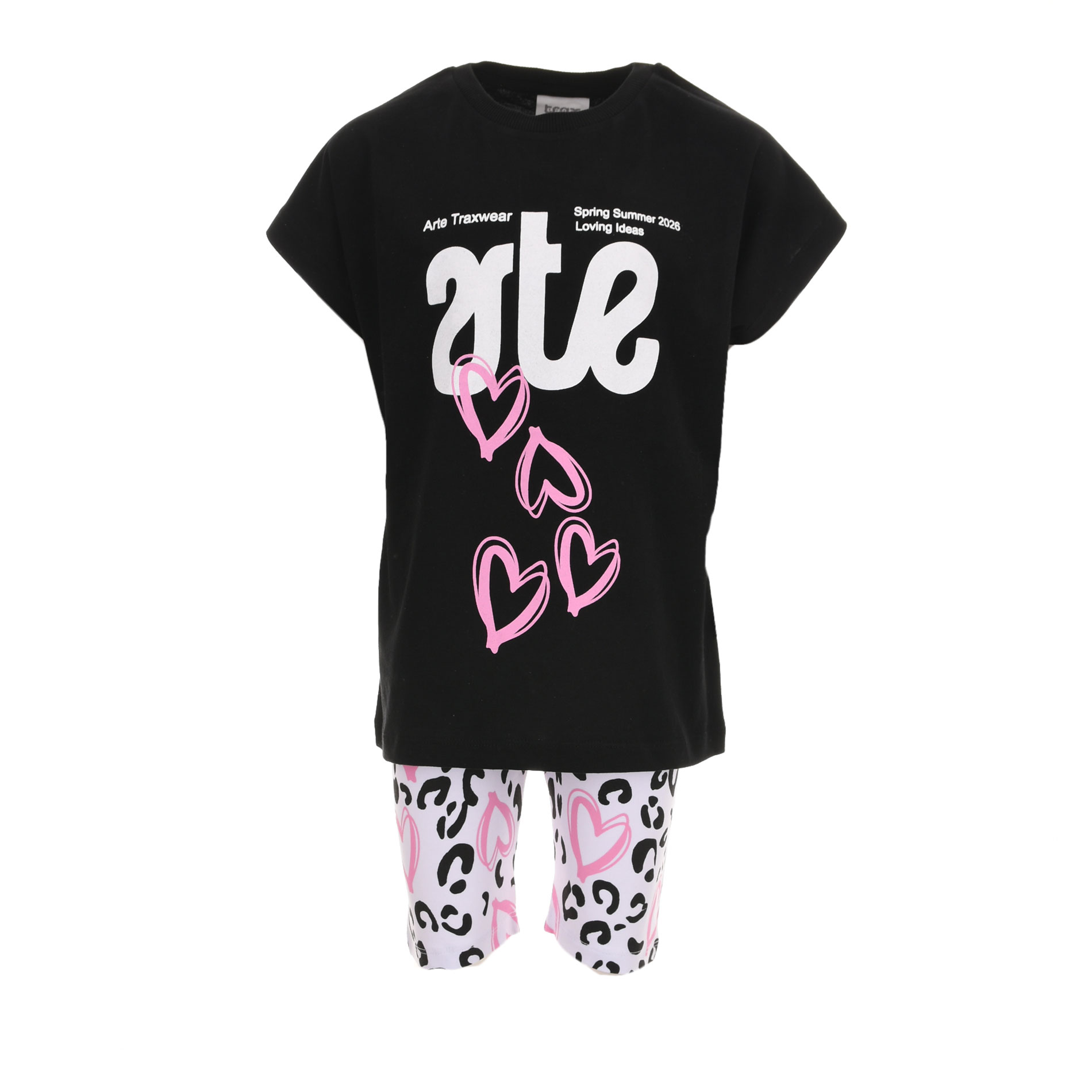 Το παιδικό σετ Trax για κορίτσια σε μαύρο και ασπρόμαυρο σχέδιο (3 τεμαχίων) είναι η απόλυτη επιλογή για μοντέρνες και ξεχωριστές εμφανίσεις. Το σετ περιλαμβάνει μπλούζα με εντυπωσιακό print και καρδιές σε ροζ αποχρώσεις, συνδυασμένη με biker shorts σε animal μοτίβο, δημιουργώντας ένα fashion-forward σύνολο που τραβάει τα βλέμματα.