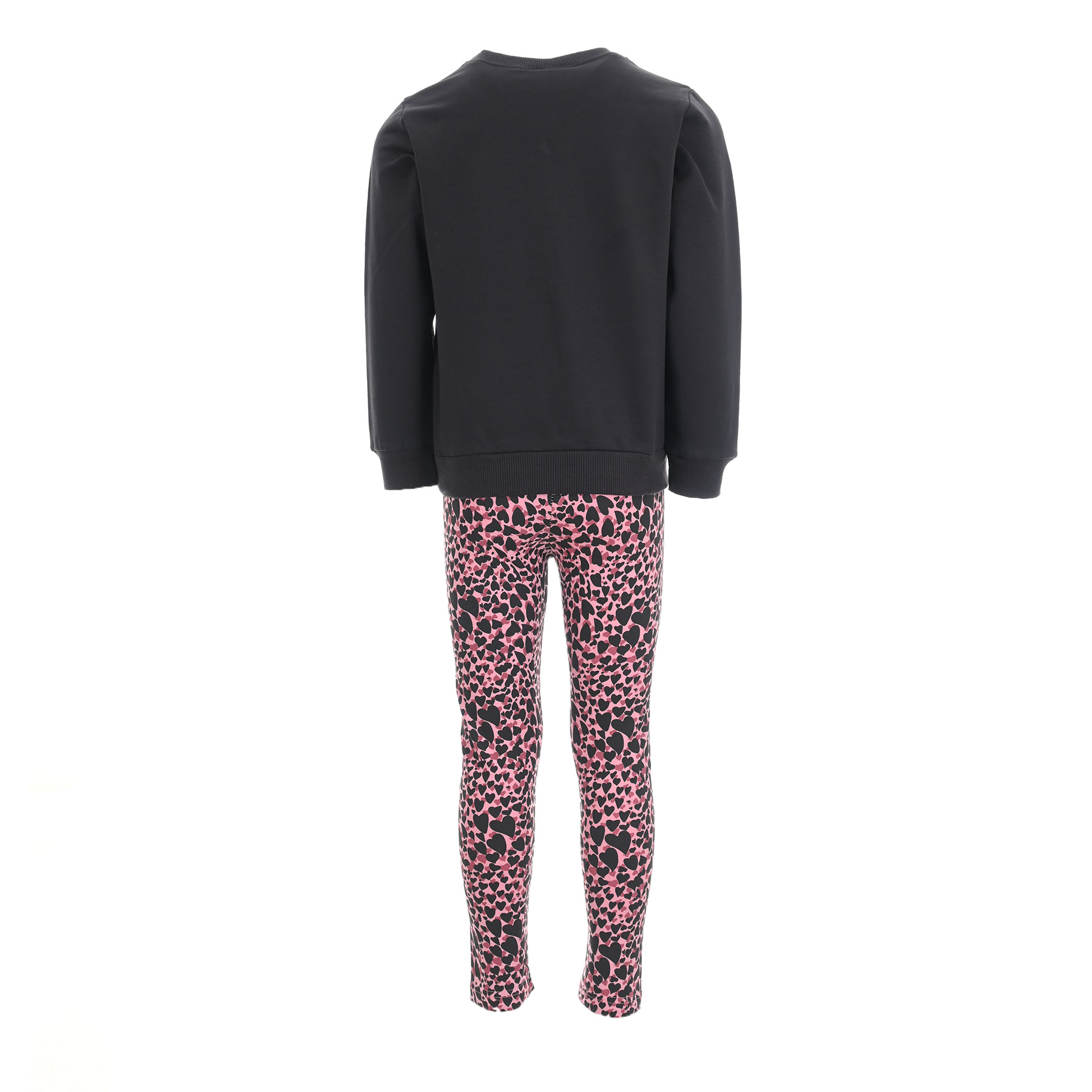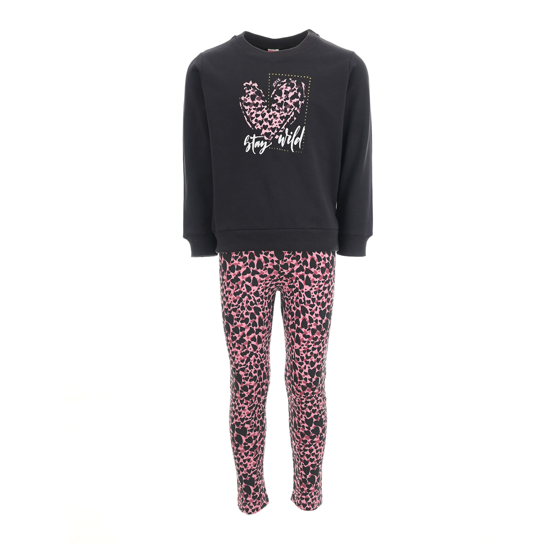 Παιδικό σετ κολάν Joyce "Stay Wild" για κορίτσια, σε μοντέρνο σχέδιο που ξεχωρίζει. Το σετ περιλαμβάνει ανθρακί μπλούζα φούτερ με εντυπωσιακό τύπωμα "Stay Wild" σε animal print με γυαλιστερές λεπτομέρειες, και κολάν με total animal print σχέδιο σε ροζ-μαύρες αποχρώσεις.