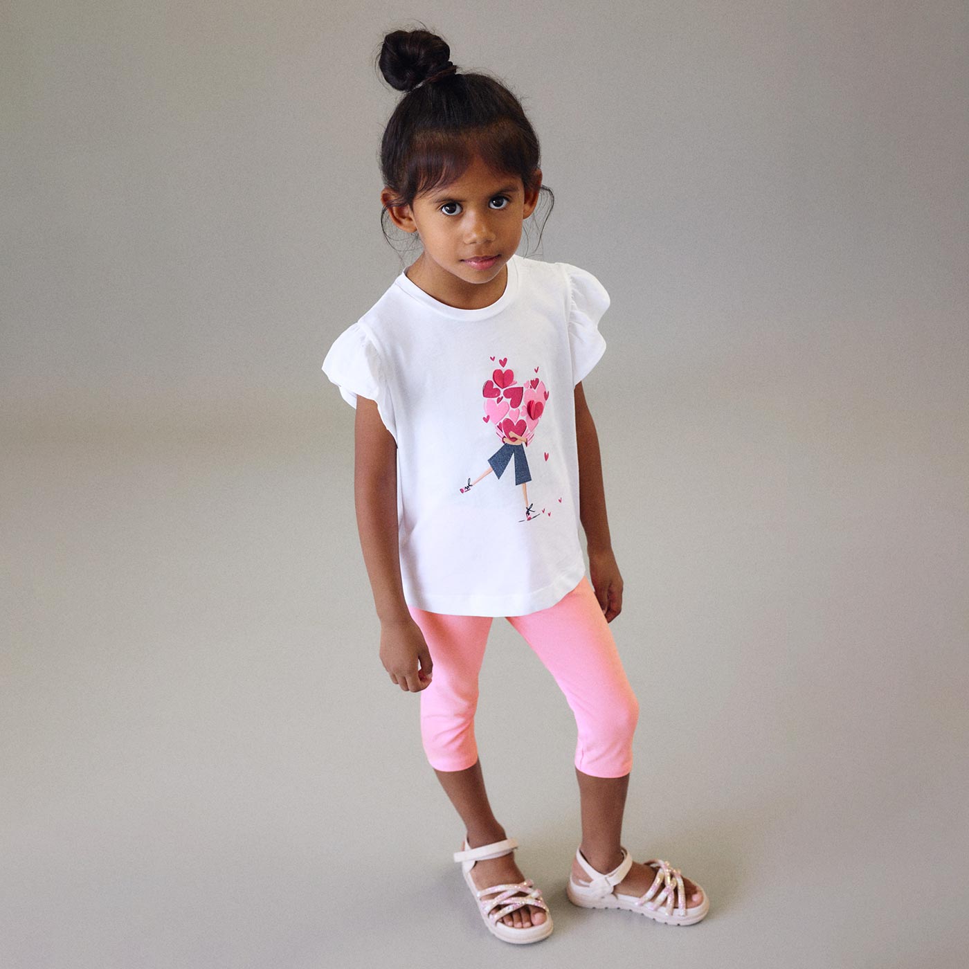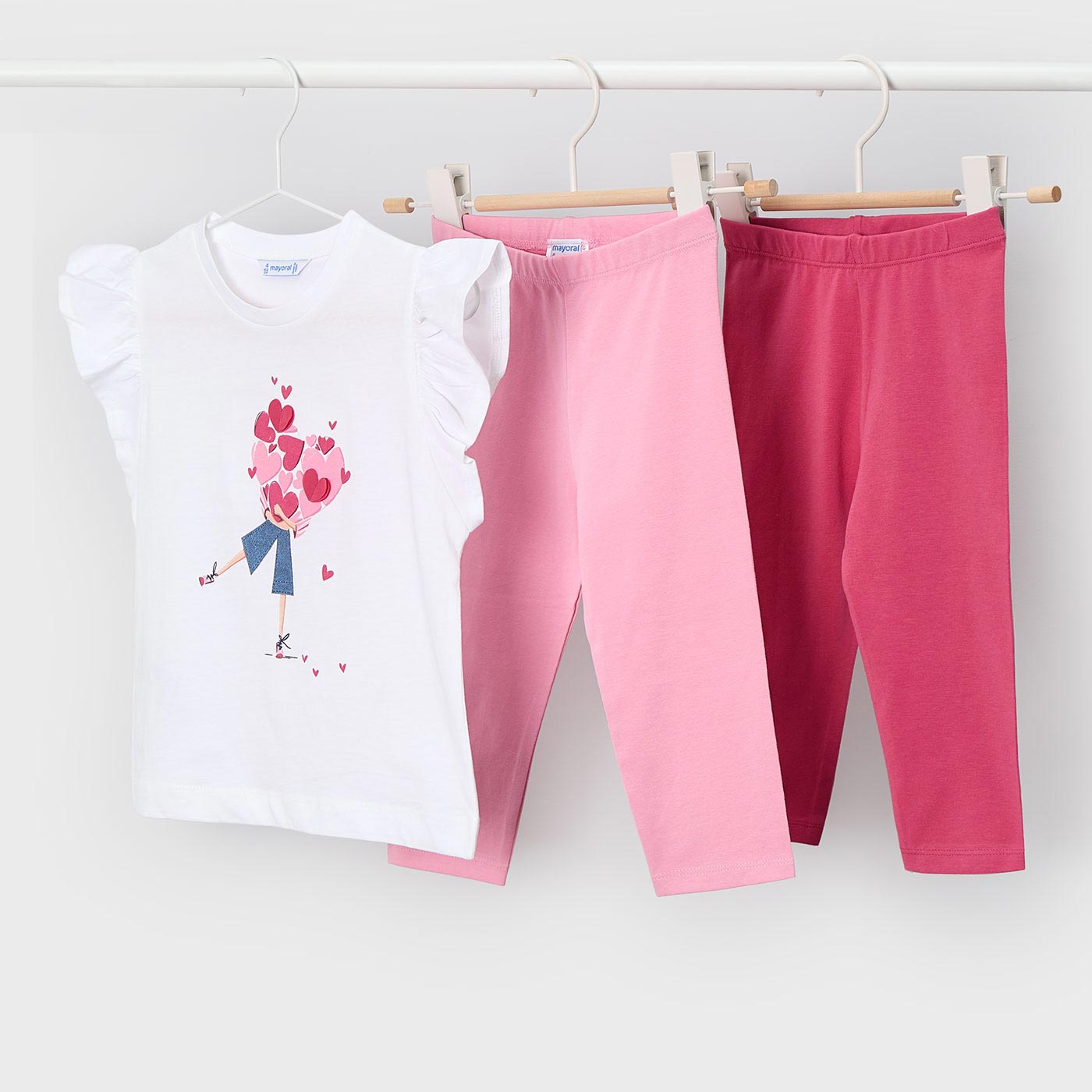 Το παιδικό σετ Mayoral με μπλούζα και 2 κολάν σε αποχρώσεις λευκού και ροζ είναι μια ολοκληρωμένη και πρακτική πρόταση για καθημερινές εμφανίσεις με στυλ. Ιδανικό για άνεση στο παιχνίδι, τη βόλτα ή το σχολείο, το σετ συνδυάζει χαριτωμένο design με υψηλή ποιότητα κατασκευής.Η λευκή μπλούζα διαθέτει ρομαντικό τύπωμα με καρδιές και κομψά βολάν στα μανίκια, προσδίδοντας girly χαρακτήρα. Συνοδεύεται από δύο μαλακά κολάν: ένα σε απαλό ροζ και ένα σε πιο έντονη ροζ απόχρωση, για περισσότερες επιλογές και ευκολία στους συνδυασμούς. Η ελαστική μέση και το βαμβακερό ύφασμα εξασφαλίζουν άνετη εφαρμογή και ελευθερία κινήσεων όλη μέρα.