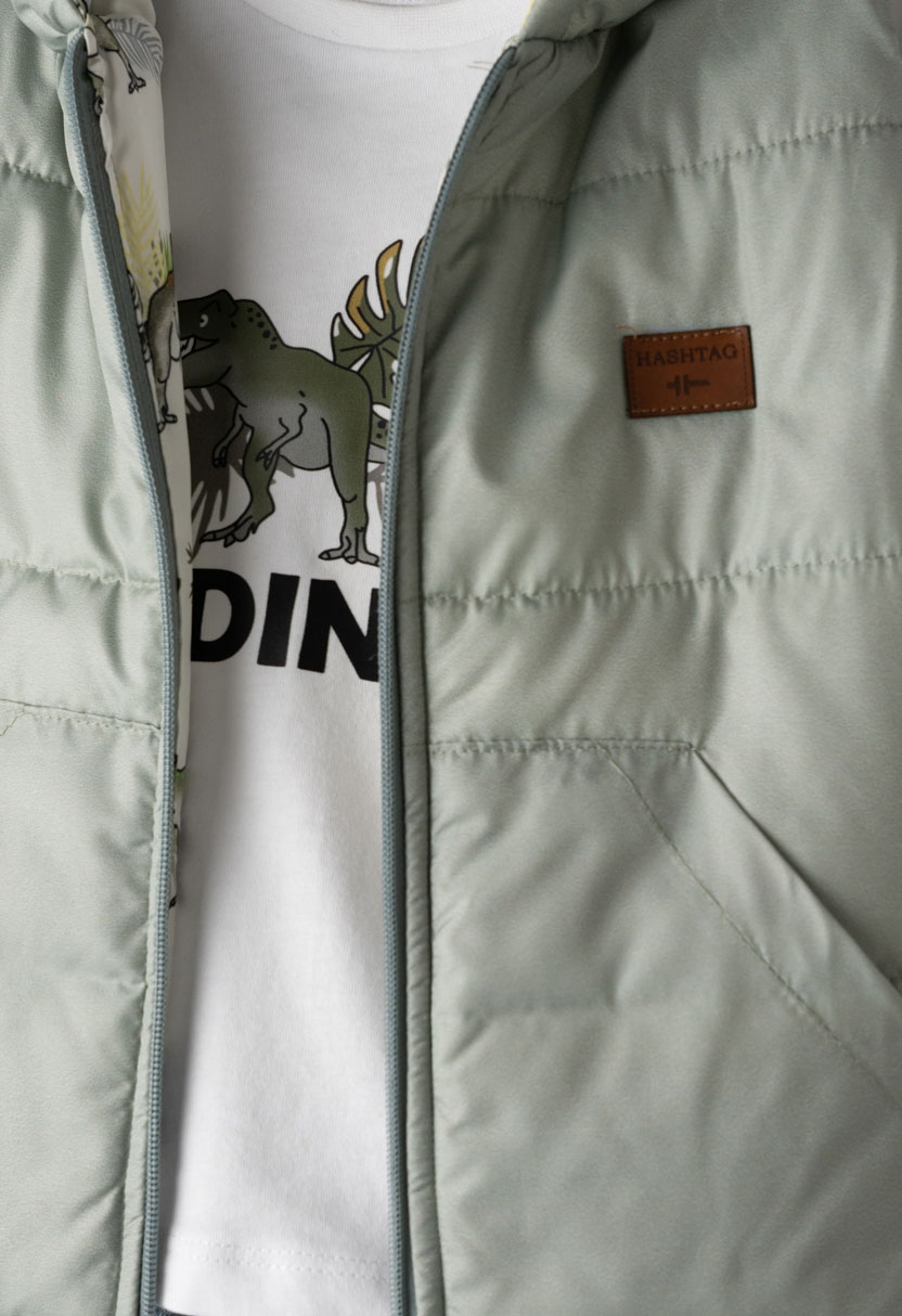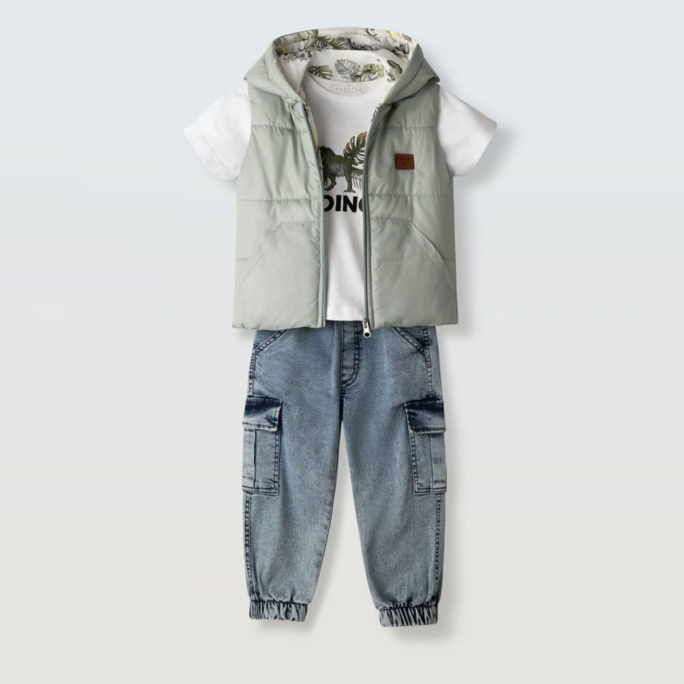 Μοντέρνο και πρακτικό, το παιδικό σετ για αγόρια Hashtag 3 τεμαχίων σε απόχρωση μέντας και τζιν είναι ιδανικό για ολοκληρωμένες καθημερινές εμφανίσεις με στυλ. Ένα σετ που συνδυάζει layering, άνεση και σύγχρονη αισθητική για κάθε περίσταση.Το σύνολο περιλαμβάνει κοντομάνικη μπλούζα με εντυπωσιακό τύπωμα, αμάνικο γιλέκο με κουκούλα σε απαλή μέντα για extra στυλ και προστασία, καθώς και τζιν παντελόνι cargo με πρακτικές τσέπες και λάστιχο στο τελείωμα για σταθερή εφαρμογή. Ο συνδυασμός υφασμάτων προσφέρει άνεση και ελευθερία κινήσεων όλη μέρα.Ιδανικό για σχολείο, βόλτες και casual εμφανίσεις που ξεχωρίζουν.