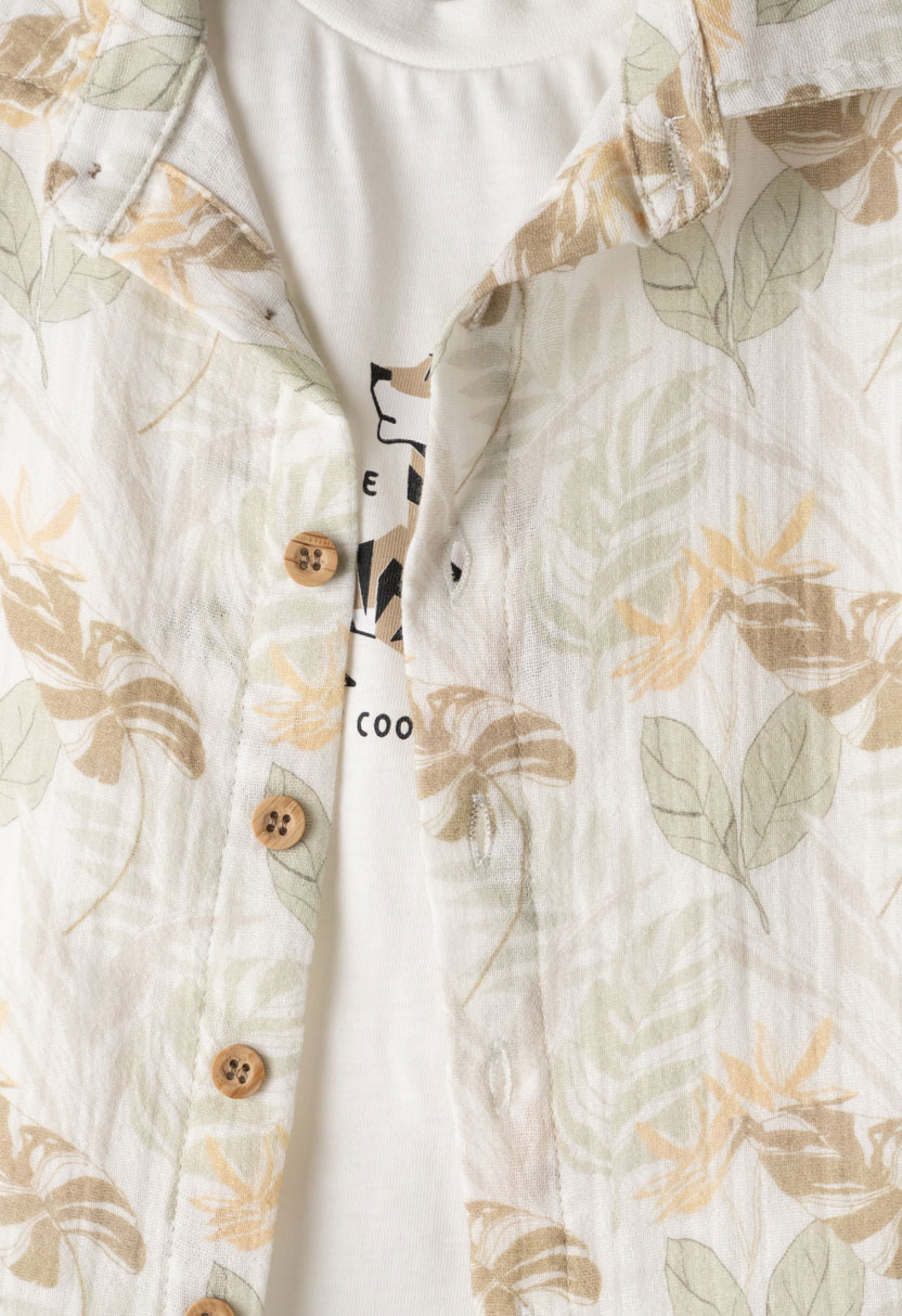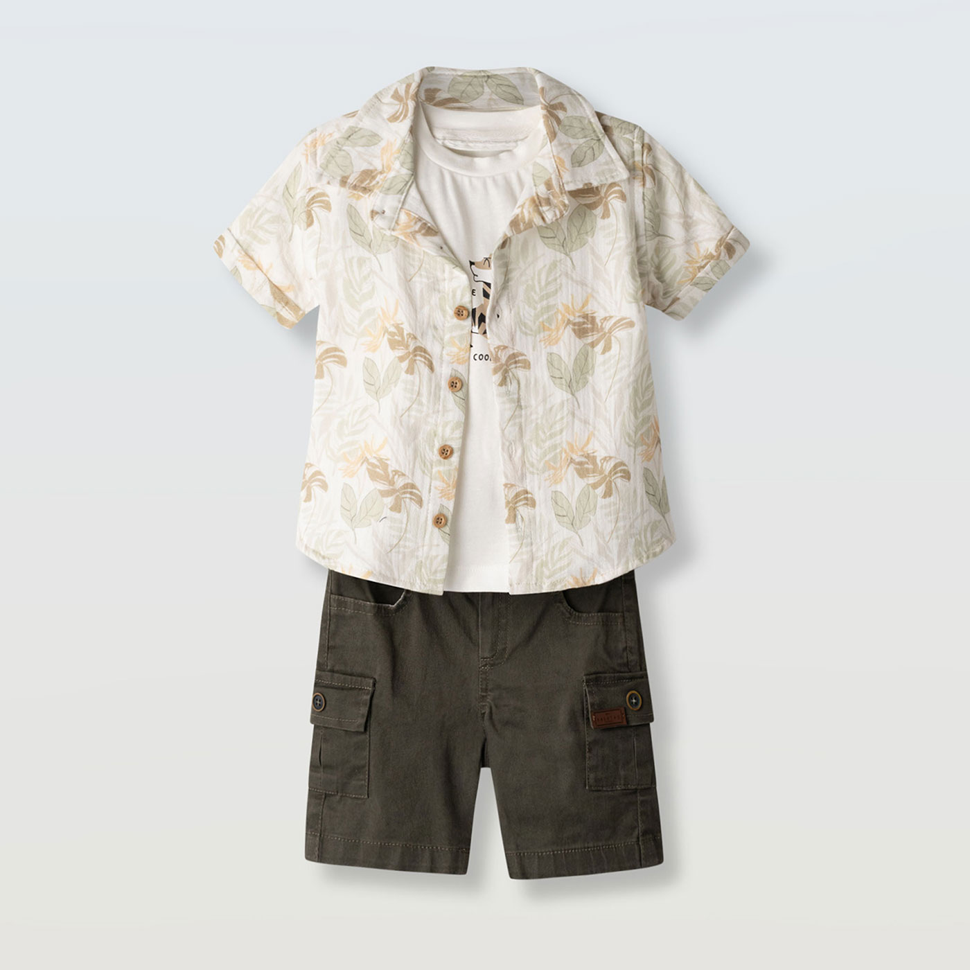 Μοντέρνο και πρακτικό παιδικό σετ για αγόρια από τη Hashtag, ιδανικό για καλοκαιρινές εμφανίσεις με στυλ και άνεση. Το σετ συνδυάζει φυσικές αποχρώσεις μπεζ και χακί, προσφέροντας ένα κομψό αλλά casual αποτέλεσμα.Το σύνολο περιλαμβάνει κοντομάνικο T-shirt, ελαφρύ πουκάμισο με διακριτικό σχέδιο που φοριέται ανοιχτό ή κλειστό και cargo βερμούδα χακί με πρακτικές τσέπες. Η βερμούδα cargo χαρίζει άνεση και ελευθερία κινήσεων, ενώ οι τσέπες προσθέτουν λειτουργικό χαρακτήρα.Ιδανική επιλογή για βόλτες, διακοπές, εκδηλώσεις ή καθημερινή χρήση.