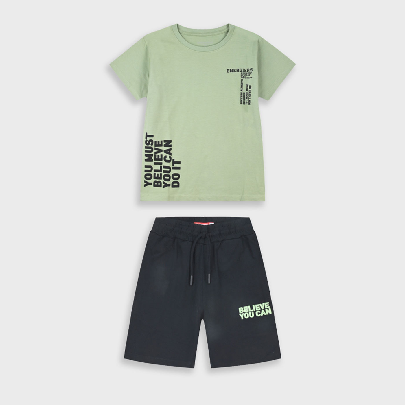 Ανανεώστε το καλοκαιρινό look με το παιδικό σετ με βερμούδα για αγόρια Energiers σε μοντέρνο συνδυασμό φυστικί και μαύρο, ιδανικό για άνετες και στιλάτες εμφανίσεις όλη μέρα. Το σετ περιλαμβάνει κοντομάνικη μπλούζα σε απαλή φυστικί απόχρωση με δυναμικά τυπώματα και motivational μηνύματα που χαρίζουν sporty χαρακτήρα, ενώ η μαύρη βερμούδα δημιουργεί έντονη αντίθεση και μοντέρνο urban ύφος. Η ελαστική μέση με ρυθμιζόμενο κορδόνι προσφέρει τέλεια εφαρμογή και ελευθερία κινήσεων, καθιστώντας το ιδανικό για παιχνίδι, βόλτες και καλοκαιρινές δραστηριότητες. Κατασκευασμένο από μαλακό βαμβακερό ύφασμα που επιτρέπει στο δέρμα να αναπνέει, το παιδικό σετ Energiers εξασφαλίζει άνεση και αντοχή στη χρήση, ενώ συνδυάζεται εύκολα με sneakers ή αθλητικά παπούτσια, αποτελώντας βασική επιλογή για κάθε αγορίστικη καλοκαιρινή γκαρνταρόμπα.