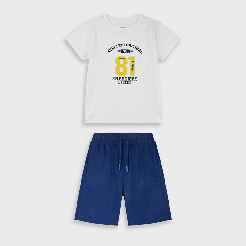 Δώστε αθλητικό χαρακτήρα στις καθημερινές εμφανίσεις του παιδιού με το παιδικό σετ Energiers για αγόρια σε λευκό-μπλε συνδυασμό. Ένα καλοκαιρινό σύνολο που συνδυάζει άνεση, μοντέρνο design και πρακτικότητα, ιδανικό για σχολείο, βόλτες, διακοπές και παιχνίδι.Η κοντομάνικη μπλούζα σε καθαρή λευκή απόχρωση διαθέτει μπροστινό τύπωμα Athletic Original 1963 81 Energiers Legend με κίτρινες και navy λεπτομέρειες, προσθέτοντας sporty και νεανική διάθεση. Η μπλε βερμούδα ολοκληρώνει ιδανικά το outfit, δημιουργώντας έναν κλασικό και ευέλικτο συνδυασμό που ταιριάζει εύκολα και με άλλα t-shirts της παιδικής γκαρνταρόμπας.Το σετ είναι κατασκευασμένο από απαλό βαμβακερό ύφασμα που επιτρέπει στο δέρμα να αναπνέει, προσφέροντας δροσιά και άνεση όλη μέρα. Η ελαστική μέση με ρυθμιζόμενο κορδόνι στη βερμούδα εξασφαλίζει σωστή εφαρμογή και ελευθερία κινήσεων, ιδανική για δραστήρια αγόρια.