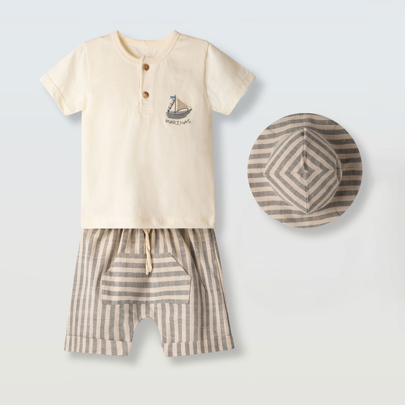 Ένα κομψό και δροσερό παιδικό σετ 3 τεμαχίων για αγόρια από τη Hashtag, ιδανικό για καλοκαιρινές εμφανίσεις με άνεση και στυλ. Το σετ περιλαμβάνει κοντομάνικη μπλούζα, ριγέ βερμούδα και ασορτί καπέλο, δημιουργώντας ένα ολοκληρωμένο outfit για βόλτες και διακοπές.Η μπεζ μπλούζα διαθέτει κουμπάκια στο λαιμό και διακριτικό κέντημα με καραβάκι, προσθέτοντας ναυτικό χαρακτήρα. Η ριγέ βερμούδα με ελαστική μέση και κορδόνι προσφέρει άνετη εφαρμογή και ελευθερία κινήσεων. Το ασορτί ριγέ καπέλο προστατεύει από τον ήλιο και ολοκληρώνει αρμονικά το σύνολο.Κατασκευασμένο από ελαφριά και φιλικά προς το παιδικό δέρμα υφάσματα, είναι ιδανικό για ζεστές ημέρες.
