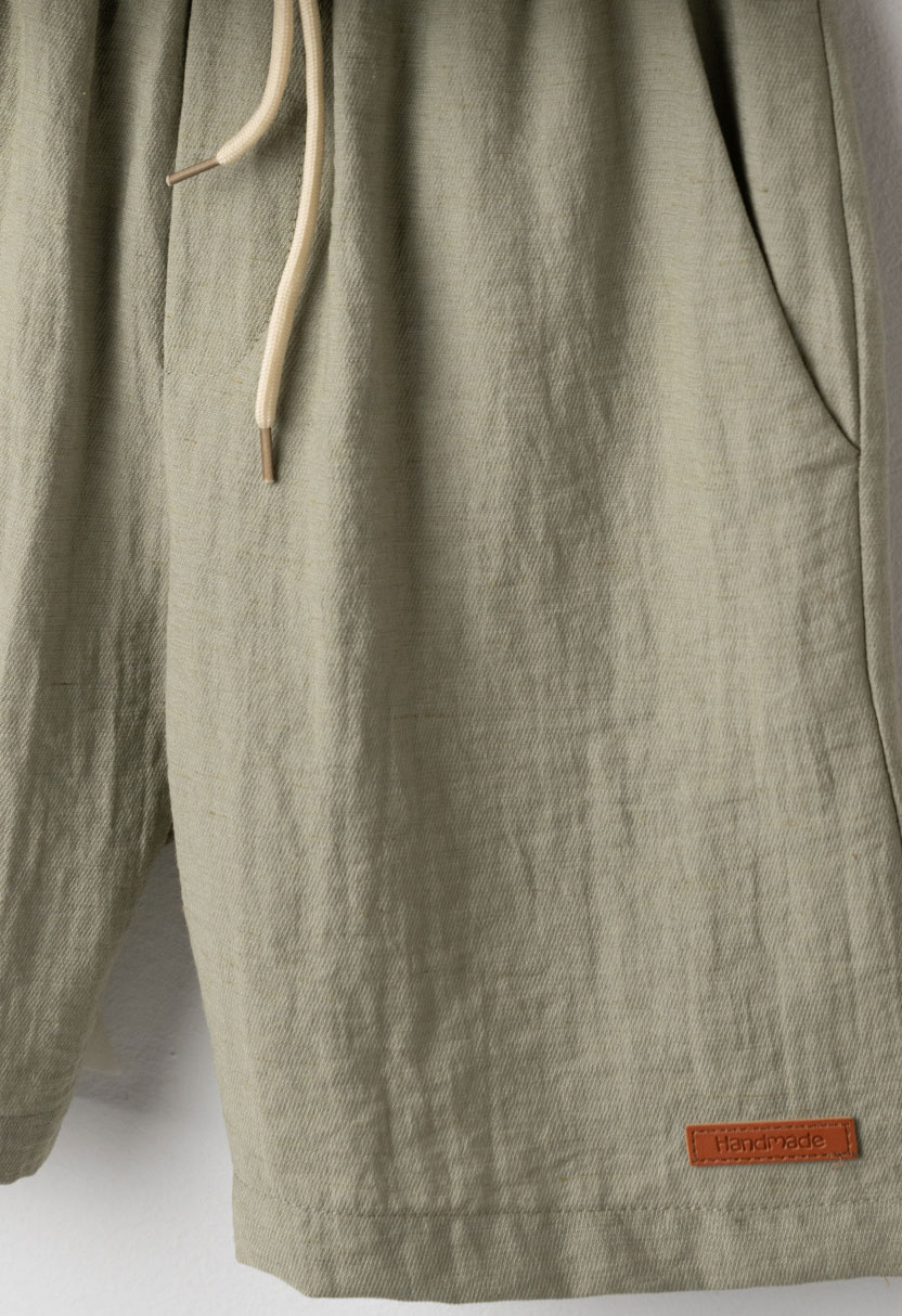 Συνδυάζεται με χακί βερμούδα με ελαστική μέση και κορδόνι ρύθμισης, που εξασφαλίζει άνετη εφαρμογή και ελευθερία κινήσεων. Το ελαφρύ και δροσερό ύφασμα το καθιστά ιδανικό για τις ζεστές καλοκαιρινές ημέρες, ενώ ο minimal σχεδιασμός του επιτρέπει εύκολους και κομψούς συνδυασμούς.