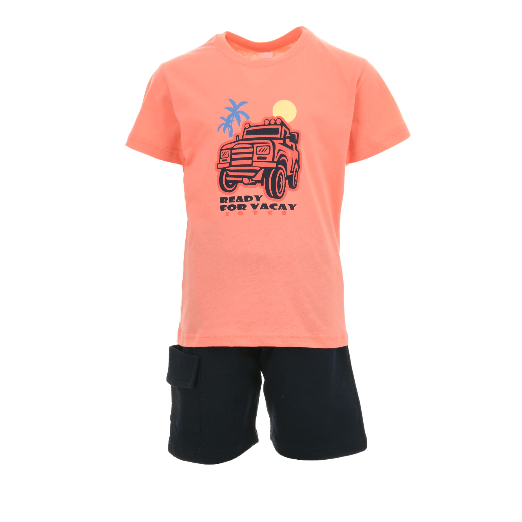 Το παιδικό σετ Joyceκοραλί- μπλε μαρέν είναι ιδανικό για αγόρια που αγαπούν τη δράση και το καλοκαιρινό στυλ. Το σετ αποτελείται από κοντομάνικη μπλούζα με fun τύπωμα Ready for Vacay και άνετη βερμούδα σε μπλε απόχρωση, δημιουργώντας ένα μοντέρνο και δροσερό outfit για κάθε μέρα.Το παιχνιδιάρικο σχέδιο με το τζιπ, τους φοίνικες και τον ήλιο δίνει καλοκαιρινή διάθεση και κάνει το σύνολο αγαπημένη επιλογή για διακοπές, βόλτες και παιχνίδι.