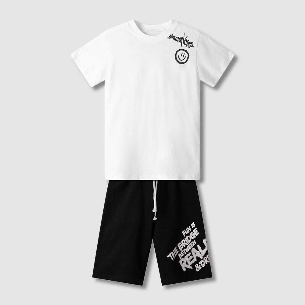 Δώστε καλοκαιρινό χαρακτήρα και urban στυλ στο καθημερινό ντύσιμο με το παιδικό σετ Nekidswear σε λευκό και μαύρο. Ένα μοντέρνο αγορίστικο σύνολο που συνδυάζει άνεση, ποιότητα και δυναμικό design, ιδανικό για δραστήριες ημέρες.Το σετ αποτελείται από λευκή κοντομάνικη μπλούζα με εντυπωσιακά καλοκαιρινά γραφικά (φοίνικας, smile print και μοντέρνα slogans) και μαύρη βερμούδα με τύπωμα στο κάτω μέρος. Η άνετη γραμμή και το μαλακό ύφασμα προσφέρουν ελευθερία κινήσεων, καθιστώντας το ιδανικό για παιχνίδι, βόλτες και διακοπές.