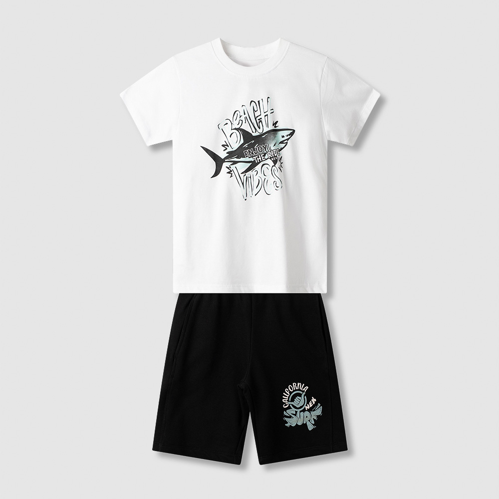Αναδείξτε το καλοκαιρινό στυλ του μικρού σας με το παιδικό σετ Nekidswear σε λευκό και μαύρο. Ένα άνετο και μοντέρνο αγορίστικο σύνολο που συνδυάζει minimal γραμμές με δυναμικά καλοκαιρινά prints.Το σετ αποτελείται από λευκή κοντομάνικη μπλούζα με εντυπωσιακό τύπωμα εμπνευσμένο από beach & surf vibes και μαύρη βερμούδα σε άνετη γραμμή με διακριτικό σχέδιο στο πλάι. Το μαλακό και ελαφρύ ύφασμα προσφέρει άνεση και ελευθερία κινήσεων, ιδανική για παιχνίδι, βόλτες και διακοπές.