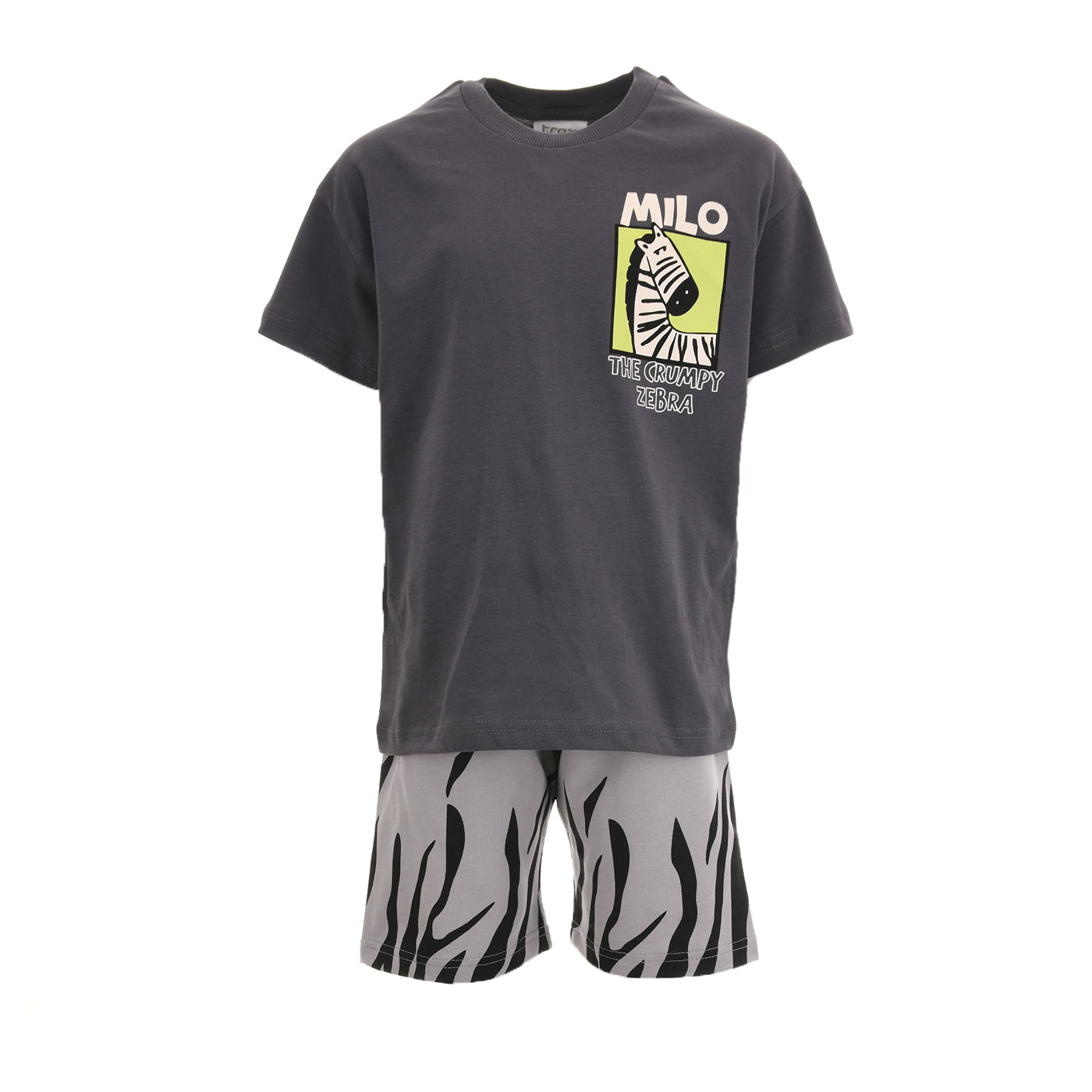 Ένα ξεχωριστό καλοκαιρινό σύνολο που συνδυάζει άνεση, παιχνιδιάρικο χαρακτήρα και μοντέρνο design. Το παιδικό σετ Trax σε ανθρακίμαύρο χρώμα είναι ιδανικό για αγόρια που θέλουν να νιώθουν άνετα αλλά και να ξεχωρίζουν με το στυλ τους στις καθημερινές τους δραστηριότητες.Το κοντομάνικο t-shirt σε ανθρακί απόχρωση διαθέτει διακριτικό αλλά ιδιαίτερο τύπωμα στο στήθος με το σχέδιο Milo the Grumpy Zebra, που δίνει στο ρούχο έναν fun και παιδικό χαρακτήρα χωρίς υπερβολές. Το design είναι μοντέρνο και εύκολο να συνδυαστεί, ενώ παραμένει ελκυστικό για τα παιδιά.Η βερμούδα ολοκληρώνει το σύνολο με εντυπωσιακό zebra pattern σε μαύρογκρι, προσθέτοντας δυναμική αντίθεση και στυλ. Η ελαστική μέση προσφέρει σταθερή εφαρμογή και άνεση, ώστε το παιδί να κινείται ελεύθερα όλη μέρα.