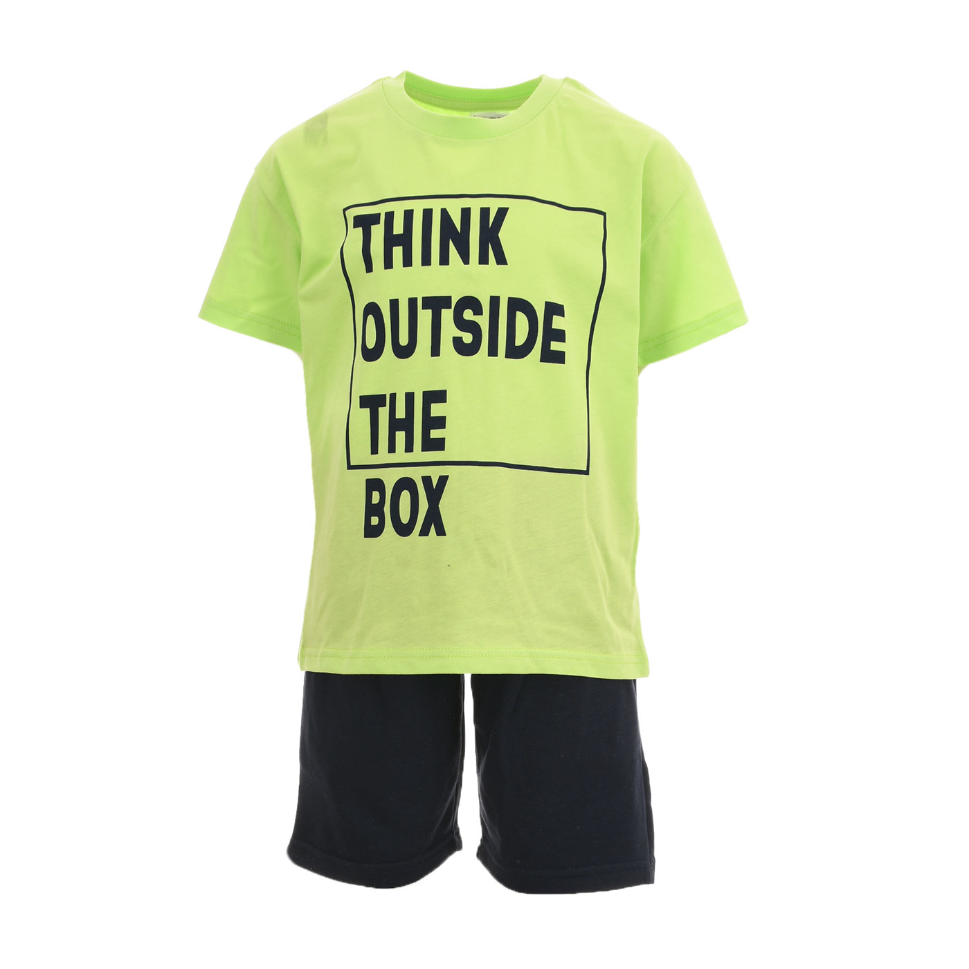 Δώστε ενέργεια και στυλ στις καλοκαιρινές εμφανίσεις με αυτό το παιδικό σετ με βερμούδα για αγόρια της Trax σε λαχανί και μαύρο. Ένα άνετο και μοντέρνο σύνολο που ξεχωρίζει για το χρώμα και το statement τύπωμα, ιδανικό για δραστήρια παιδιά.Η κοντομάνικη μπλούζα σε έντονη λαχανί απόχρωση τραβά τα βλέμματα με το μεγάλο τύπωμα THINK OUTSIDE THE BOX, προσθέτοντας σύγχρονο urban χαρακτήρα. Η γραμμή της είναι άνετη και το ύφασμα απαλό, προσφέροντας δροσερή αίσθηση όλη μέρα.Η μαύρη βερμούδα ισορροπεί ιδανικά το look, με ελαστική μέση για σταθερή και άνετη εφαρμογή. Επιτρέπει ελευθερία κινήσεων, κάνοντάς την ιδανική για παιχνίδι και καθημερινές δραστηριότητες.