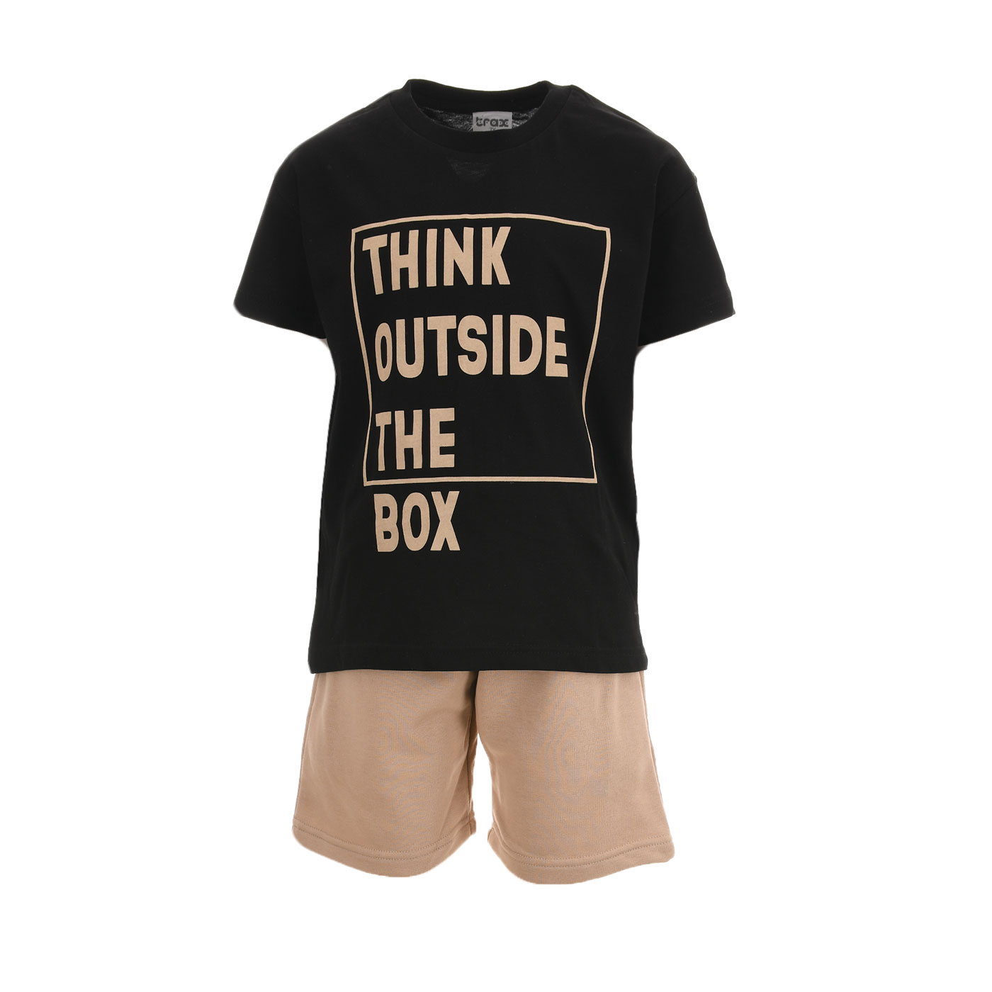 Μοντέρνο, άνετο και πρακτικό, αυτό το παιδικό σετ με βερμούδα για αγόρια της Trax αποτελεί ιδανική επιλογή για τις ανοιξιάτικες και καλοκαιρινές εμφανίσεις. Συνδυάζει sporty αισθητική με καθημερινή άνεση, προσφέροντας ένα ολοκληρωμένο outfit για κάθε δραστηριότητα.Η μαύρη κοντομάνικη μπλούζα διαθέτει εντυπωσιακό τύπωμα με σχέδιο αθλητικού παπουτσιού και γραφικά στοιχεία, χαρίζοντας δυναμικό, αθλητικό χαρακτήρα. Η στρογγυλή λαιμόκοψη και η μαλακή υφή του υφάσματος εξασφαλίζουν άνετη εφαρμογή όλη μέρα.Η μπεζ βερμούδα συμπληρώνει ιδανικά το σύνολο, προσφέροντας ουδέτερο, εύκολο συνδυασμό με άλλα ρούχα. Διαθέτει ελαστική μέση για σταθερή και άνετη εφαρμογή, ιδανική για παιχνίδι και κίνηση χωρίς περιορισμούς.