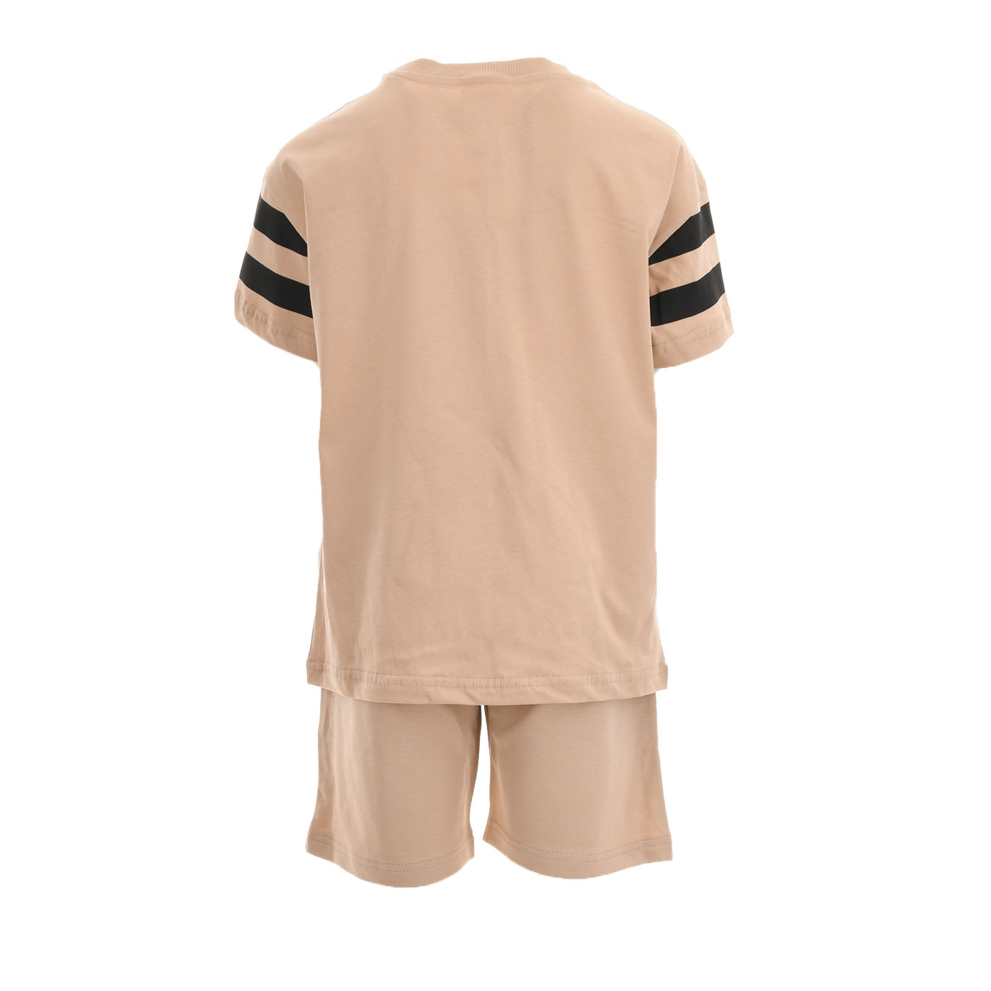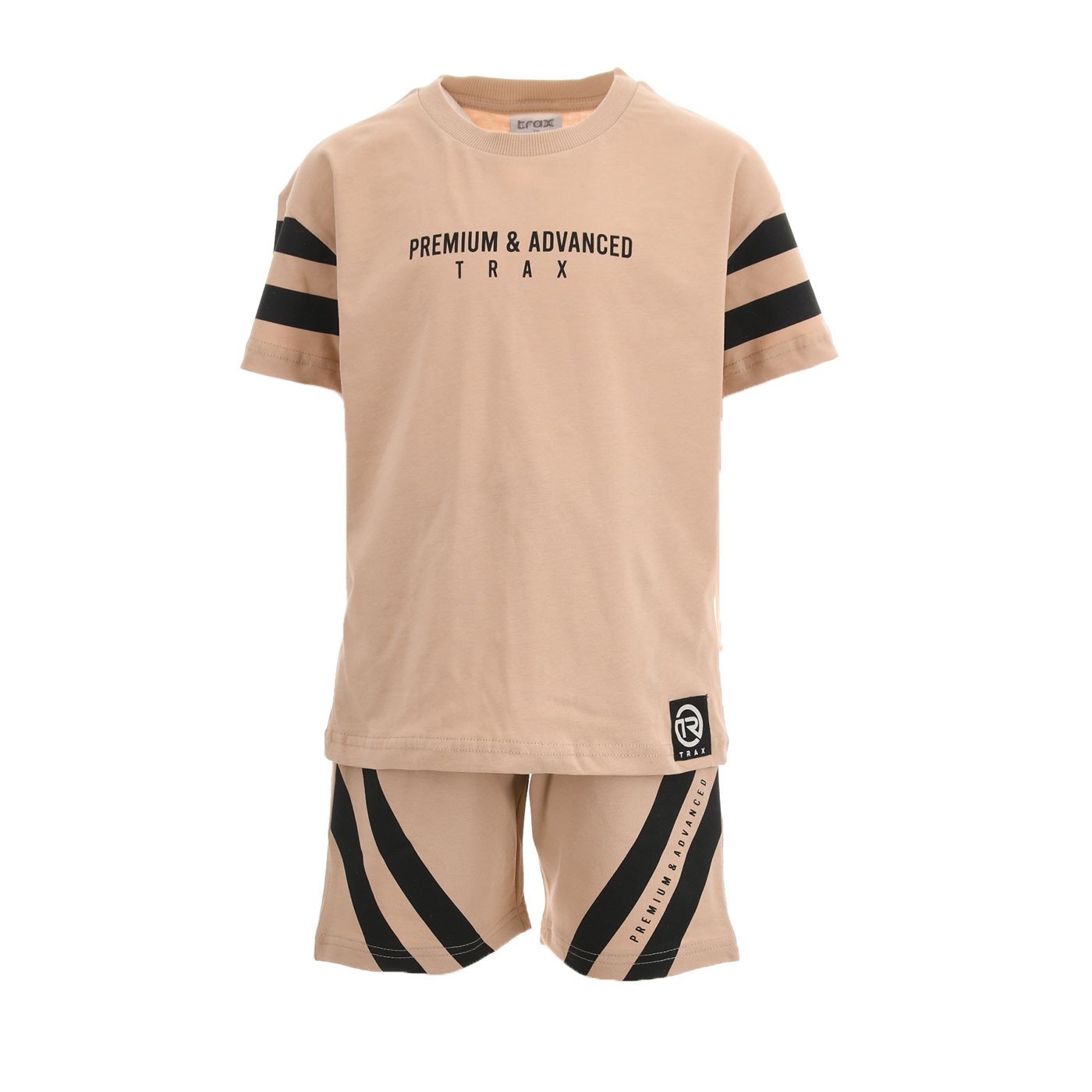 Το παιδικό σετ με βερμούδα Trax σε μπεζ απόχρωση είναι μια premium καλοκαιρινή επιλογή για αγόρια που θέλουν άνεση, ποιότητα και σύγχρονο sporty στυλ. Πρόκειται για ένα ολοκληρωμένο σύνολο 2 τεμαχίων που συνδυάζει minimal αισθητική με δυναμικές λεπτομέρειες, ιδανικό για καθημερινή χρήση από το πρωί έως το βράδυ.Η κοντομάνικη μπλούζα σε ουδέτερο μπεζ χρώμα προσφέρει ευκολία στους συνδυασμούς και διαχρονικό look. Το διακριτικό τύπωμα Premium & Advanced Trax στο στήθος ενισχύει τον μοντέρνο χαρακτήρα, ενώ οι μαύρες ρίγες στα μανίκια δίνουν sporty διάθεση και ξεχωριστό ύφος.Η βερμούδα ακολουθεί την ίδια χρωματική παλέτα, με εντυπωσιακές μαύρες καμπύλες γραμμές που δημιουργούν δυναμικό design. Η ελαστική μέση εξασφαλίζει σταθερή αλλά άνετη εφαρμογή, ιδανική για παιχνίδι και κίνηση χωρίς περιορισμούς.Το ύφασμα είναι μαλακό, ανθεκτικό και φιλικό προς το παιδικό δέρμα, σχεδιασμένο να αντέχει στα συχνά πλυσίματα χωρίς να χάνει το σχήμα ή το χρώμα του.
