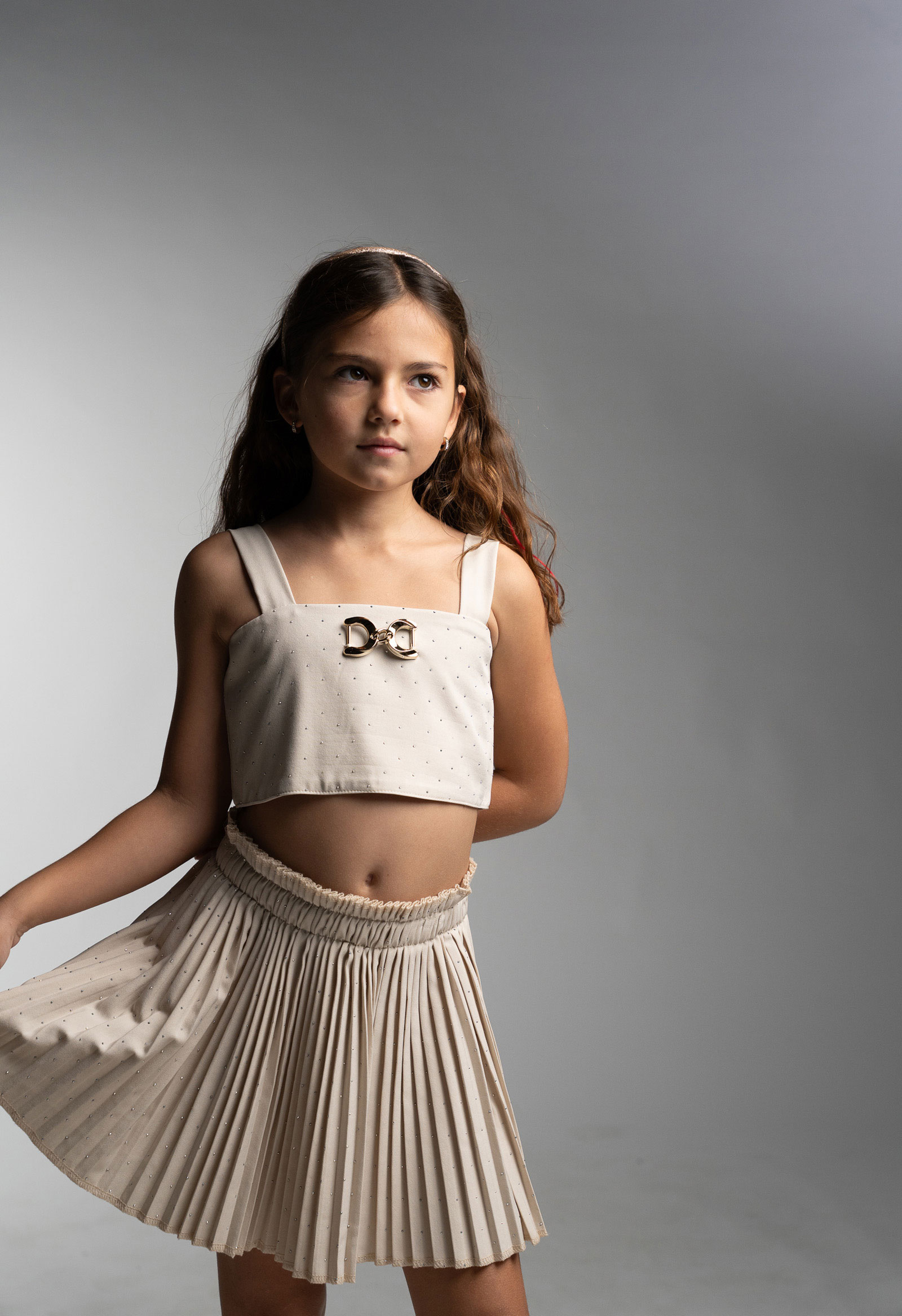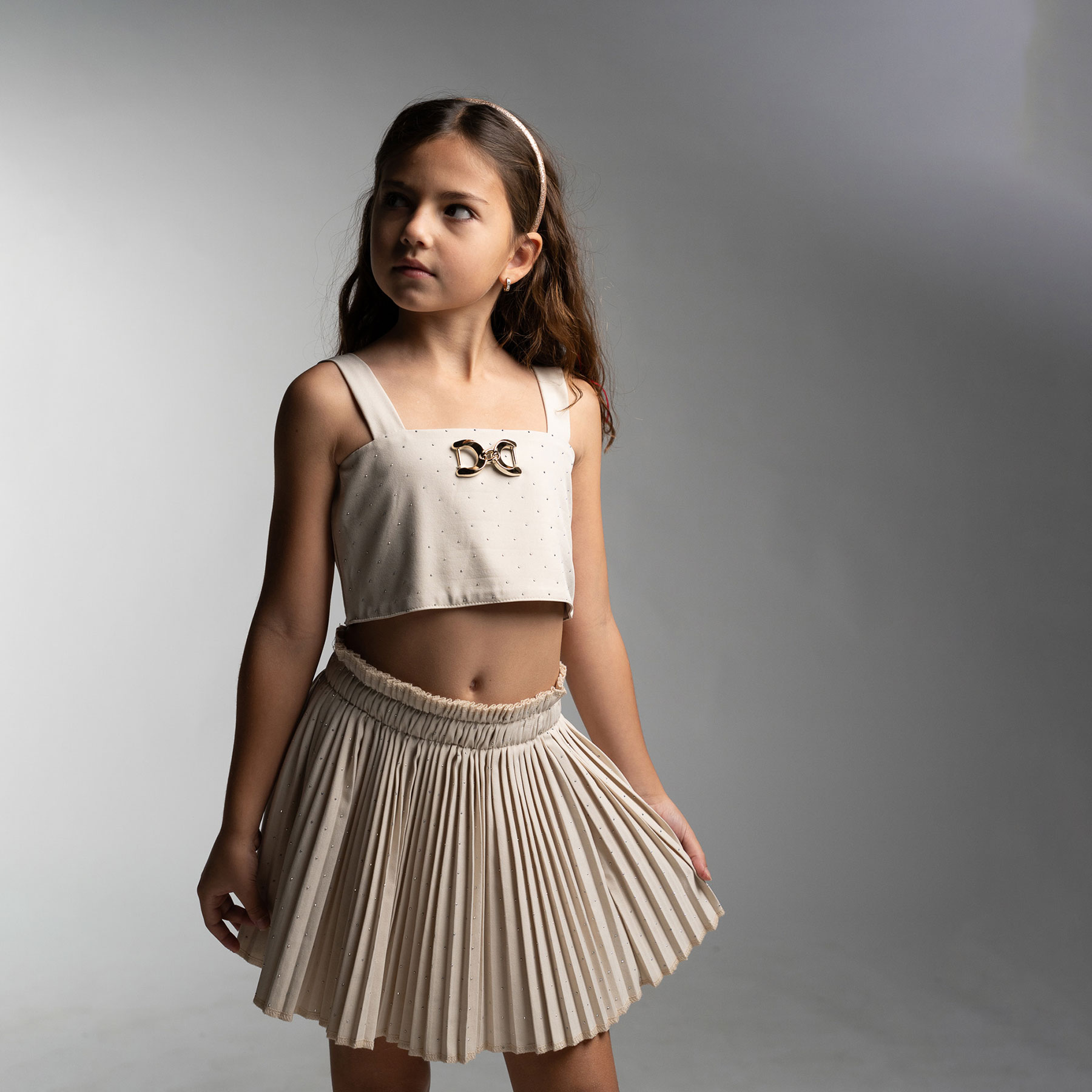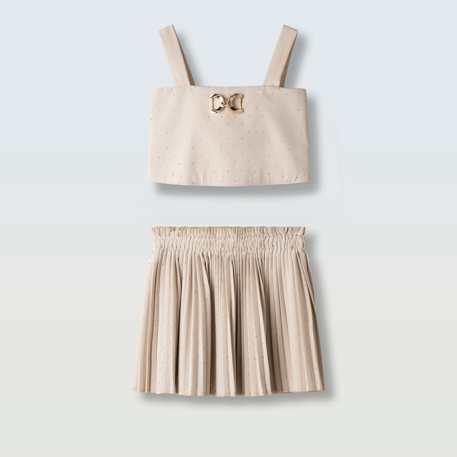 Κομψό, διαχρονικό και ιδιαίτερα elegant, το παιδικό σετ με φούστα για κορίτσια Ebita σε μπεζ απόχρωση είναι ιδανικό για ξεχωριστές καλοκαιρινές εμφανίσεις. Το σετ αποτελείται από μοντέρνο crop top με φαρδιές τιράντες και διακριτική μεταλλική διακόσμηση στο μπροστινό μέρος, που προσθέτει μία πινελιά λάμψης και κομψότητας.