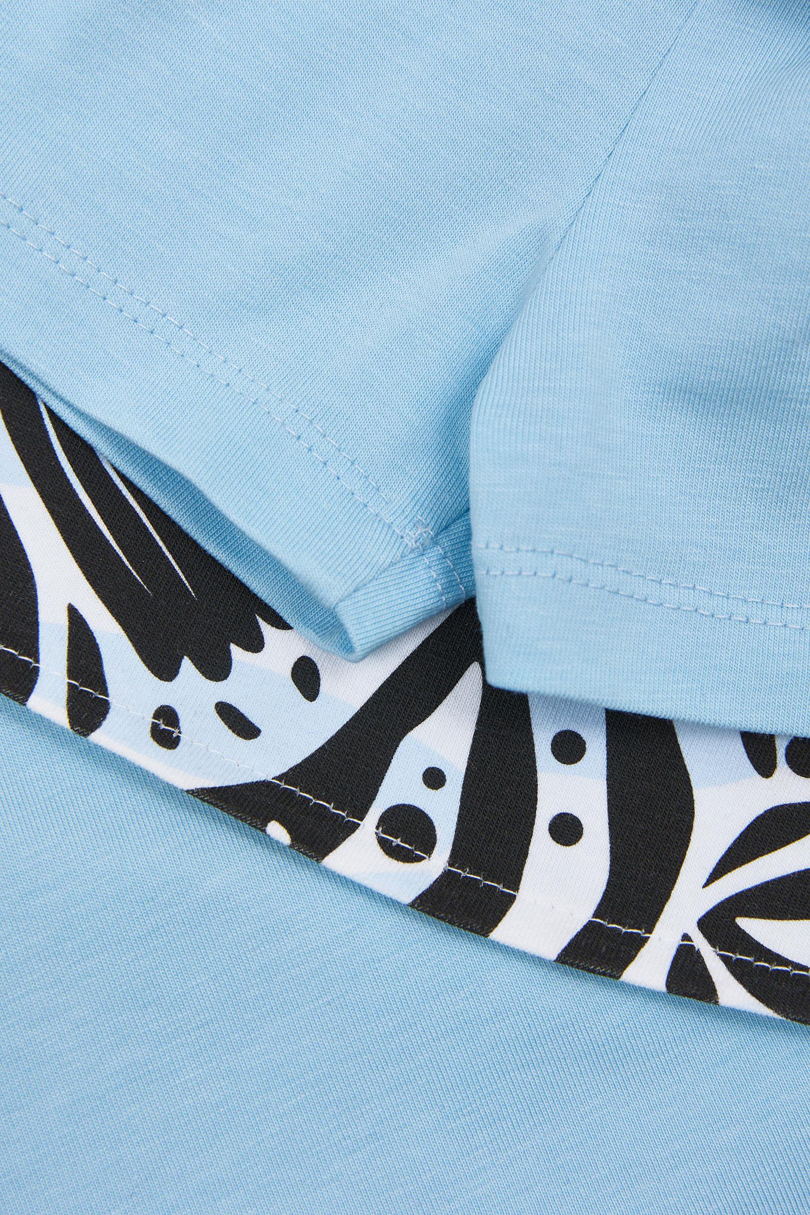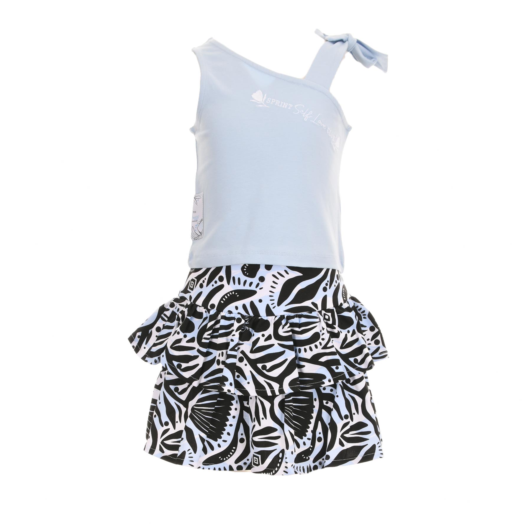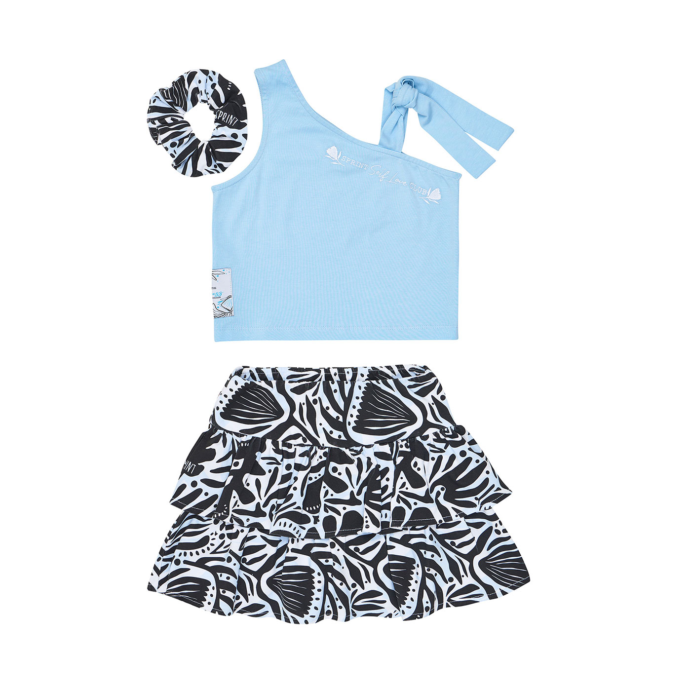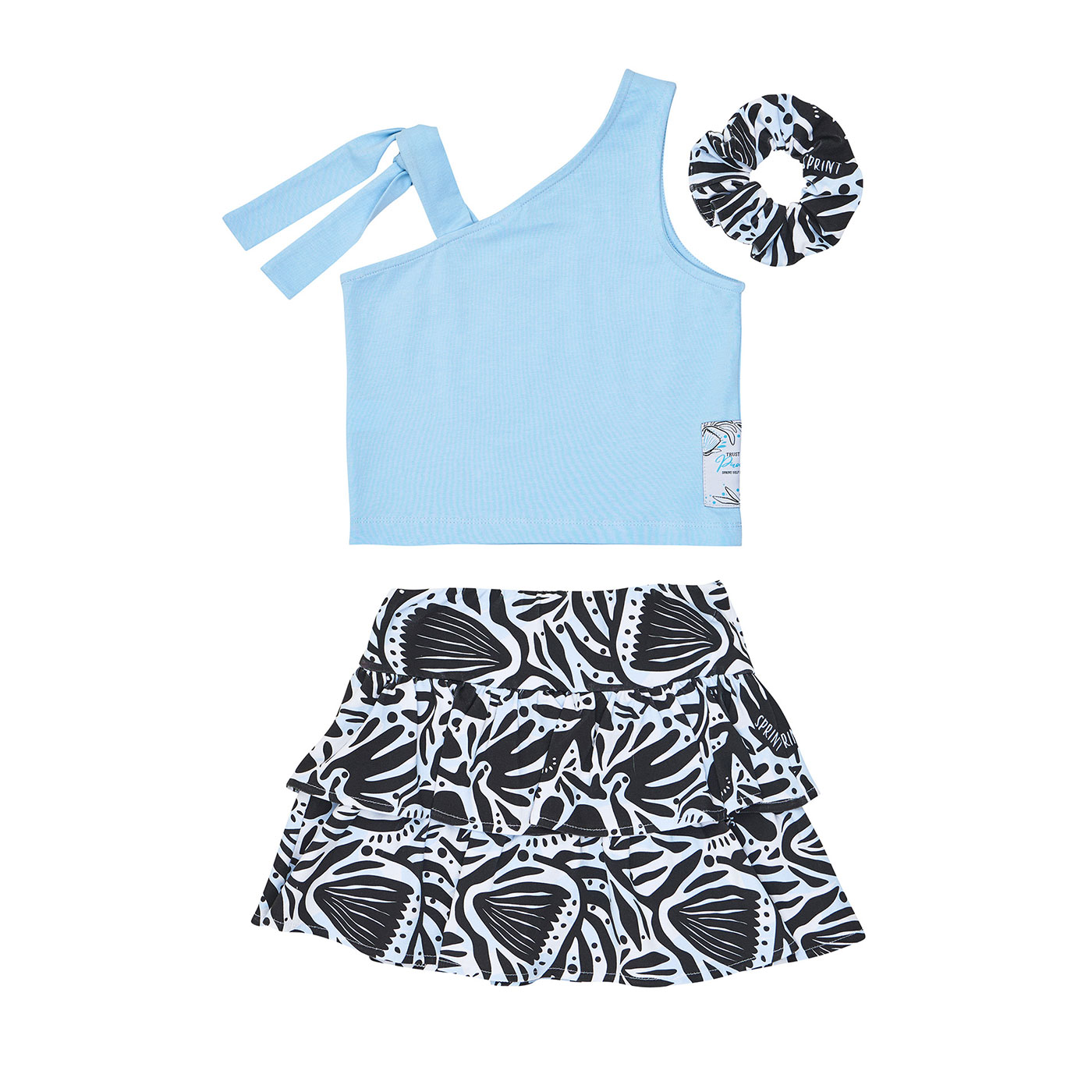 Παιδικό σετ Sprint 3 τεμαχίων για κορίτσια σε σιέλ απόχρωση με χαρούμενο print, ιδανικό για καλοκαιρινές εμφανίσεις γεμάτες άνεση και στυλ. Το σετ περιλαμβάνει μοντέρνο αμάνικο τοπ με έναν ώμο και διακοσμητικό φιόγκο, φούστα-σορτς (skort) με βολάν και tropical μοτίβα, καθώς και ασορτί scrunchie για ολοκληρωμένο look.
