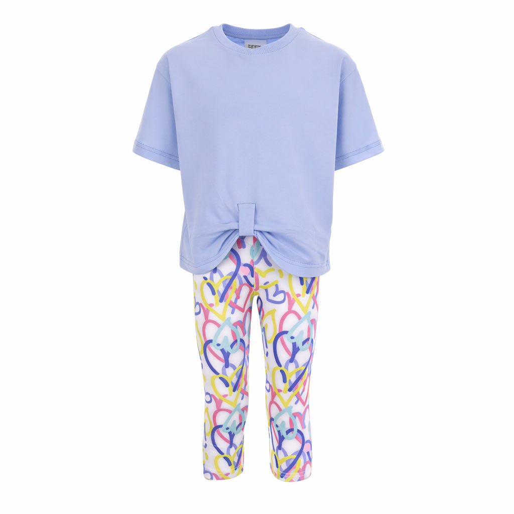 Η μπλούζα σε απαλή λιλά απόχρωση ξεχωρίζει για το μοντέρνο σχέδιο με διακριτική λεπτομέρεια στο κάτω μέρος που χαρίζει ιδιαίτερο στυλ και άνετη εφαρμογή. Το κάπρι κολάν με πολύχρωμο print γεμάτο καρδιές προσθέτει χαρούμενη διάθεση και ζωντάνια στο σύνολο, δημιουργώντας ένα playful look που αγαπούν τα κορίτσια.