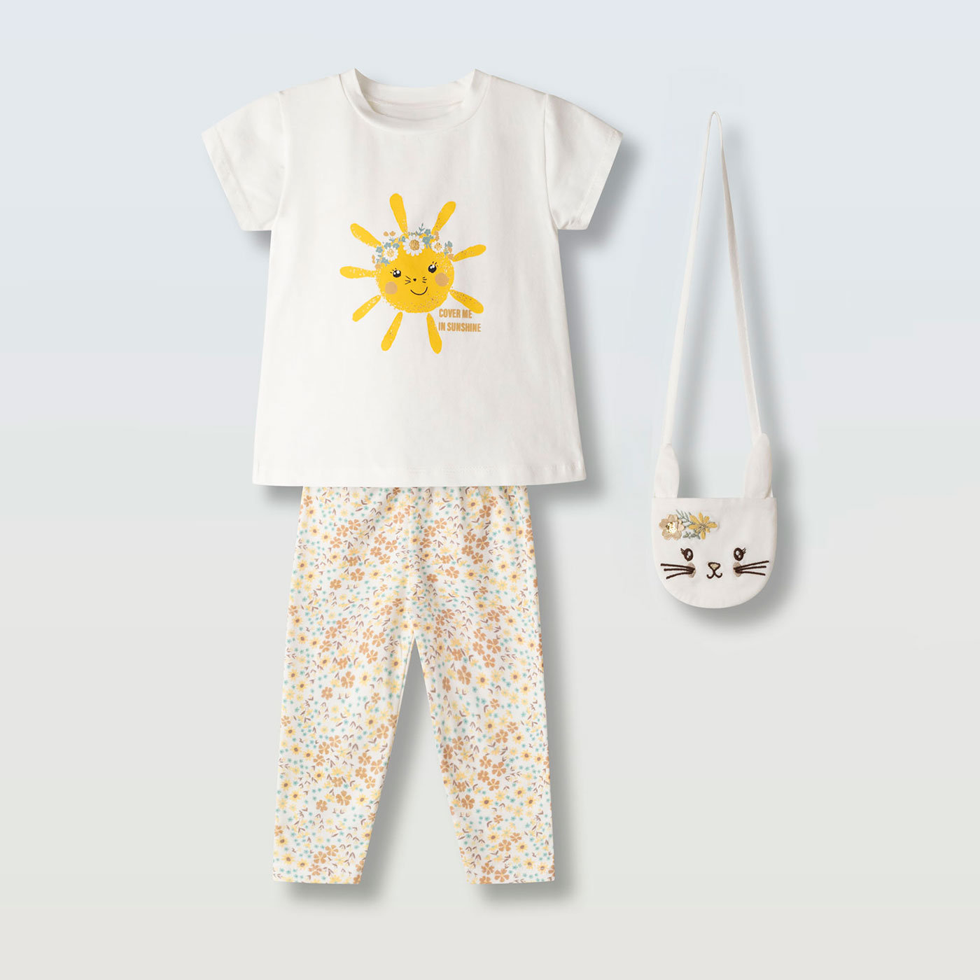 Χαρίστε στη μικρή σας ένα χαριτωμένο και πρακτικό σύνολο που συνδυάζει άνεση, ποιότητα και μοντέρνο design. Το παιδικό σετ Ebita 3τμχ περιλαμβάνει κοντομάνικη μπλούζα, κολάν 3/4 και ασορτί τσαντάκι, δημιουργώντας ένα ολοκληρωμένο outfit για κάθε καθημερινή ή πιο ιδιαίτερη περίσταση.Η μπλούζα σε απαλό λευκό χρώμα διαθέτει παιχνιδιάρικο τύπωμα με ήλιο και λουλουδάκια, προσφέροντας χαρούμενη, καλοκαιρινή διάθεση. Το κολάν 3/4 σε κίτρινο-λευκό φλοράλ μοτίβο εξασφαλίζει ελευθερία κινήσεων και άνετη εφαρμογή όλη μέρα. Το μικρό τσαντάκι με γλυκιά φατσούλα και λουλουδάκι συμπληρώνει τέλεια το σύνολο και ξετρελαίνει τα κορίτσια.Κατασκευασμένο από μαλακά, φιλικά προς το παιδικό δέρμα υφάσματα, το σετ είναι ιδανικό για βόλτες, παιχνίδι, διακοπές και καλοκαιρινές εξόδους.