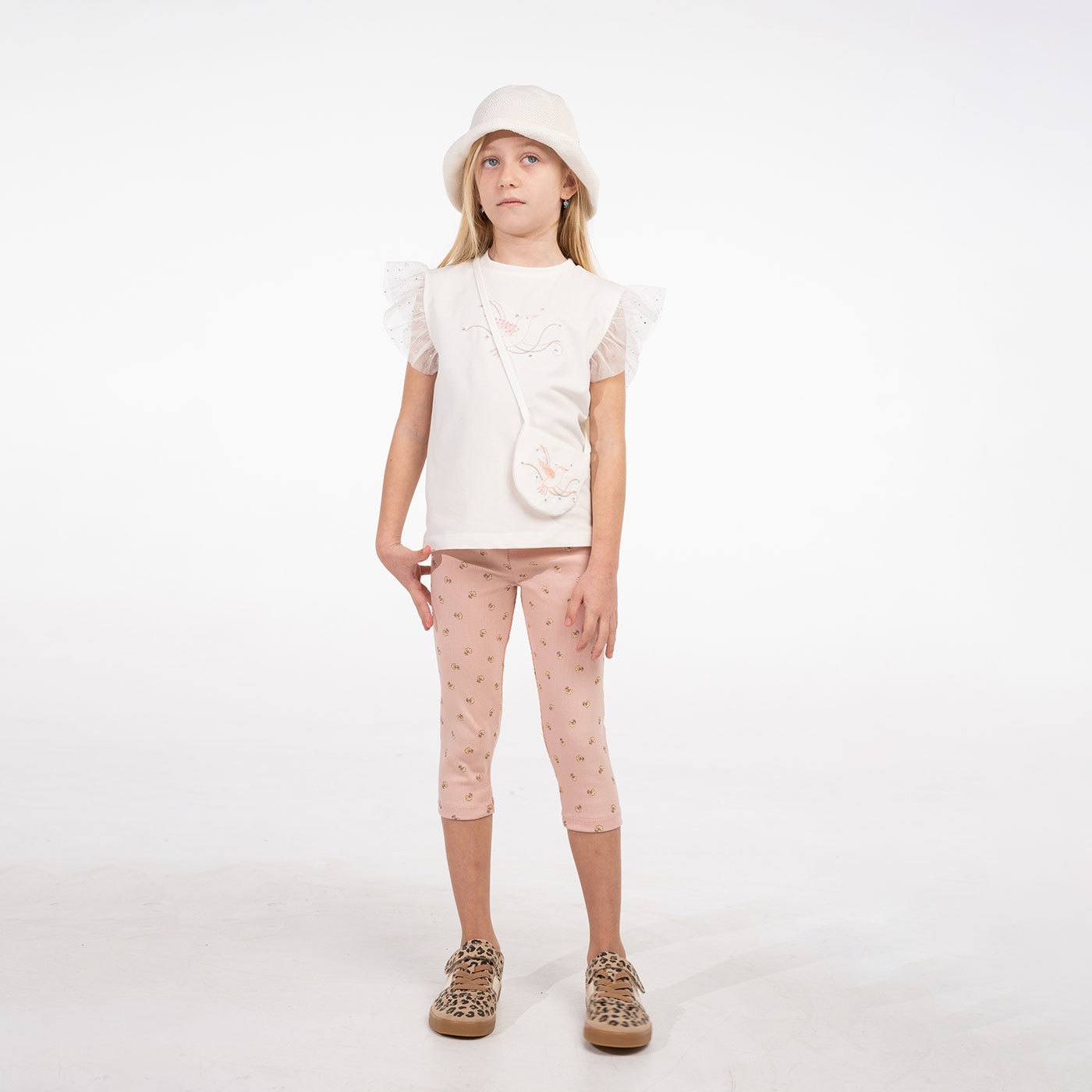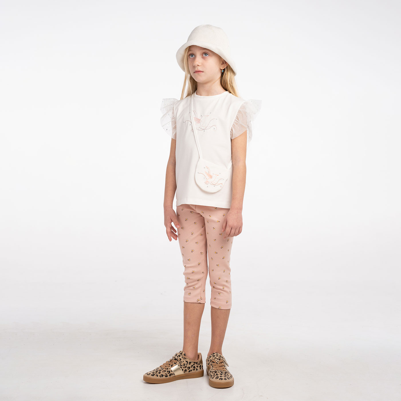 Ένα κομψό και ρομαντικό παιδικό σετ 3 τεμαχίων από την Ebita, σχεδιασμένο για μικρές κυρίες που αγαπούν το άνετο αλλά και στιλάτο ντύσιμο. Το σετ περιλαμβάνει μπλούζα, κολάν 3/4 και ασορτί τσαντάκι, δημιουργώντας ένα ολοκληρωμένο outfit για καθημερινές αλλά και πιο ιδιαίτερες εμφανίσεις.Η λευκή μπλούζα ξεχωρίζει με το διακριτικό σχέδιο πουλιού στο στήθος και τα εντυπωσιακά μανίκια με διαφάνεια και διακριτικές λάμψεις, προσθέτοντας μια elegant πινελιά. Το σομόν κολάν 3/4 με μικρά φλοράλ μοτίβα προσφέρει άνεση και ελευθερία κινήσεων, ιδανικό για παιχνίδι και βόλτες. Το χαριτωμένο τσαντάκι με ίδιο σχέδιο ολοκληρώνει αρμονικά το σύνολο.Κατασκευασμένο από μαλακά, ποιοτικά υφάσματα που σέβονται το παιδικό δέρμα, αυτό το σετ είναι ιδανικό για άνοιξη και καλοκαίρι.
