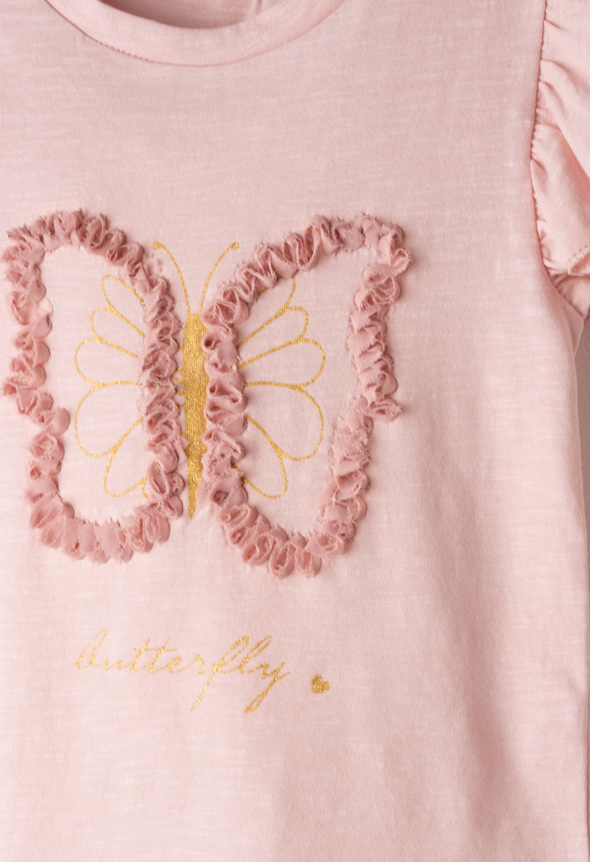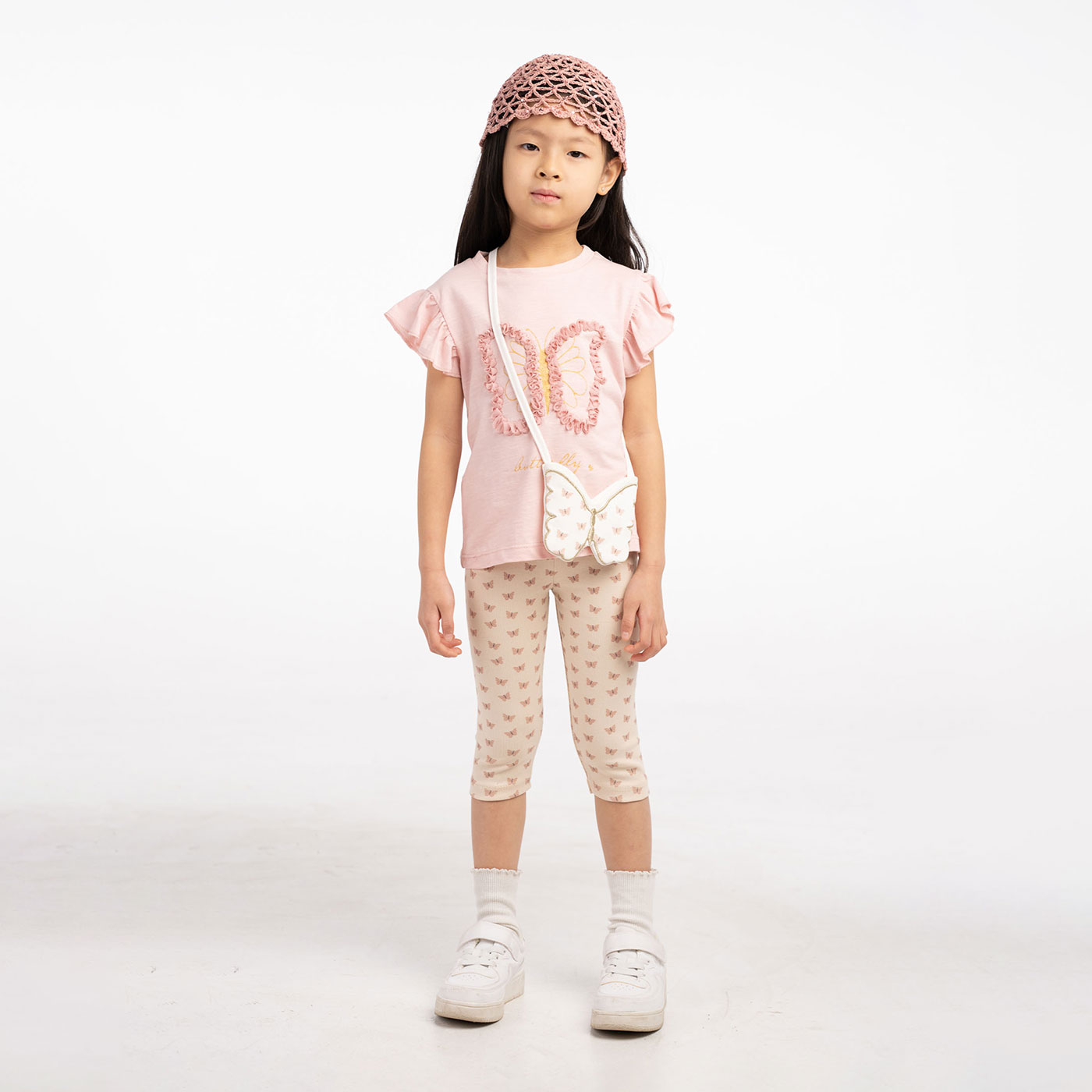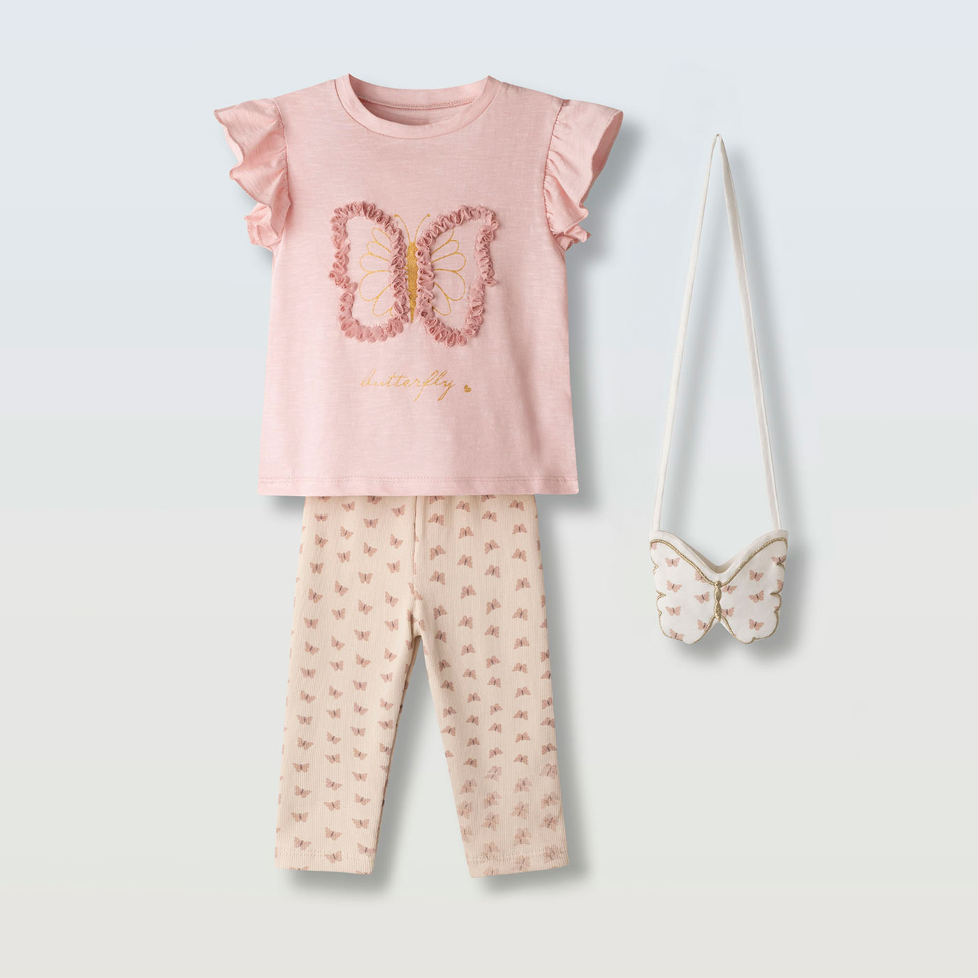 Το παιδικό σετ Ebita 3 τεμαχίων σε ροζ και μπεζ είναι μια ρομαντική και κομψή επιλογή για καθημερινές αλλά και πιο προσεγμένες εμφανίσεις. Ο συνδυασμός της ροζ μπλούζας με το μπεζ κολάν και το ασορτί τσαντάκι δημιουργεί ένα ολοκληρωμένο girly σύνολο με ιδιαίτερες λεπτομέρειες.Η κοντομάνικη μπλούζα με βολάν στα μανίκια ξεχωρίζει για το εντυπωσιακό σχέδιο πεταλούδας με ανάγλυφες ροζ λεπτομέρειες στο μπροστινό μέρος, προσθέτοντας ρομαντικό χαρακτήρα και παιχνιδιάρικη διάθεση. Το απαλό ύφασμα προσφέρει άνεση και σωστή εφαρμογή καθ όλη τη διάρκεια της ημέρας.Το κολάν 3/4 σε μπεζ απόχρωση με μικρό μοτίβο πεταλούδας διαθέτει ελαστική μέση για σταθερή και άνετη εφαρμογή, επιτρέποντας ελευθερία κινήσεων στο παιχνίδι και στις δραστηριότητες. Το σετ ολοκληρώνεται με τσαντάκι ώμου σε σχήμα πεταλούδας, που προσθέτει μοναδικό στυλ και πρακτικότητα.