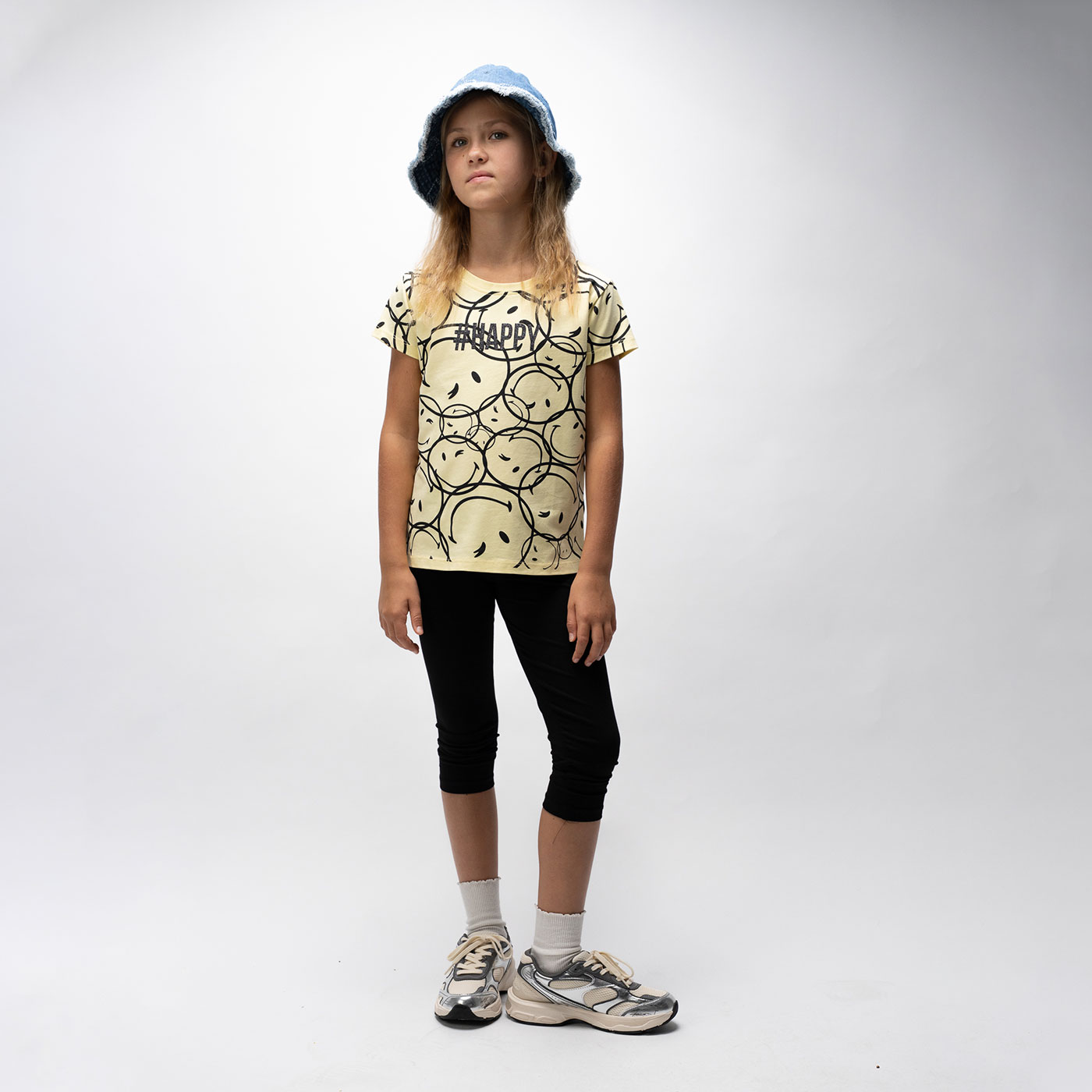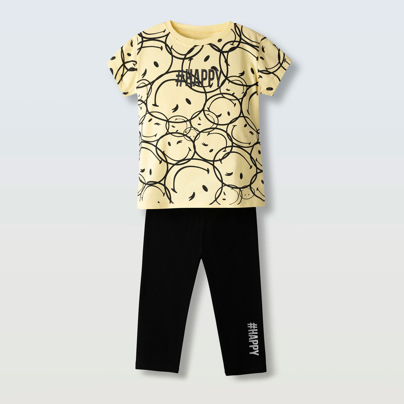 Μοντέρνο παιδικό σετ για κορίτσια Ebita σε κίτρινο-μαύρο συνδυασμό, που αποτελείται από κοντομάνικο μπλουζάκι και κάπρι κολάν. Το μπλουζάκι ξεχωρίζει με all-over print χαρούμενα smiley σχέδια και μήνυμα #HAPPY, προσθέτοντας fun και θετική διάθεση σε κάθε εμφάνιση.Το μαλακό βαμβακερό ύφασμα προσφέρει άνεση και διαπνοή, ιδανικό για πολύωρη χρήση. Το κάπρι κολάν με ελαστική μέση εφαρμόζει σταθερά χωρίς να πιέζει, καθιστώντας το σετ τέλεια επιλογή για σχολείο, βόλτες και καλοκαιρινές δραστηριότητες.