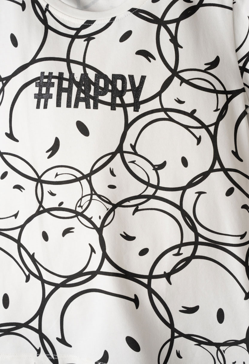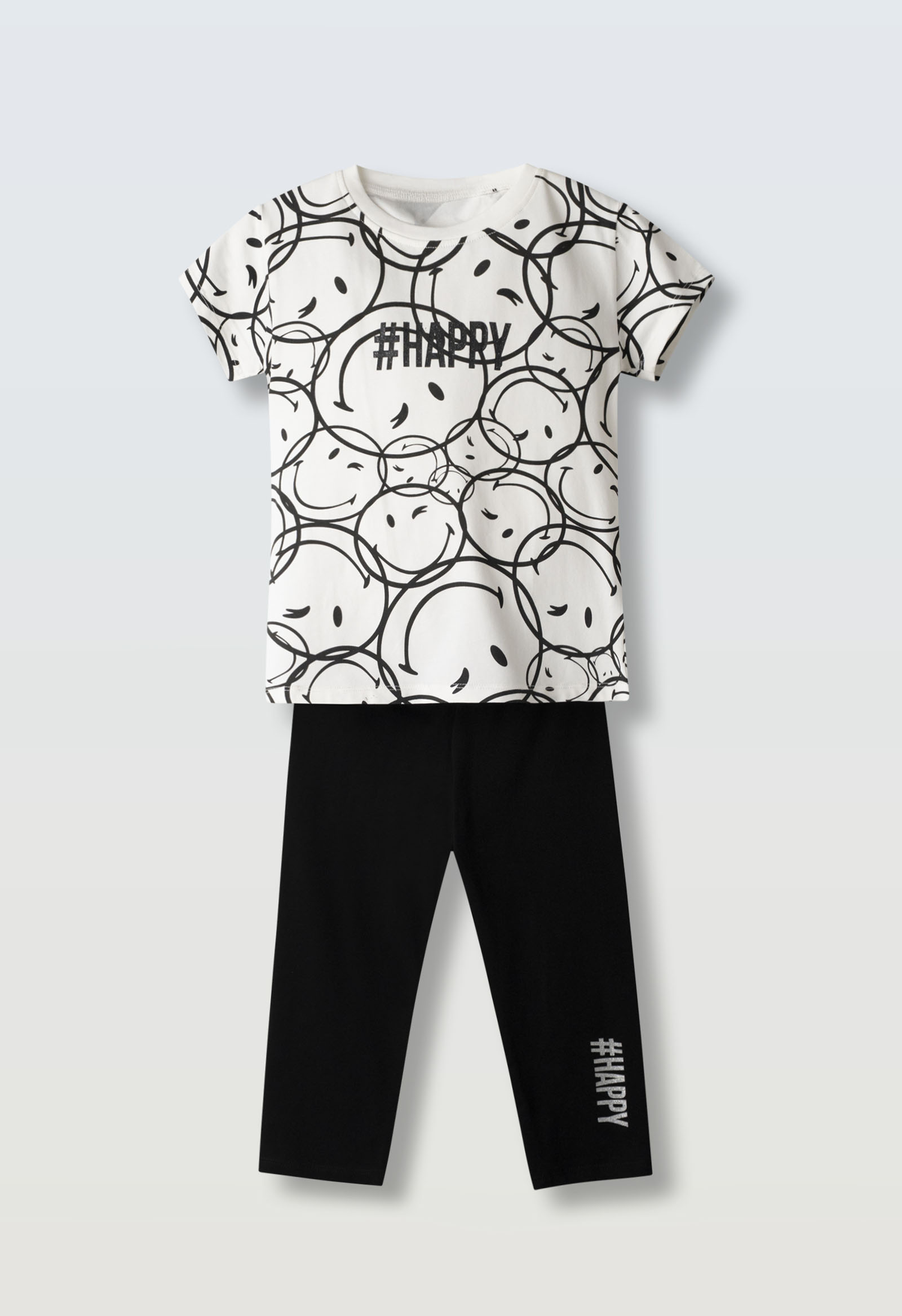 Μοντέρνο παιδικό σετ για κορίτσια Ebita σε λευκό-μαύρο συνδυασμό, που αποτελείται από κοντομάνικο μπλουζάκι και κάπρι κολάν. Το μπλουζάκι ξεχωρίζει με all-over print χαρούμενα smiley σχέδια και μήνυμα #HAPPY, προσθέτοντας fun και θετική διάθεση σε κάθε εμφάνιση.Το μαλακό βαμβακερό ύφασμα προσφέρει άνεση και διαπνοή, ιδανικό για πολύωρη χρήση. Το κάπρι κολάν με ελαστική μέση εφαρμόζει σταθερά χωρίς να πιέζει, καθιστώντας το σετ τέλεια επιλογή για σχολείο, βόλτες και καλοκαιρινές δραστηριότητες.