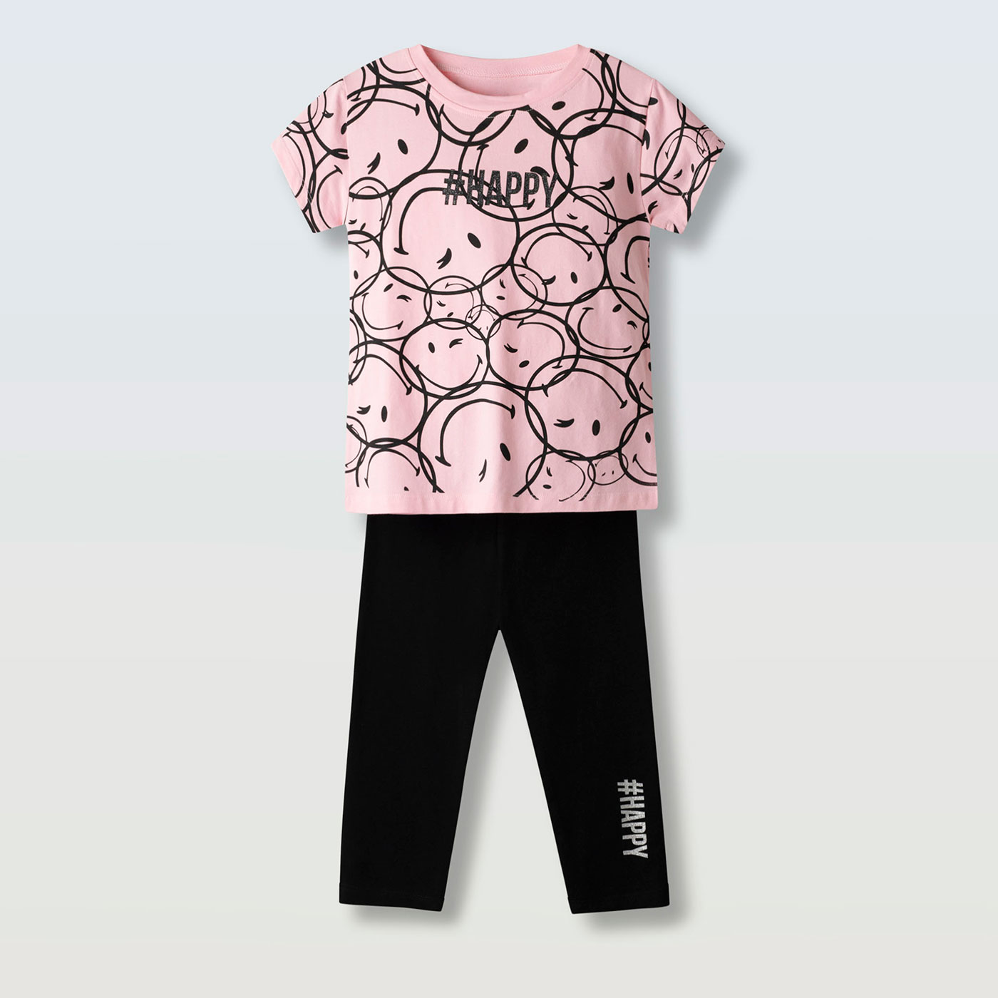 Μοντέρνο παιδικό σετ για κορίτσια Ebita σε ροζ-μαύρο συνδυασμό, που αποτελείται από κοντομάνικο μπλουζάκι και κάπρι κολάν. Το μπλουζάκι ξεχωρίζει με all-over print χαρούμενα smiley σχέδια και μήνυμα #HAPPY, προσθέτοντας fun και θετική διάθεση σε κάθε εμφάνιση.Το μαλακό βαμβακερό ύφασμα προσφέρει άνεση και διαπνοή, ιδανικό για πολύωρη χρήση. Το κάπρι κολάν με ελαστική μέση εφαρμόζει σταθερά χωρίς να πιέζει, καθιστώντας το σετ τέλεια επιλογή για σχολείο, βόλτες και καλοκαιρινές δραστηριότητες.