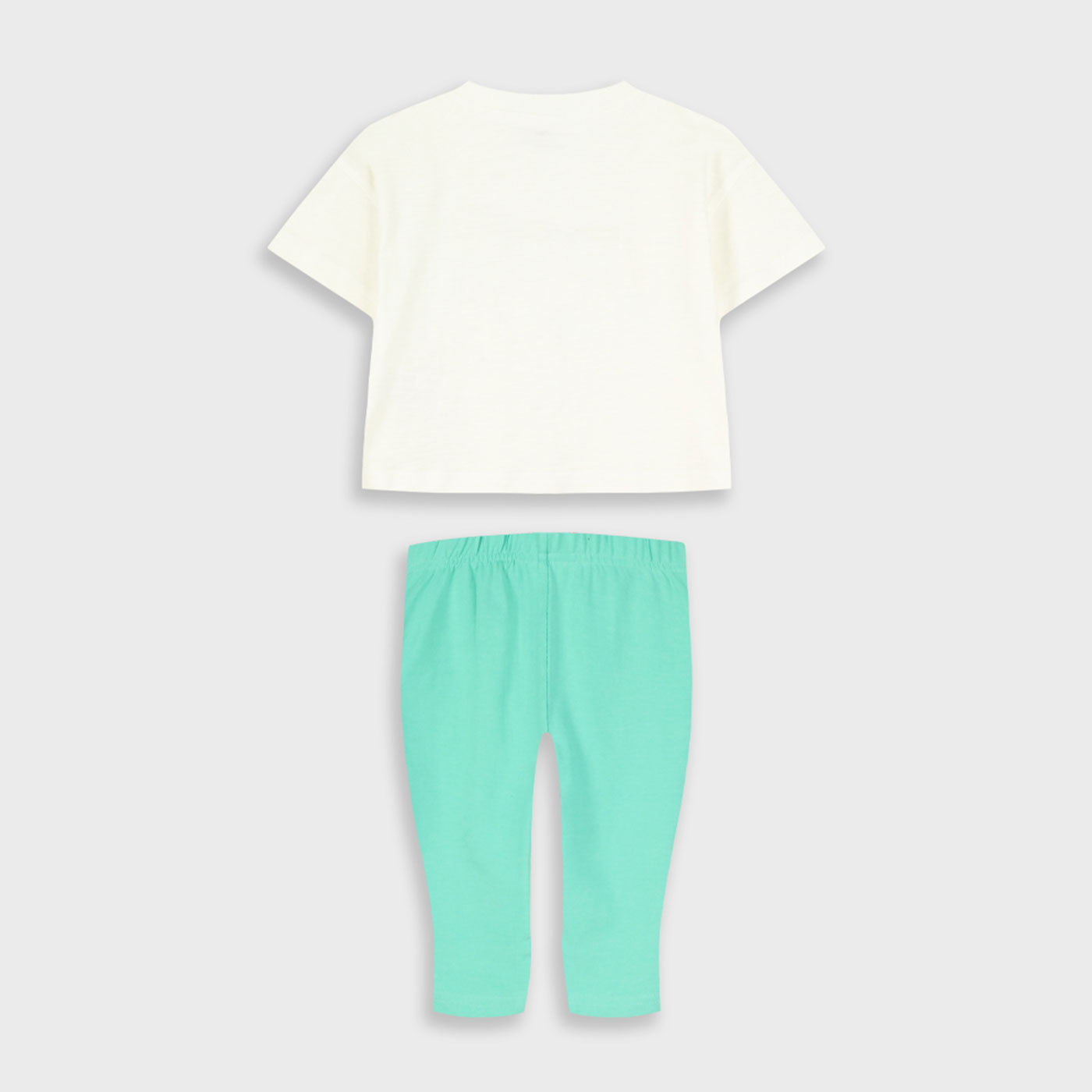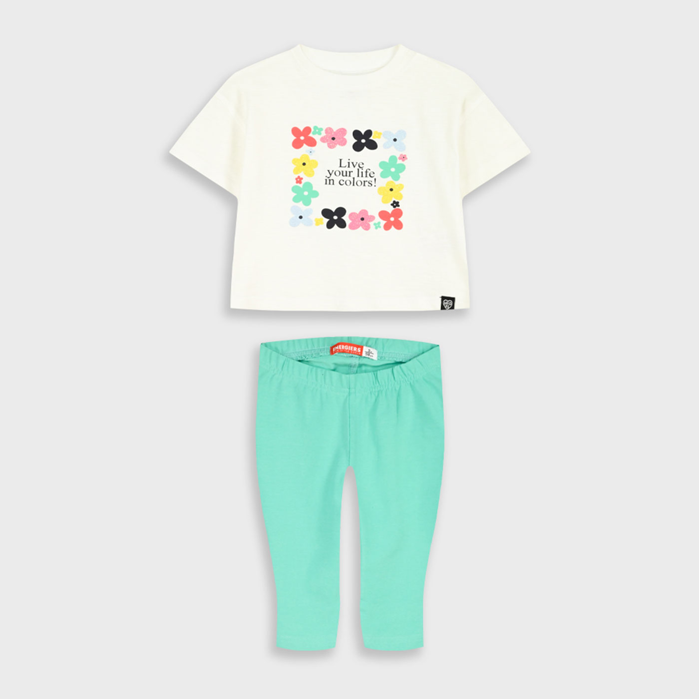 Ανανεώστε τη γκαρνταρόμπα με το παιδικό σετ με κολάν κάπρι για κορίτσια Energiers σε λευκό και μέντα απόχρωση, μια φωτεινή και κομψή επιλογή για τις ανοιξιάτικες και καλοκαιρινές εμφανίσεις. Η λευκή κοντομάνικη μπλούζα διακοσμείται με χαρούμενο floral τύπωμα και το μήνυμα Live your life in colors!, προσθέτοντας θετική ενέργεια και παιχνιδιάρικο χαρακτήρα στο σύνολο. Το μέντα κάπρι κολάν προσφέρει άνετη εφαρμογή χάρη στην ελαστική μέση και την απαλή, ελαστική σύνθεσή του, εξασφαλίζοντας ελευθερία κινήσεων σε κάθε δραστηριότητα. Κατασκευασμένο από ποιοτικό βαμβακερό ύφασμα που επιτρέπει στο δέρμα να αναπνέει, το σετ προσφέρει άνεση και αντοχή στην καθημερινή χρήση. Το παιδικό σετ Energiers λευκό-μέντα αποτελεί ιδανική επιλογή για σχολείο, βόλτες και παιχνίδι, συνδυάζοντας girly αισθητική, πρακτικότητα και καλοκαιρινή φρεσκάδα σε κάθε εμφάνιση.