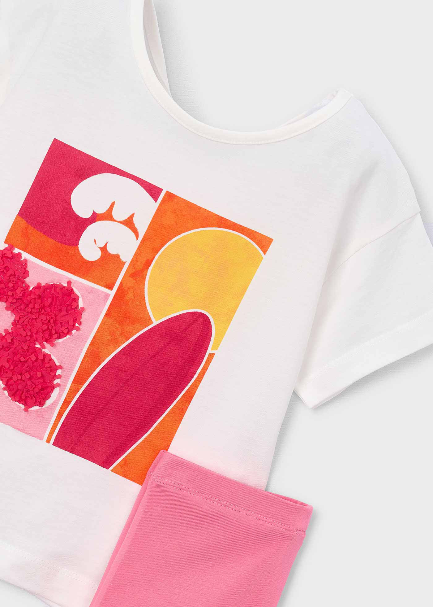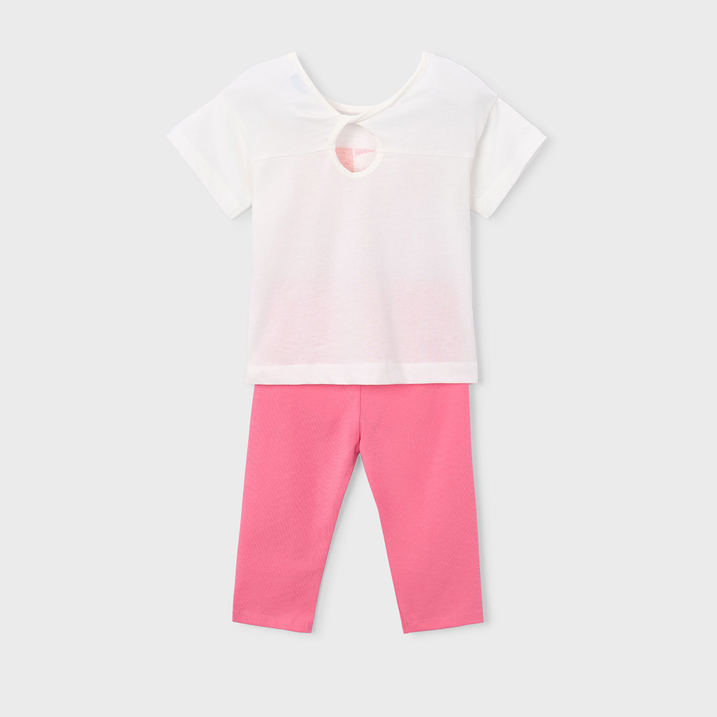 Το παιδικό σετ Mayoral για κορίτσια σε κομψό συνδυασμό λευκού και φούξια αποτελεί ιδανική επιλογή για άνετες και στιλάτες καλοκαιρινές εμφανίσεις. Το σετ περιλαμβάνει κοντομάνικη μπλούζα με μοντέρνο, πολύχρωμο print στο μπροστινό μέρος και κολάν κάπρι σε απαλή φούξια απόχρωση.Η μπλούζα διαθέτει χαλαρή γραμμή και ιδιαίτερη λεπτομέρεια ανοίγματος στο πίσω μέρος, προσθέτοντας μια μοντέρνα πινελιά, ενώ το βαμβακερό ύφασμα χαρίζει δροσερή αίσθηση. Το κάπρι κολάν είναι ελαστικό, εφαρμόζει άνετα και επιτρέπει ελευθερία κινήσεων, ιδανικό για παιχνίδι και καθημερινές δραστηριότητες.Ένα ολοκληρωμένο σύνολο που συνδυάζει άνεση, ποιότητα και σύγχρονο design, με την υπογραφή της Mayoral.